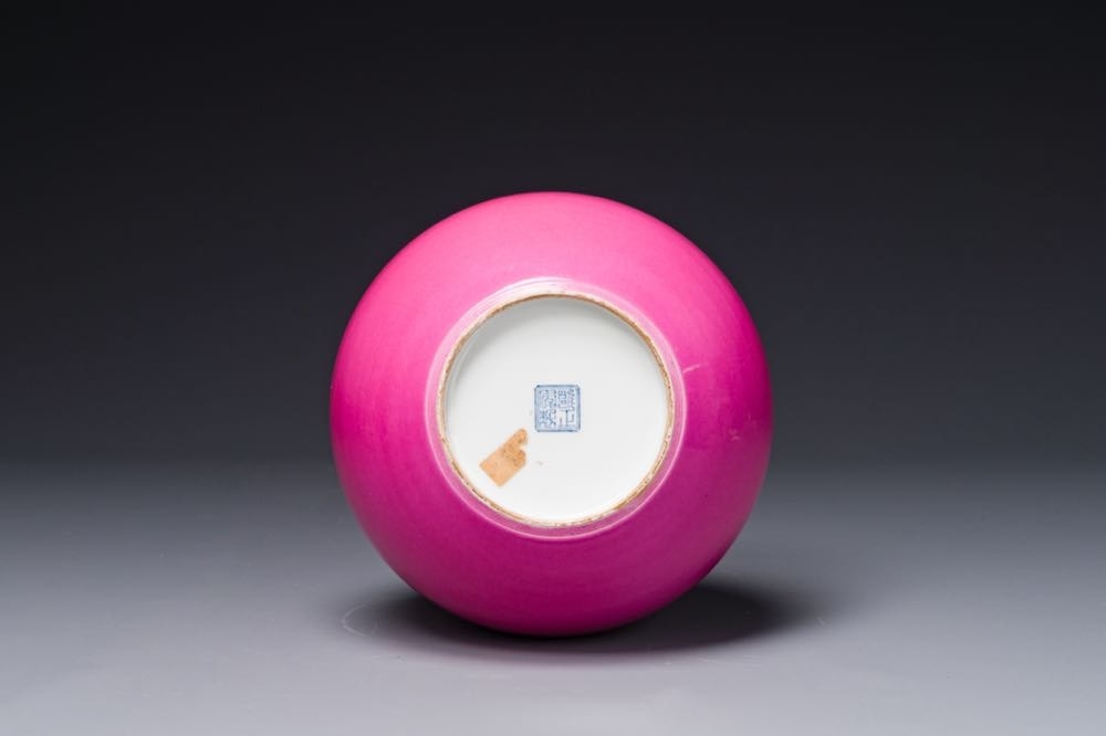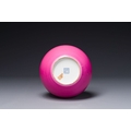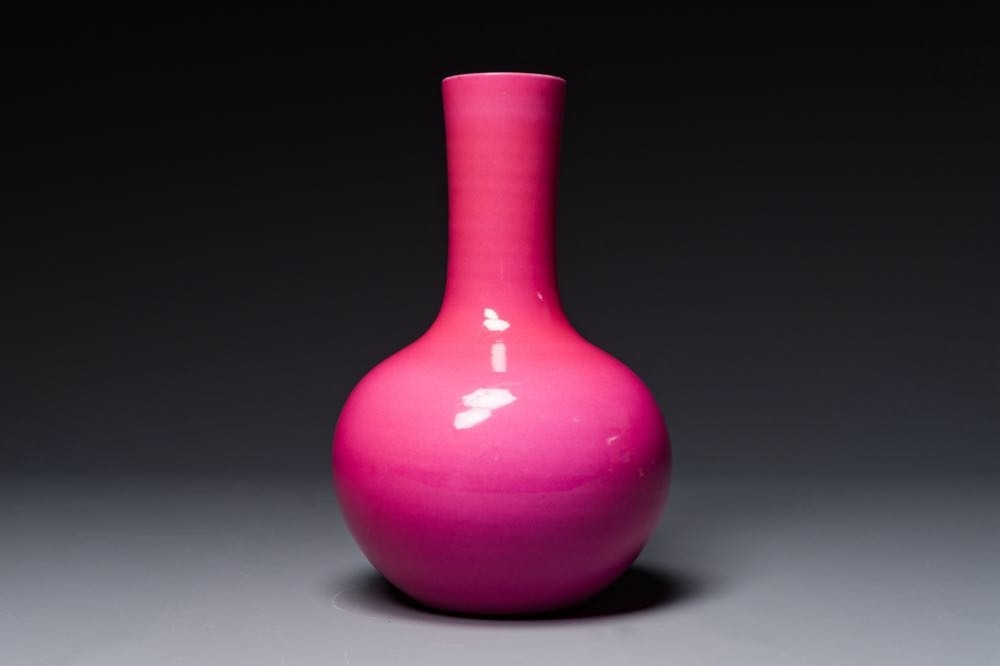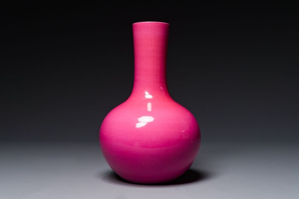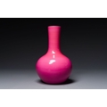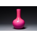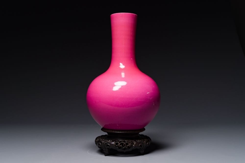 A Chinese monochrome ruby-pink-glazed 'tianqiuping' vase on wooden stand, Yongzheng mark, 19/20th C.