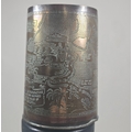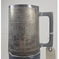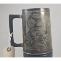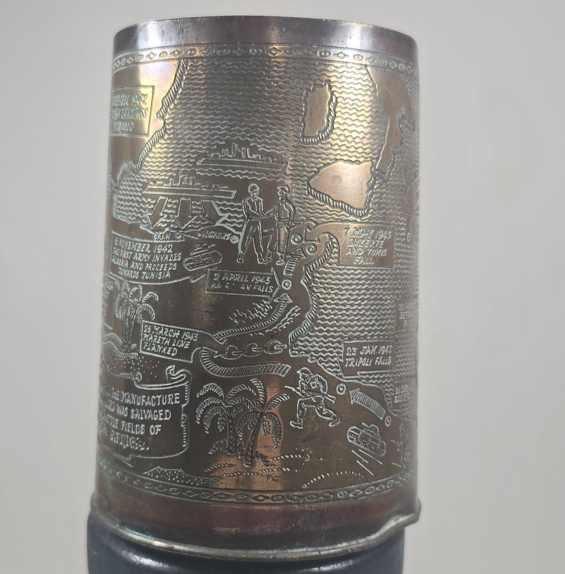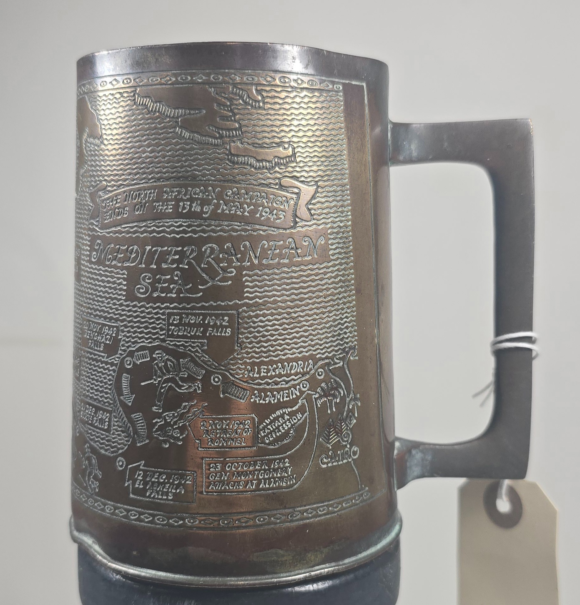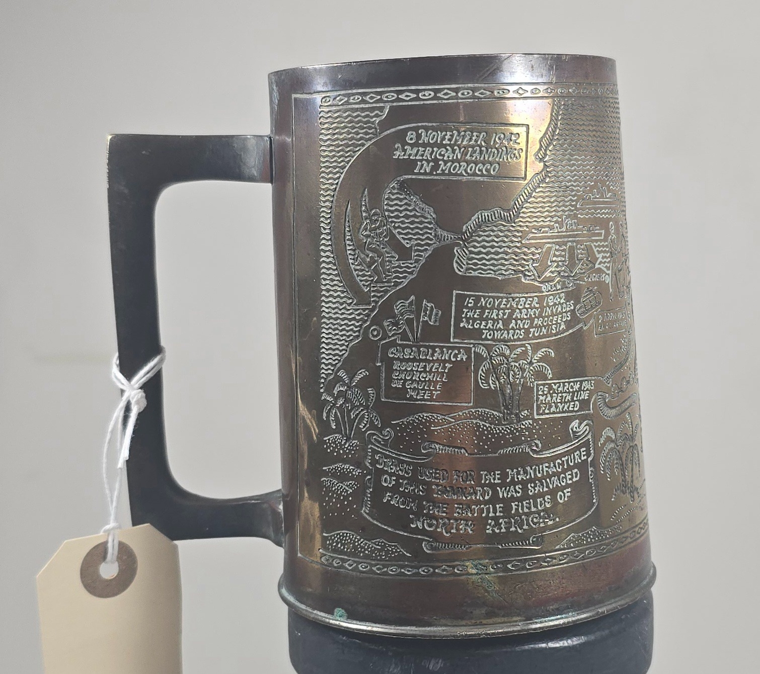 A brass tankard of approximately 1 pint capacity (not tested)12cms tall, roll engraved with illustrated and annotated scenes from the North African Campaign including the legend BRASS USED FOR THE MANUFACTURE OF THIS TANKRD WAS SALVAGED FROM THE BATTLE FIELDS OF NORTH AFRICA. Good condition, slightly dented.