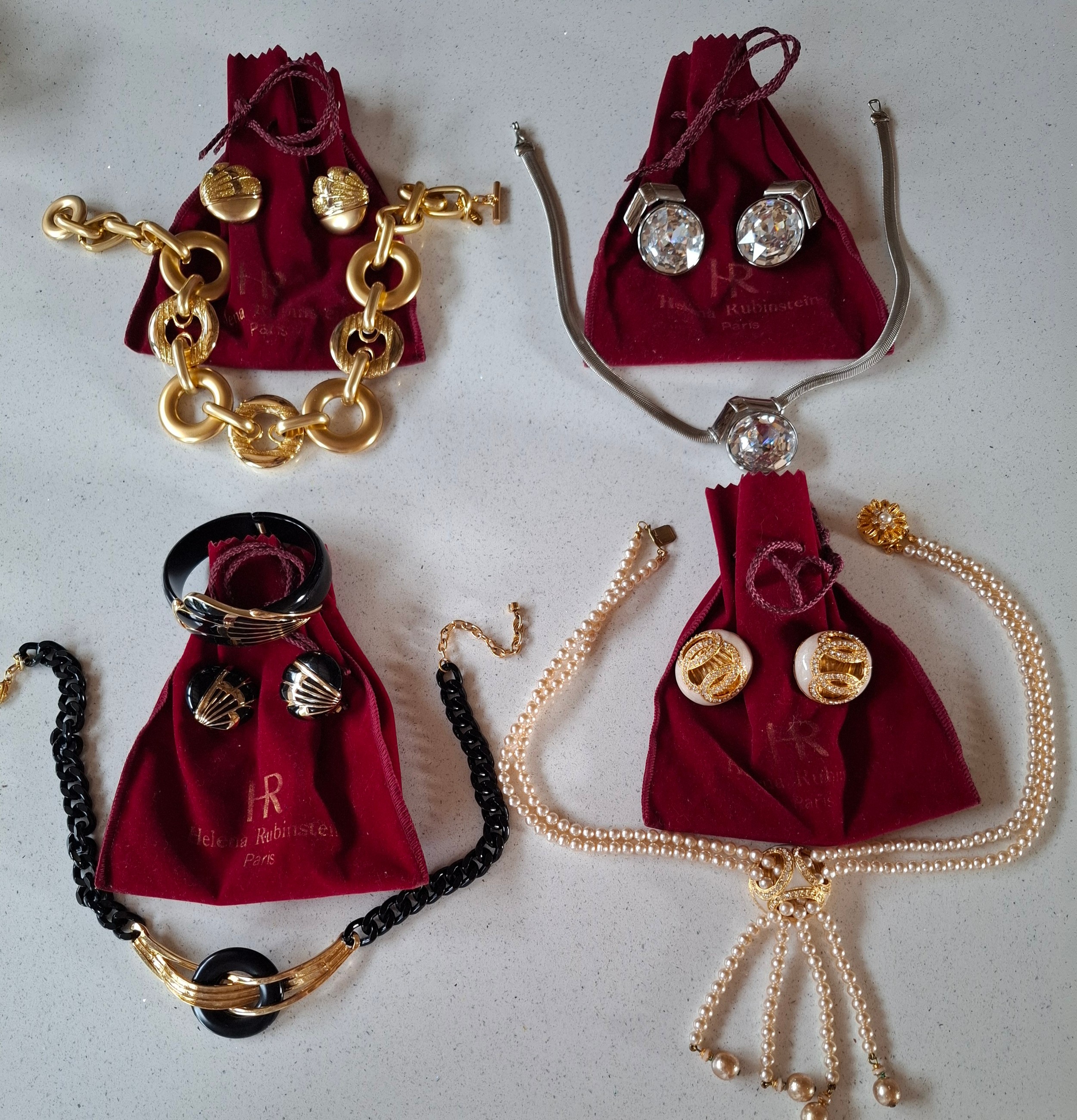 Helena Rubenstein- A collection of four 1980's costume jewellery suites, all stamped HR having 4 branded maroon jewellery pouches. Location:CAB
