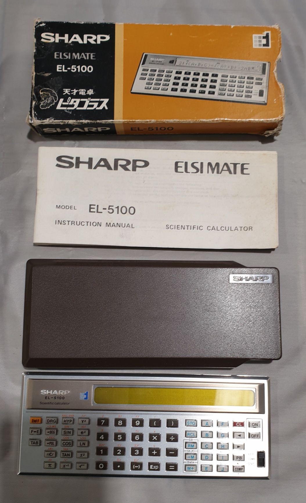 A vintage Sharp Elsimate EL-5100 scientific calculator with original box and instructions.