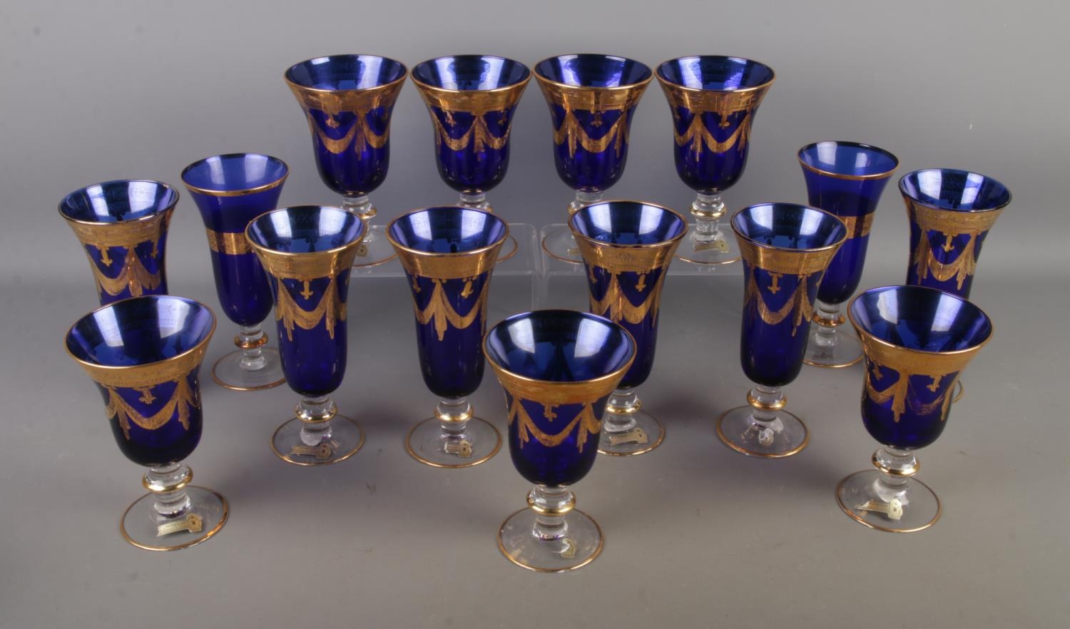 A good collection of Italian Interglass of Florence Medici glasses in blue featuring gilt decoration. Approx. 15 glasses.