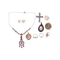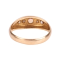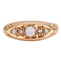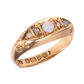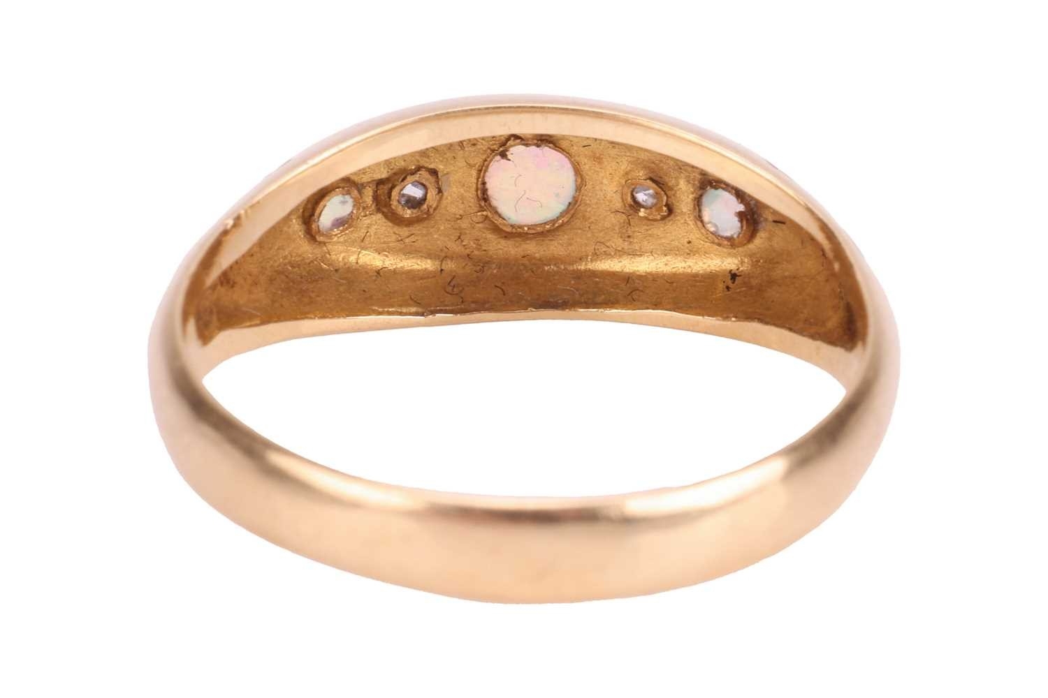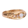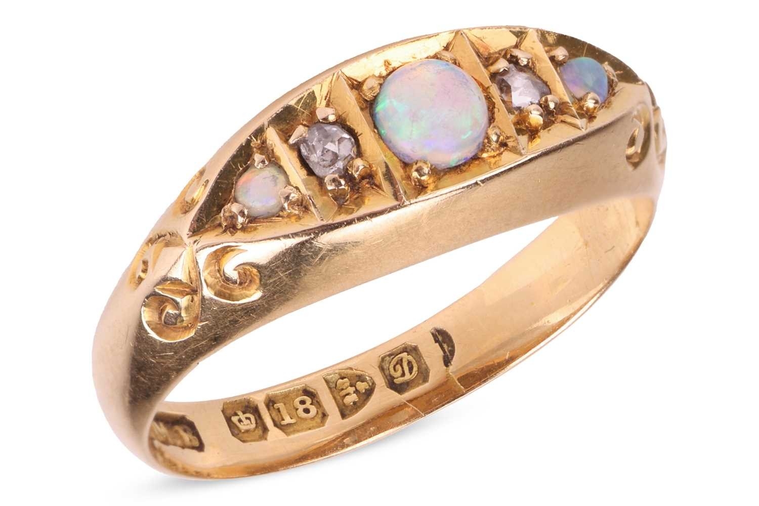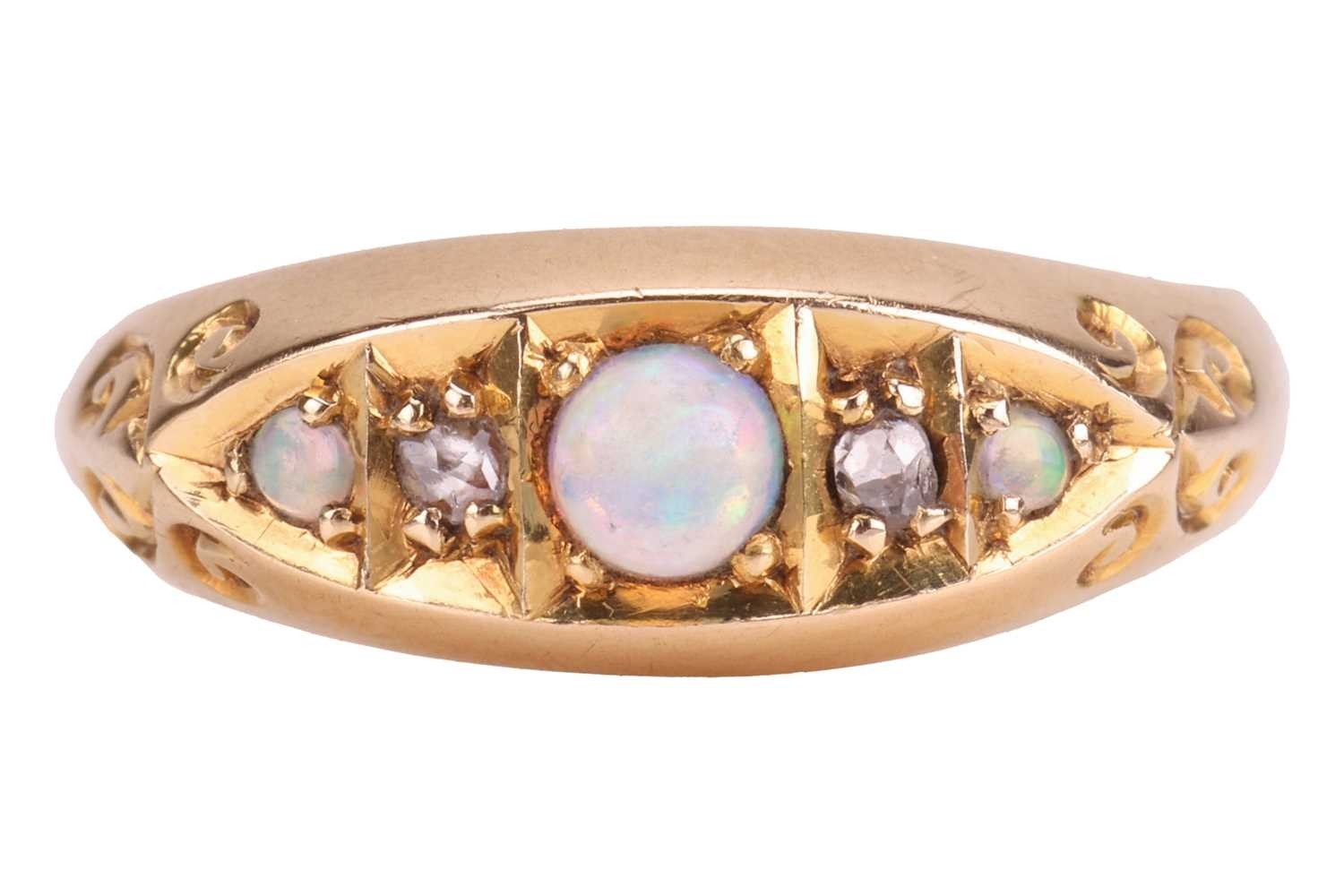 An Edwardian opal and diamond-set half hoop ring, featuring a central opal cabochon, flanked by two smaller opal cabochons and two rose-cut diamonds, in an 18ct yellow gold mount, the shoulders with scroll detailing, hallmarked Chester 1904, size M; 2.57 grams.