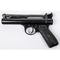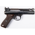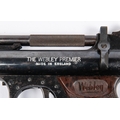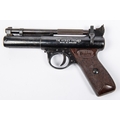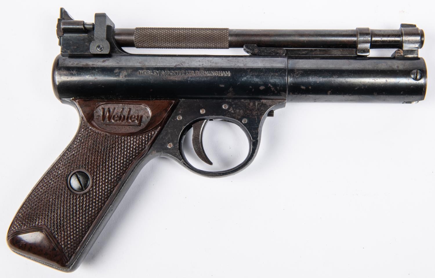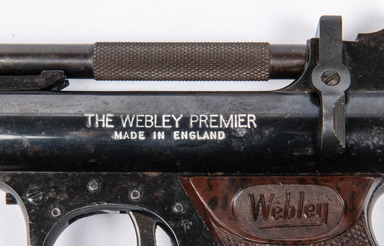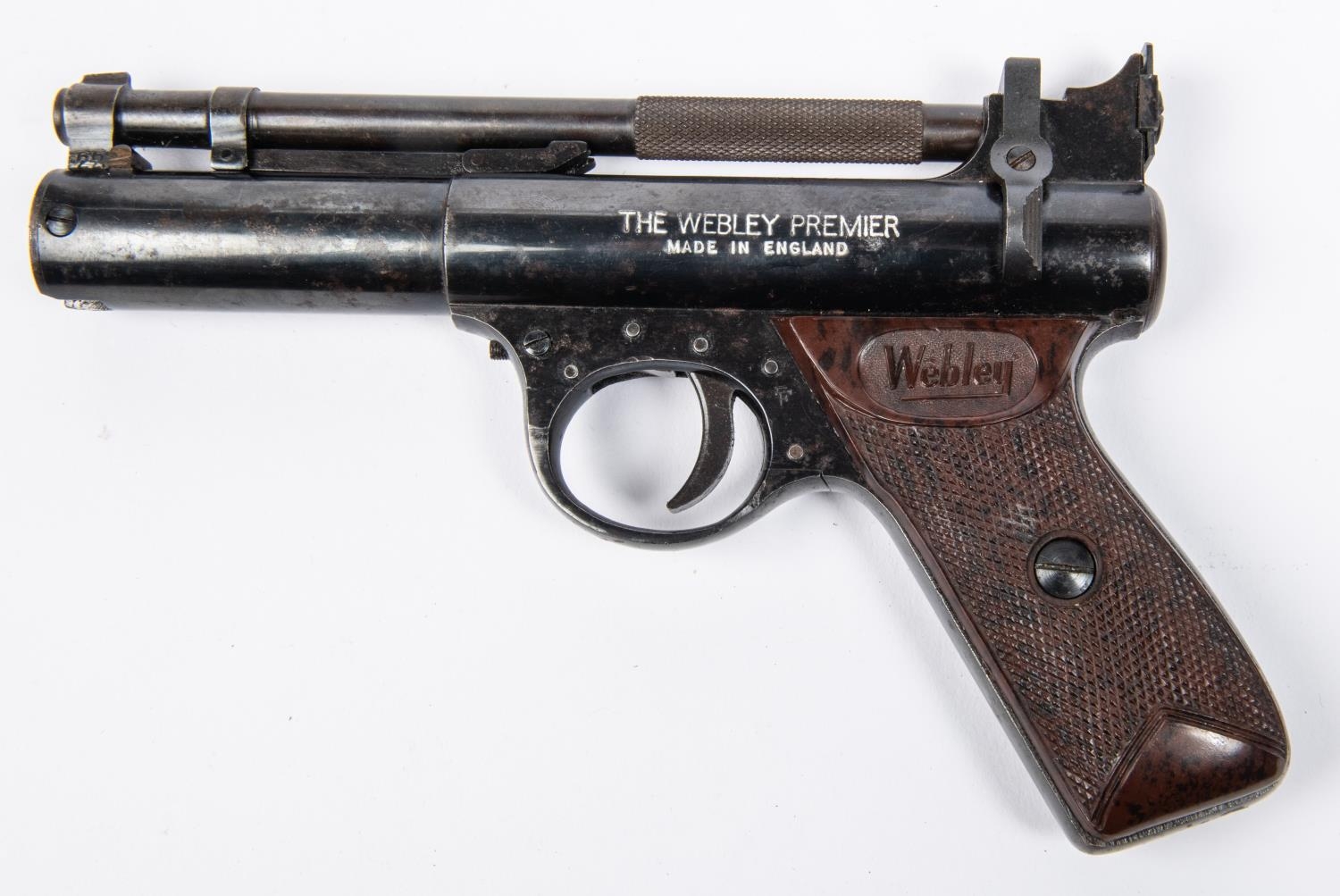 A .22" Webley Premier "E" series air pistol, number 680, small "E" with serifs, with blued metal finish and brown grips. GWO & C, minor wear and marks to finish. Purchasers please note: any air gun manufactured after 1939 must either be collected from our premises or posted to an RFD for face to face transaction. £60-100