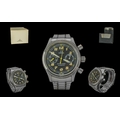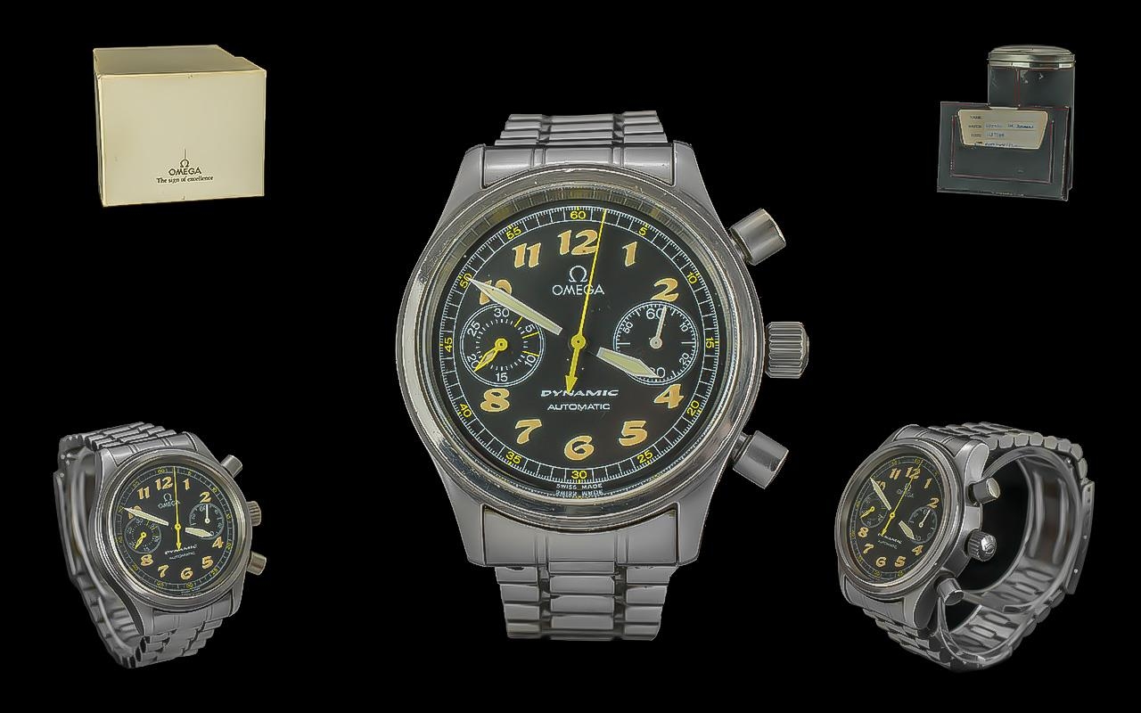 Omega Dynamic Gents Steel Automatic Chronograph Wrist Watch, Ref.no. 9EZ020, features black dial, yellow markers and extra links; date of purchase 16 - 7 - 99, with Omega Dynamic box, operating instruction booklet plus papers, booklet and wallet; dial, case and bracelet in good condition, in working order