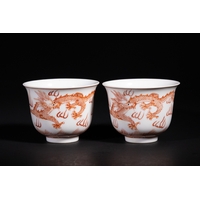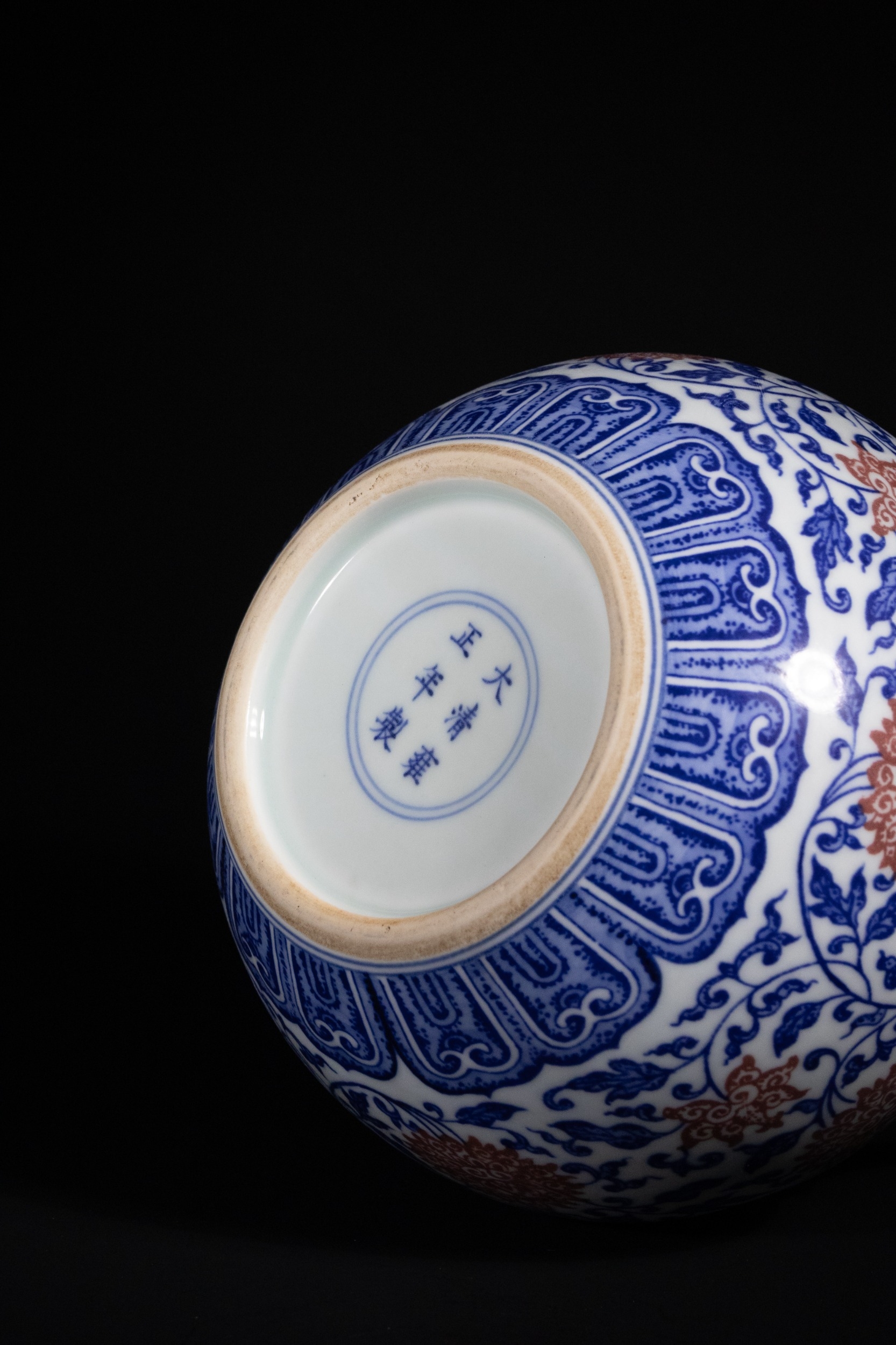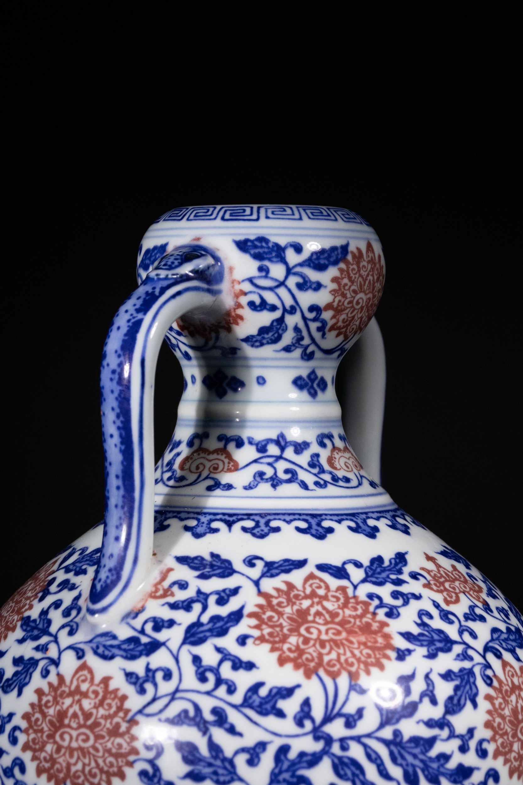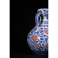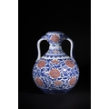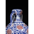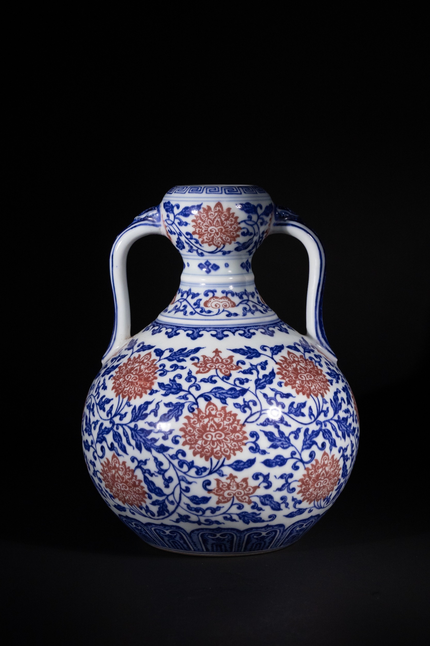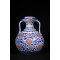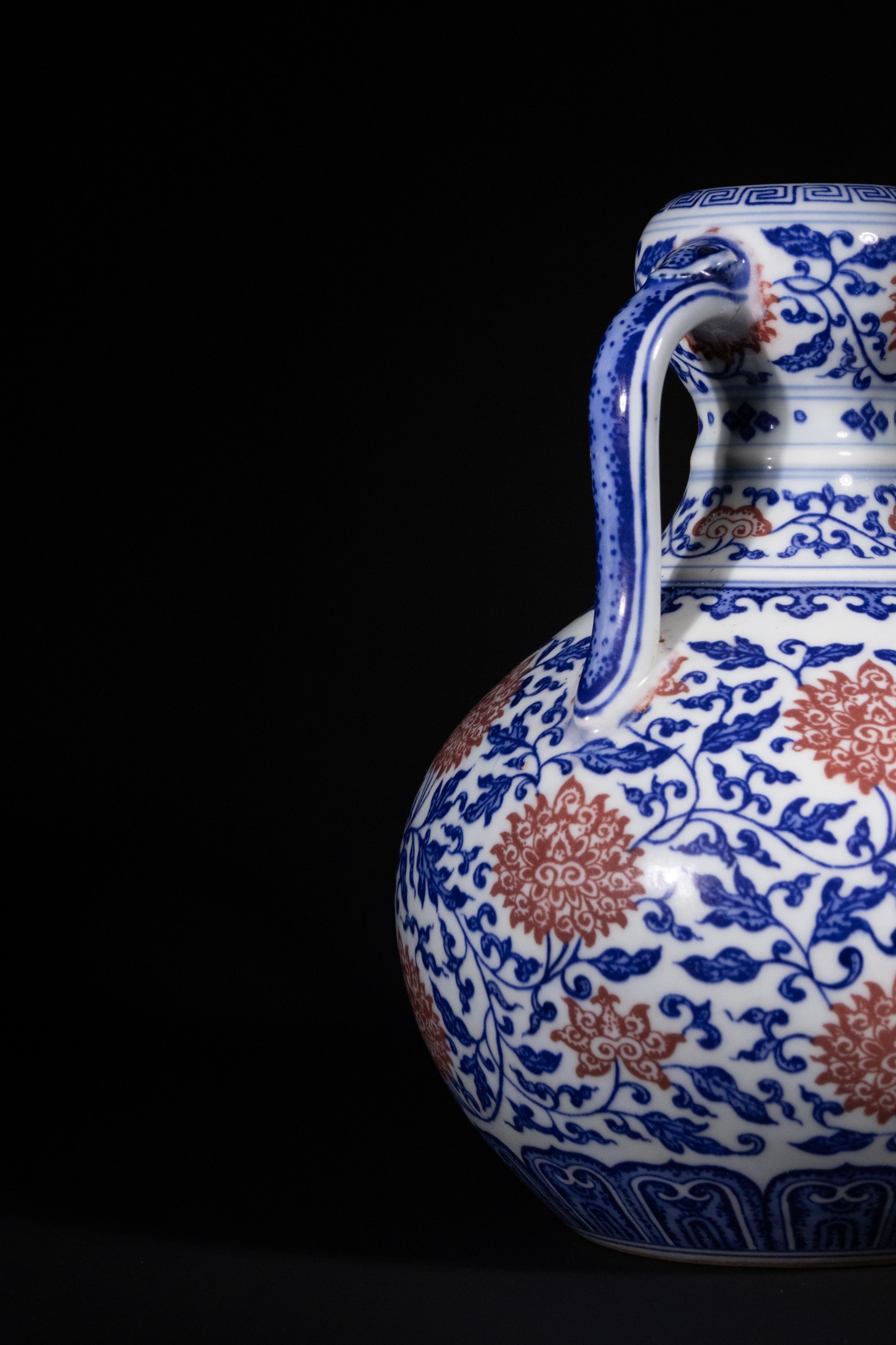 A Rare Chinese Underglaze Blue and Copper-Red Decorated Amphora-Form Vase, Yongzheng Mark - A Chinese porcelain amphora-form vase, decorated in underglaze blue and overglaze iron-red enamels, bearing a six-character Yongzheng reign mark. The vase features a globular body, a waisted neck, and a subtly flared rim, flanked by two arching loop handles. The main body is densely decorated with scrolling blue foliage interspersed with prominent stylized red chrysanthemum or peony blossoms. The neck, rim, and handles are adorned with additional bands of scrolling motifs and a key-fret pattern at the mouth. The base exhibits a band of blue stylized lappets. On the recessed foot, there is a six-character underglaze blue reign mark which translates to 大清雍正年製 (Dà Qīng Yōngzhèng Nián Zhì), meaning "Made in the Great Qing Dynasty, Yongzheng Period."