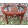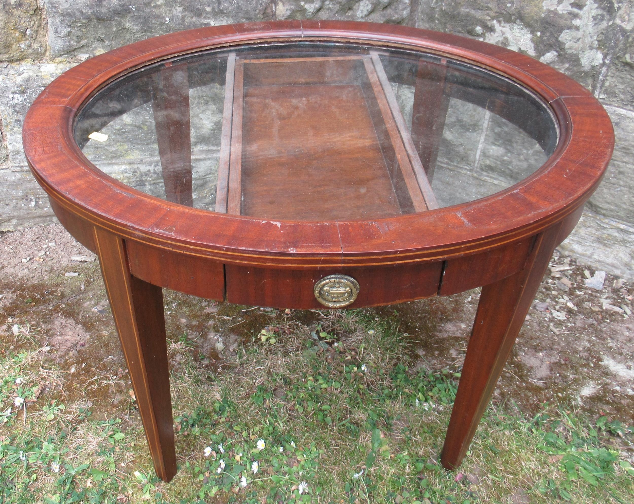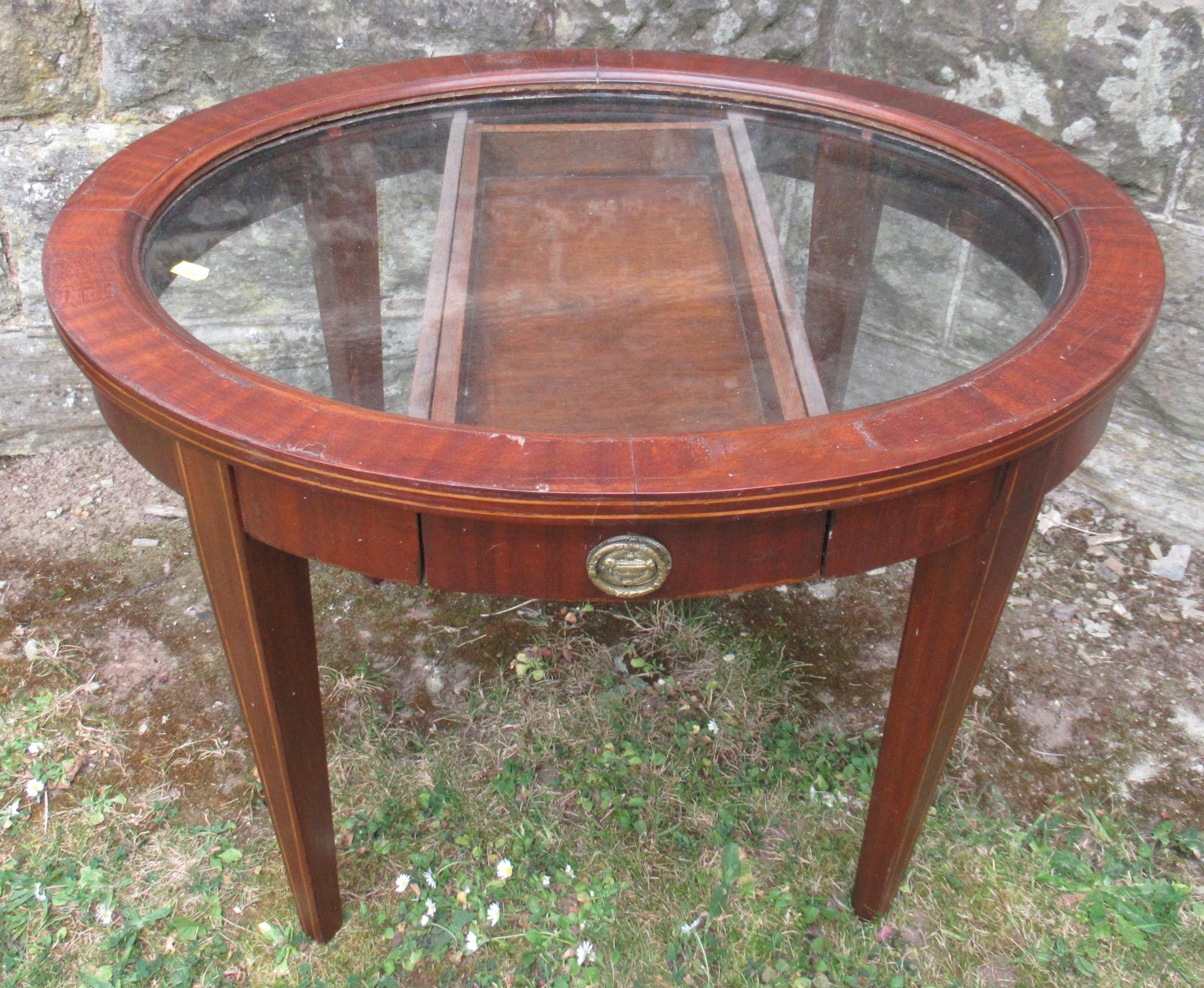 An oval glass top coffee table, with a drawer, maximum diameter 27.5ins