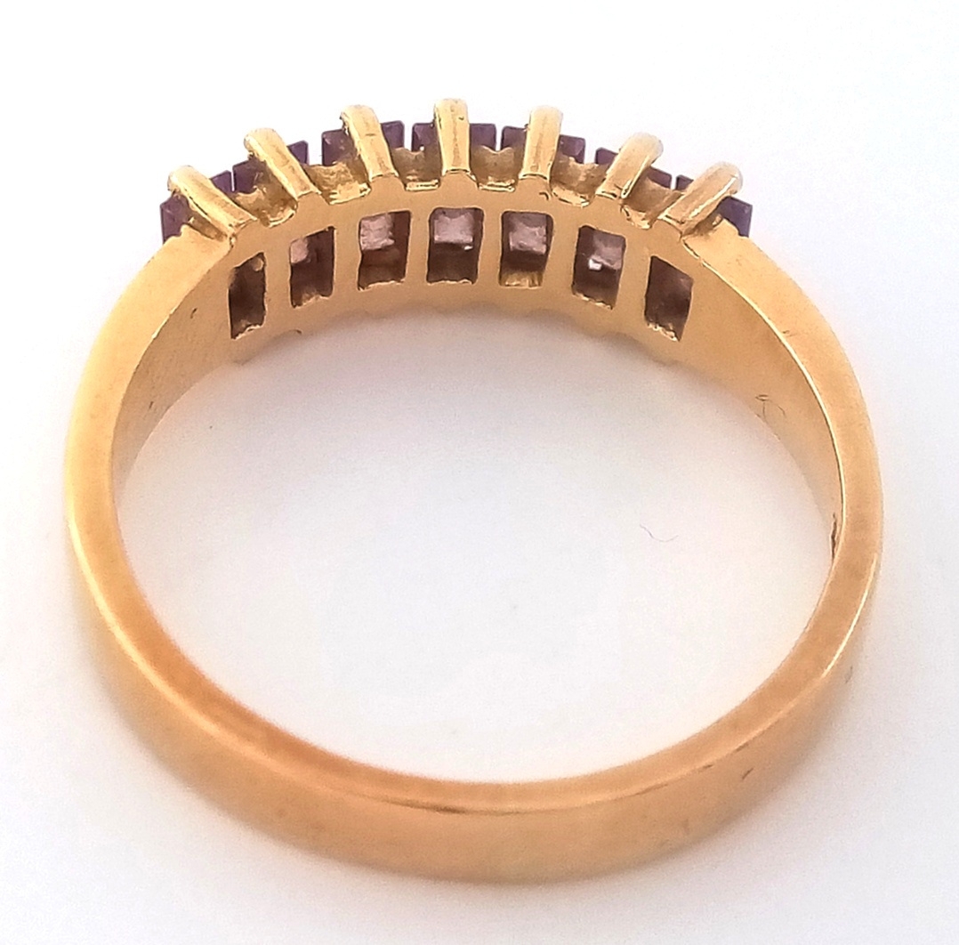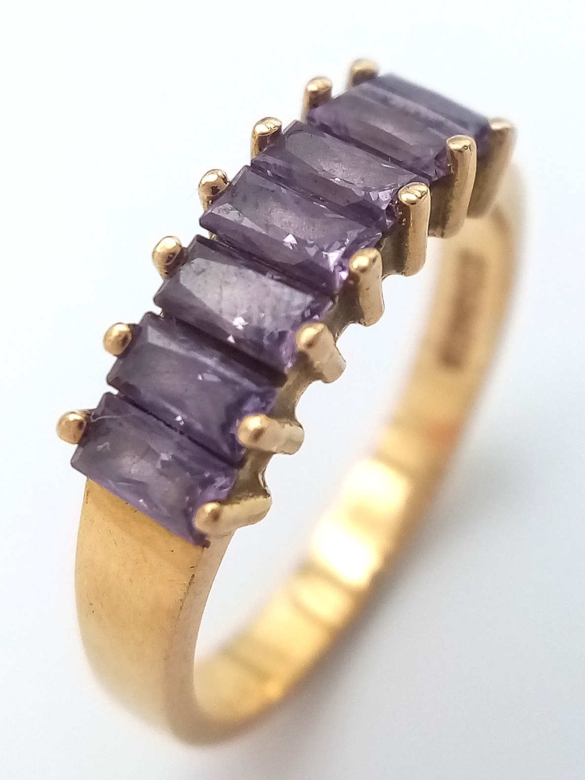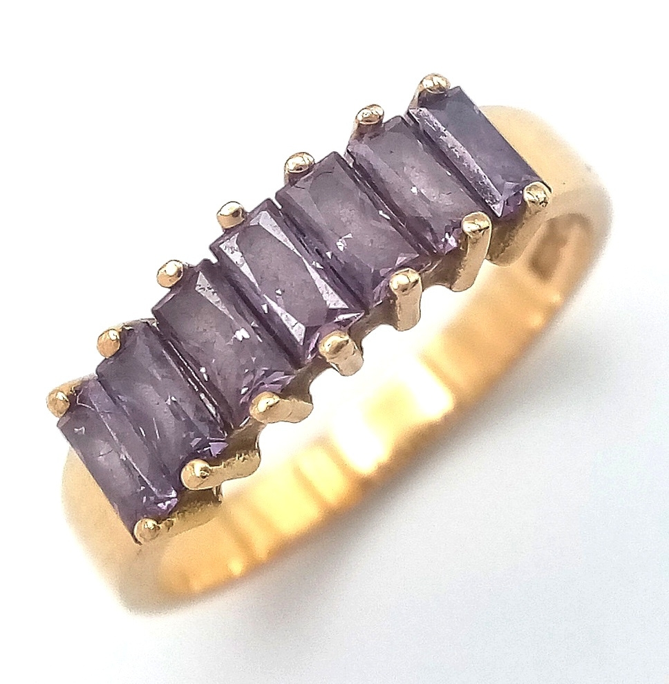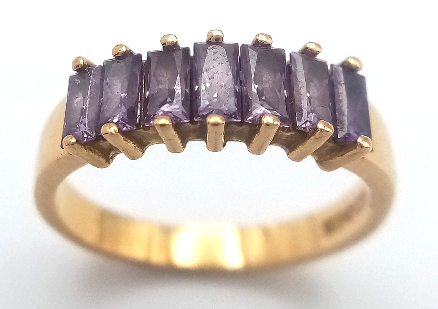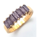 Stunning 18 CARAT GOLD RING, set with 7 x Baguette Cut AMETHYST GEMSTONES. 3.18 Grams. Size J - J 1/2.