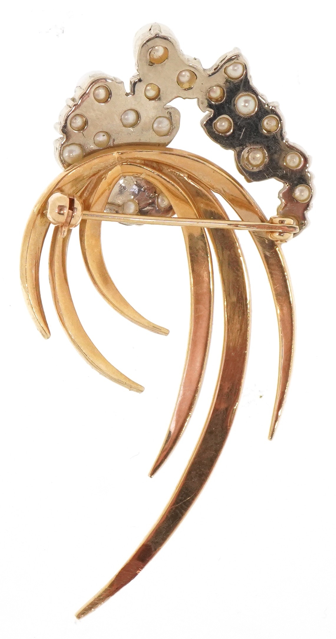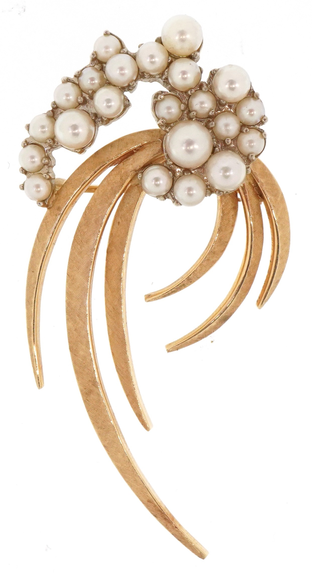 An unmarked two tone gold cultured pearl naturalistic brooch, 6cm in length, 10.0g.