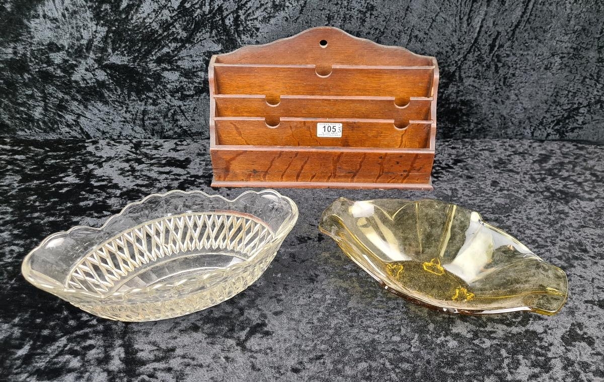 Edwardian wall-mountable oak letter rack, along with two rather special vintage glass bowls.