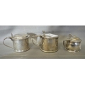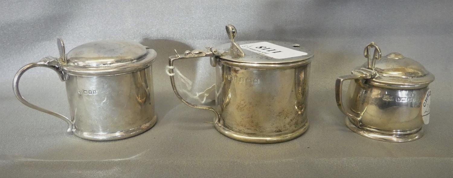 Three Silver Mustard Pots - London & 2 Birmingham, all with blue glass liners (largest pot liner damaged), historical Christies Auctioneers label.