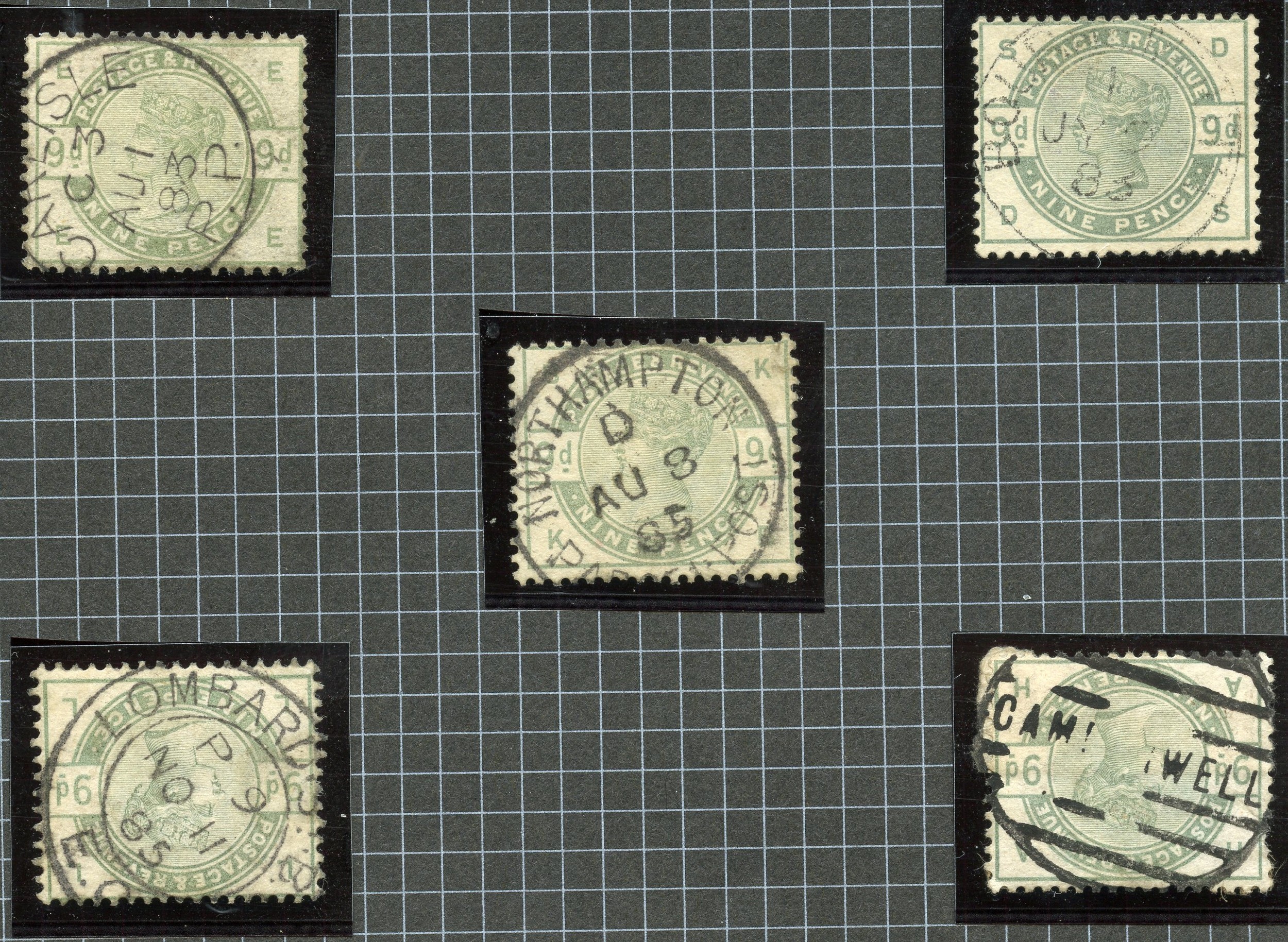 Property of a deceased estate - stamps, philatelic & postal history interest - Great Britain: 1883-84 9d dull green fresh unused (original gum, that has been partly redistributed), another overprinted ‘SPECIMEN’, and used (5), all have good colour, fine to very fine.