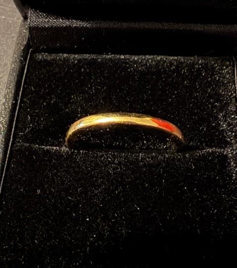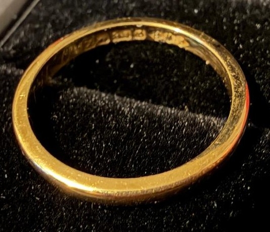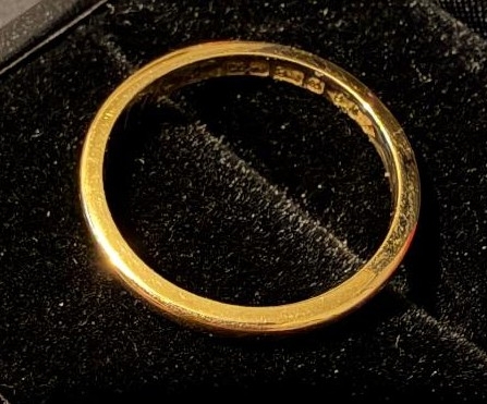 JEWELLERY : 18ct Gold wedding band, clear hallmarks, plus engraved inside with initials and wedding date 1960 Size M 2.35g PLEASE MAKE SURE YOU READ TERMS AND CONDITIONS REGARDS PAYMENT OPTIONS, CARD NOT PRESENT TRANSACTIONS NOT ACCEPTED ON GOLD JEWELLERY OR WATCHES.