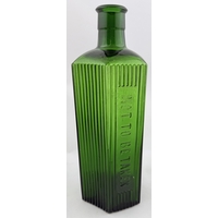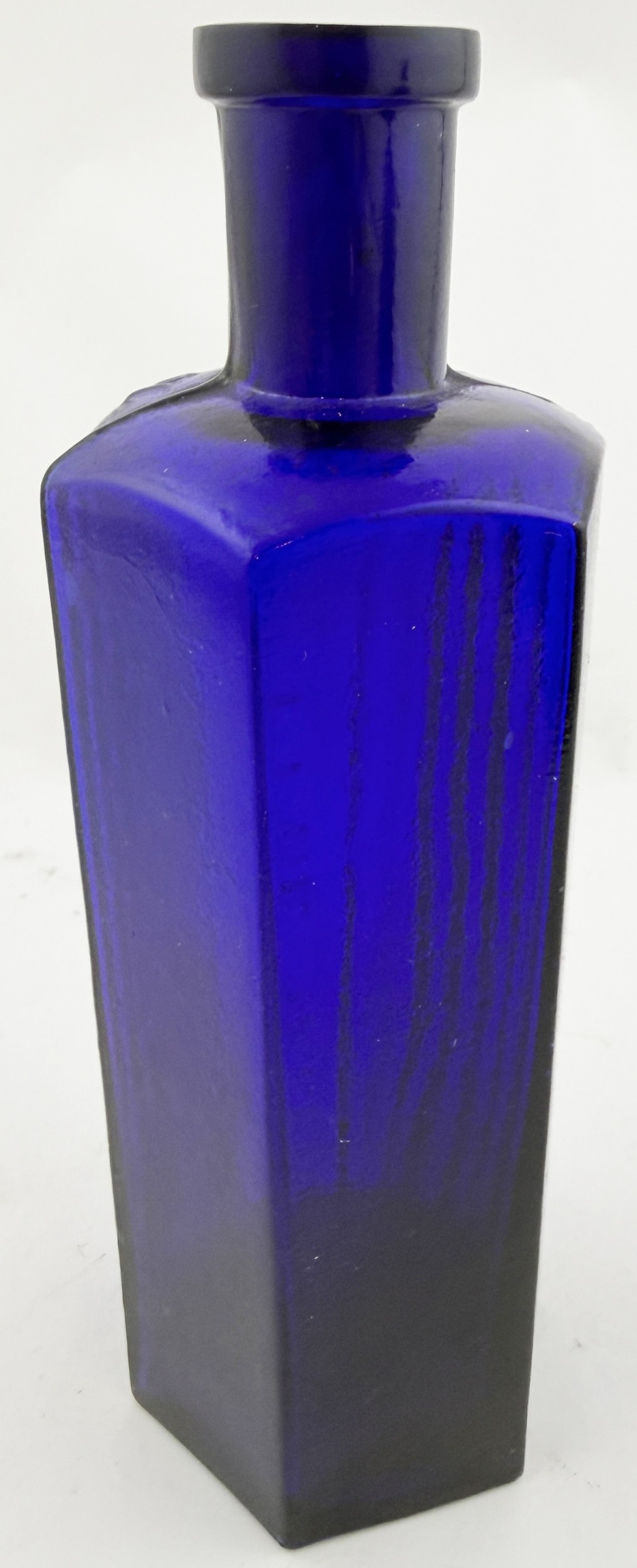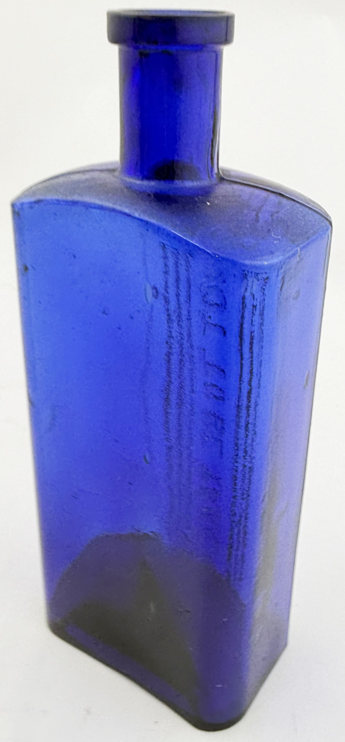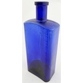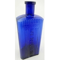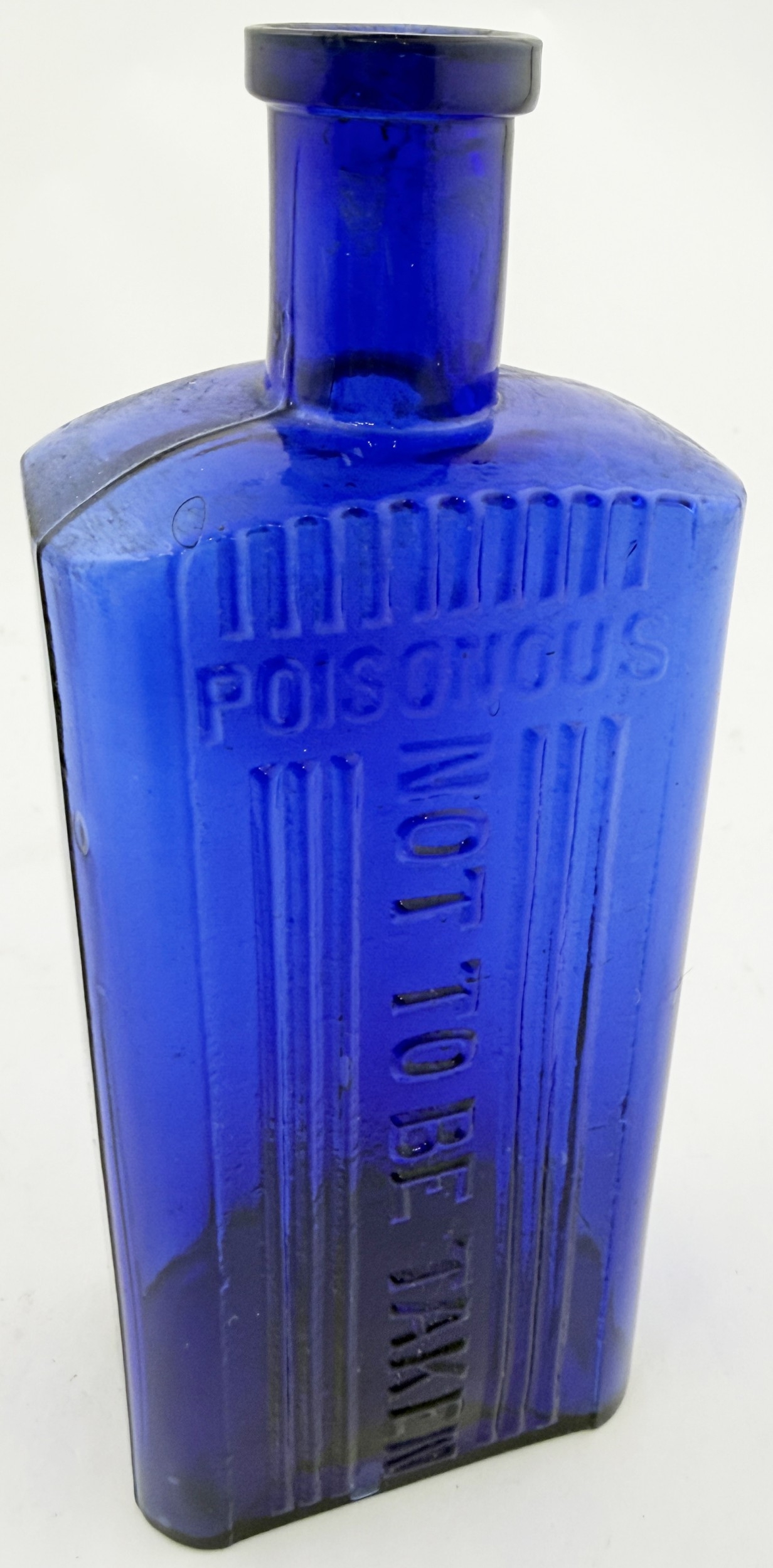 T BAR RECTANGULAR POISON BOTTLE. DP p112. 7ins. Cobalt blue glass rectangular poison, no ribbing to narrow sides but usual vertical NOT TO BE TAKEN text, ribbing adjacent to front. In addition word POISONOUS horizontally embossed above the NTBT text.
