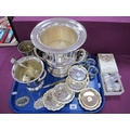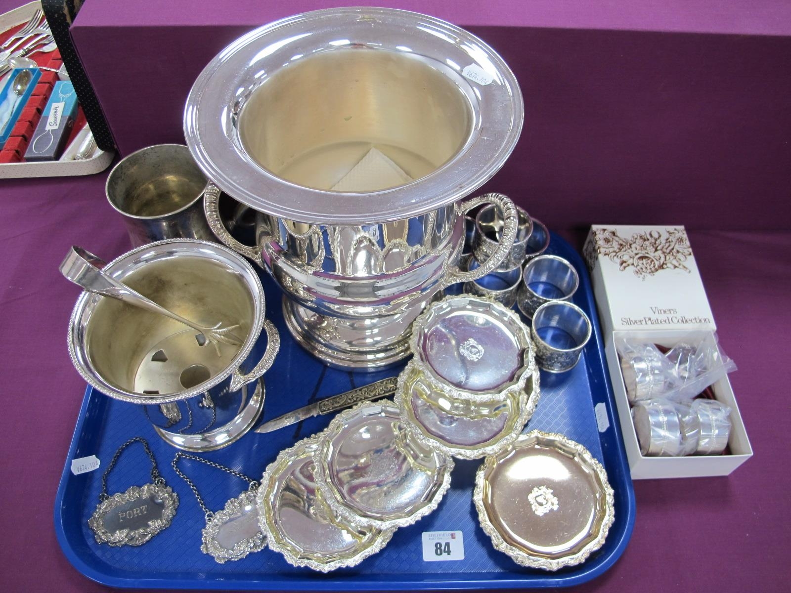 A Modern Plated Wine Cooler, together with plated ice bucket and tongs, mug engraved "H.M.S. Victorious 1964-65", decorative set of napkin rings, Viners coasters with facsimile crest, 'Sherry' and 'Port' decanter labels, EPNS folding pocket knife etc.
