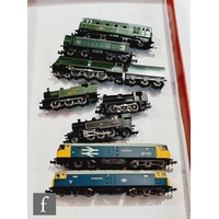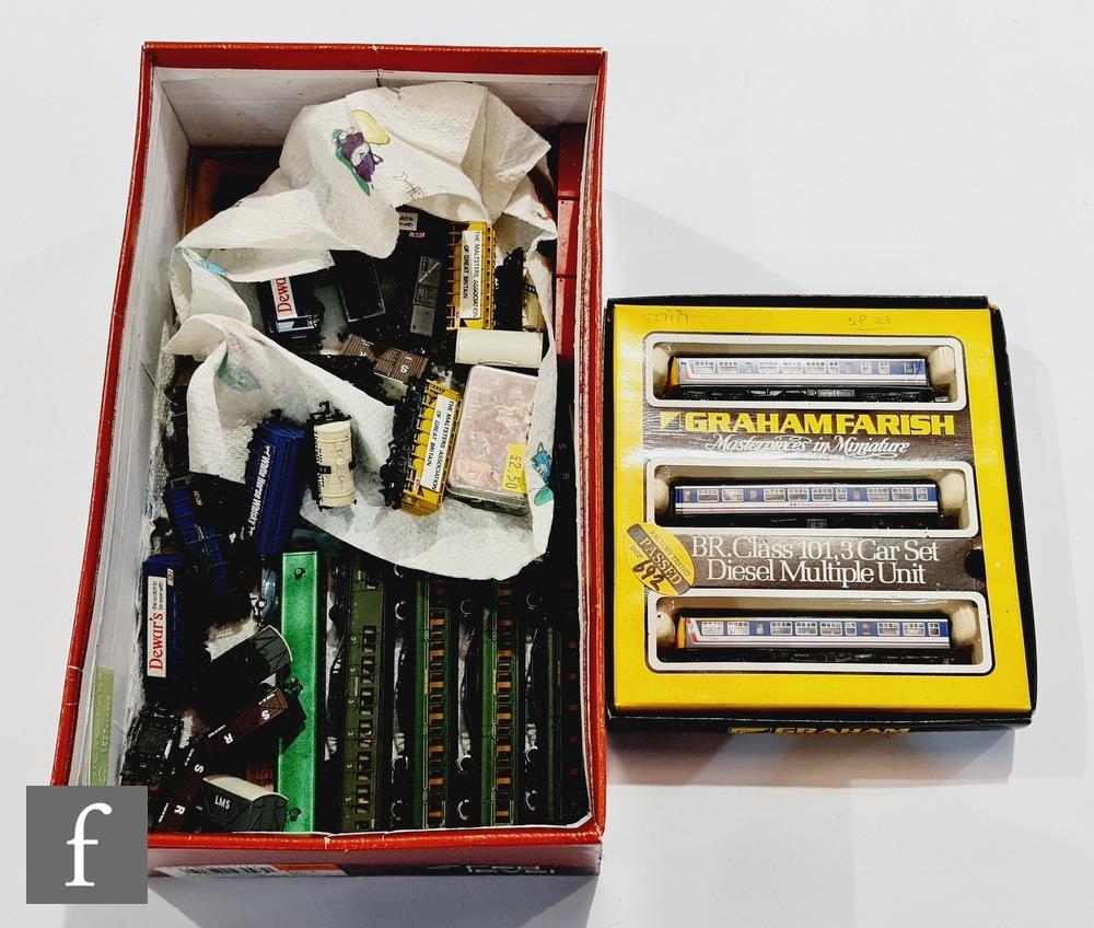 A boxed N gauge Graham Farish BR Class 101 DMU 3 car set, with a collection of unboxed N gauge items, to include approximately thirty five coaches and rolling stock by Peco and others, with assorted accessories including figures and vehicles.