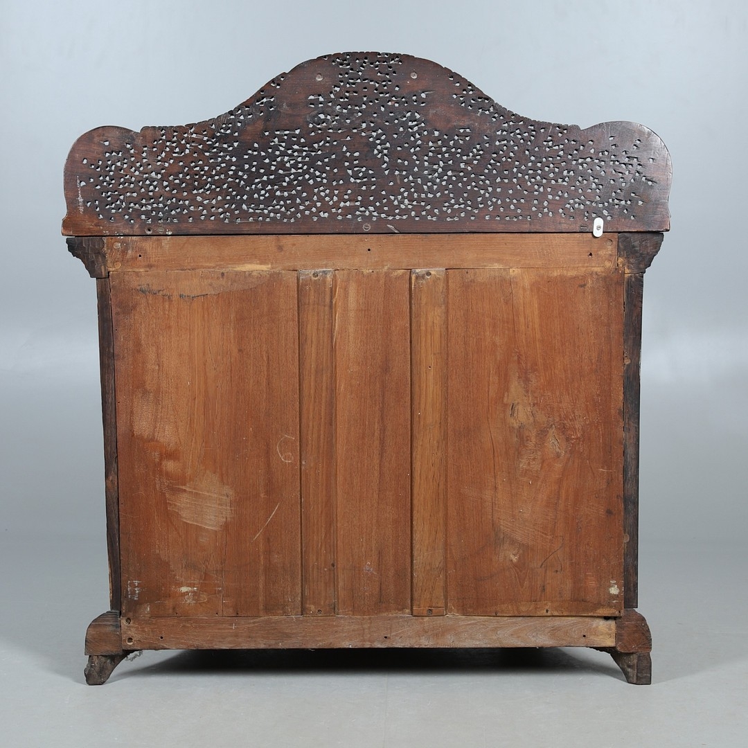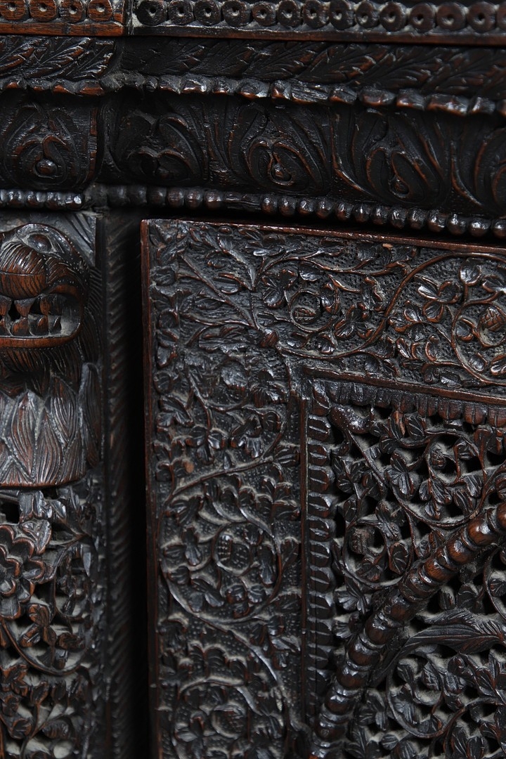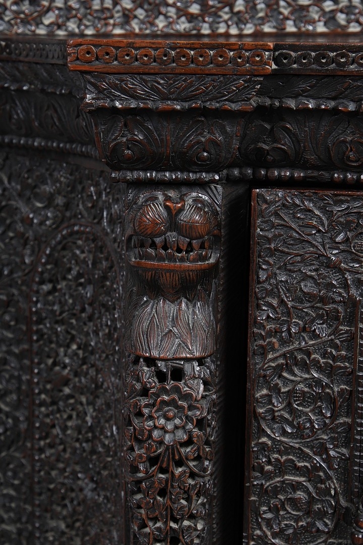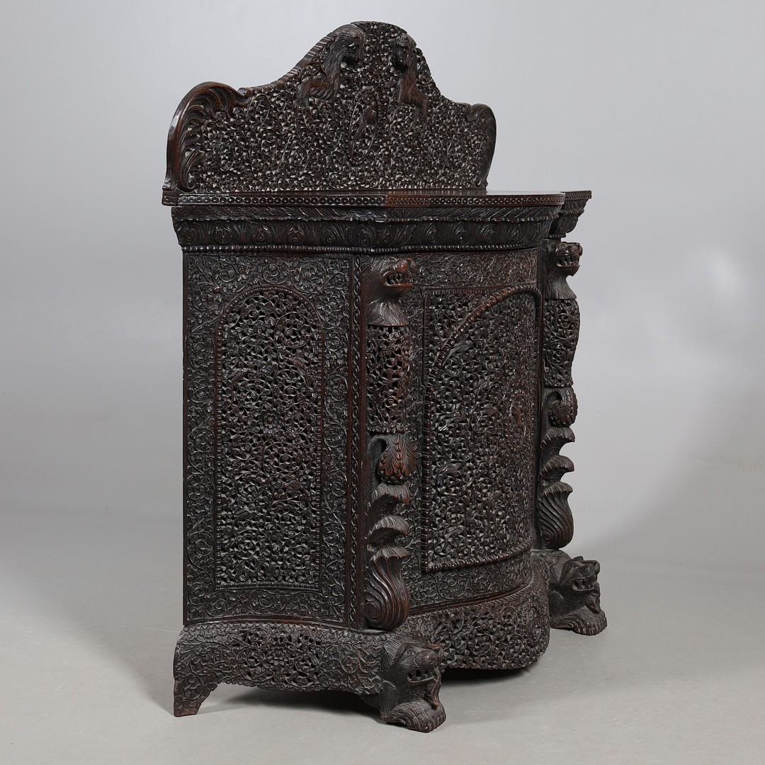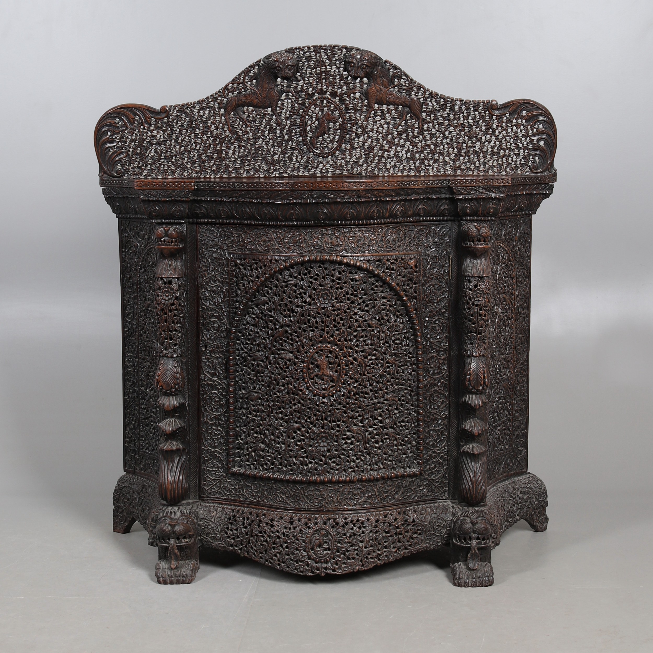 A 19TH CENTURY BURMESE HARDWOOD SIDE CABINET. the raised back over a serpentine front and concave sides, enclosing a shelved interior, the ornately carved and pierced foliate decoration incorporating carved lion monopodia and feet, height 117cm, width 107cm, depth 40cm.
