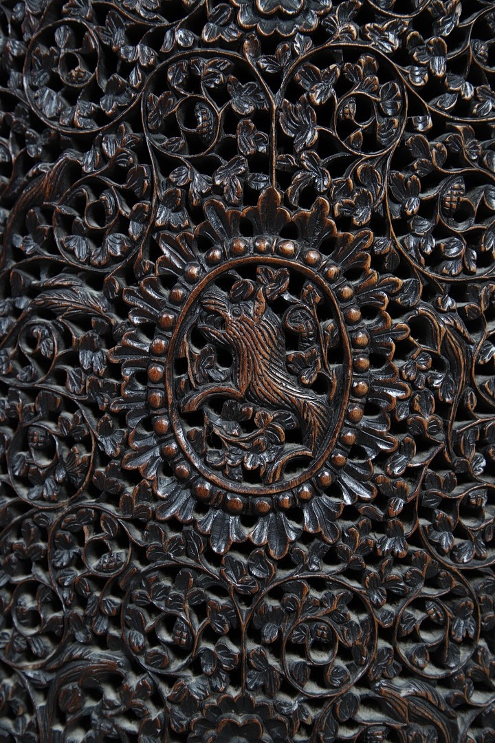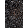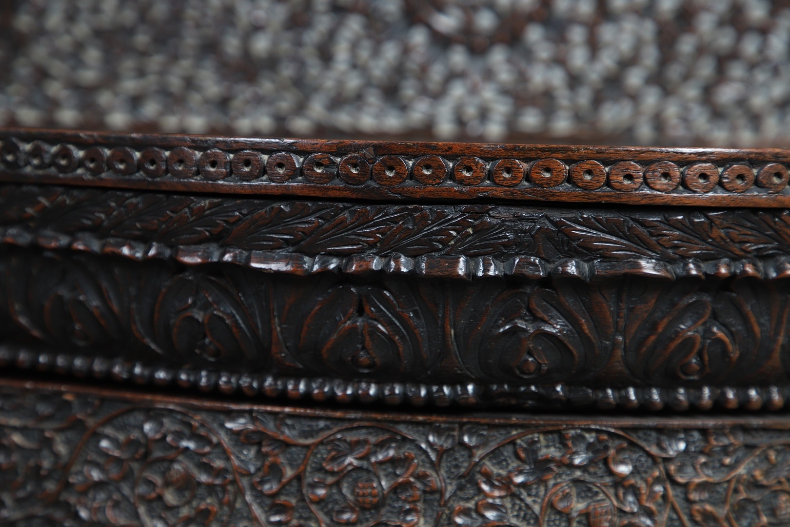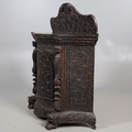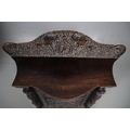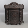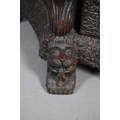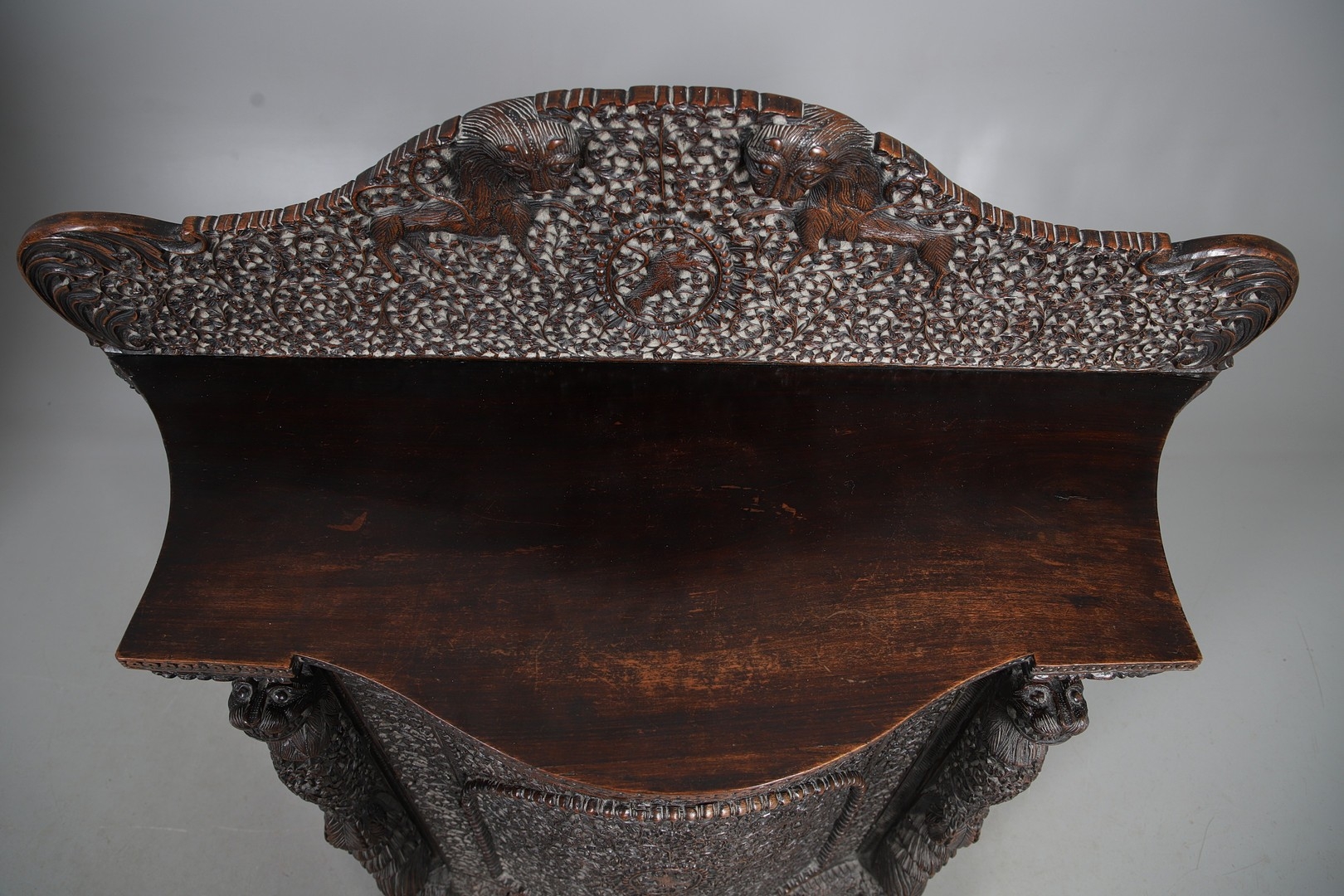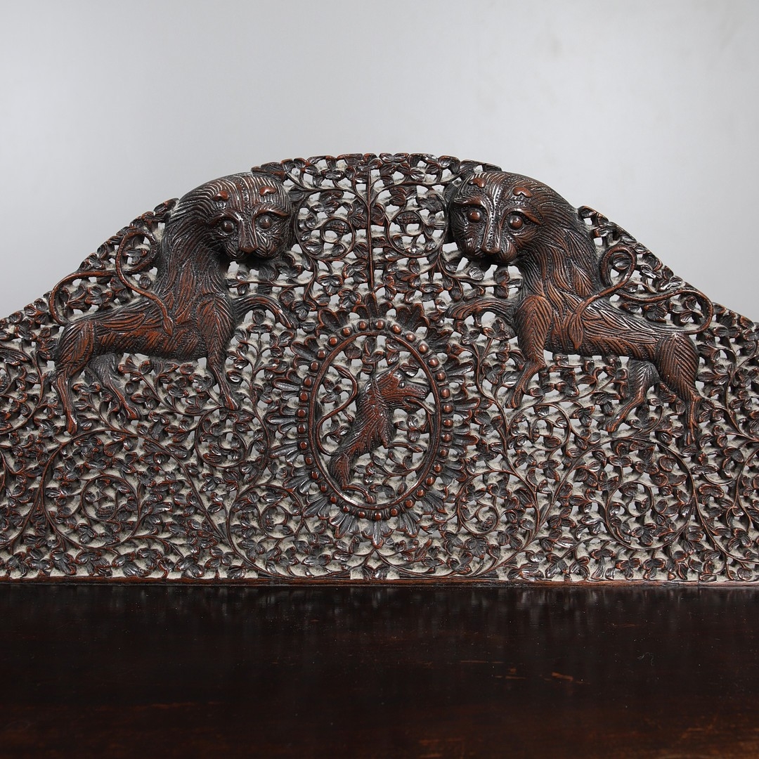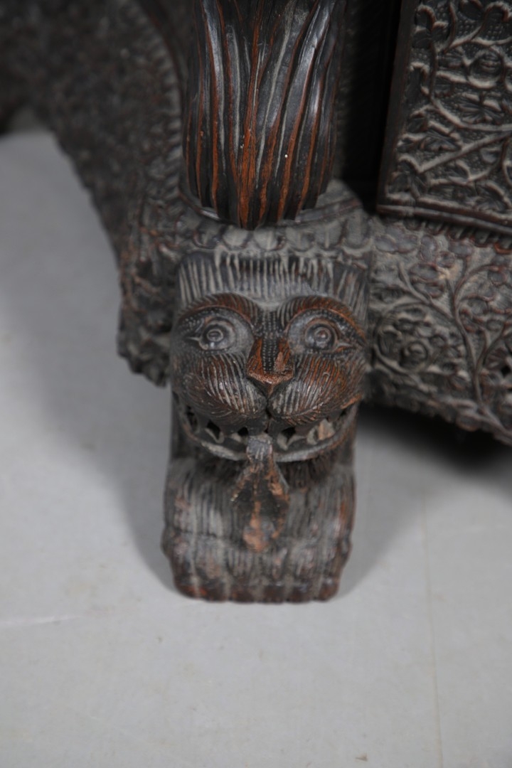 A 19TH CENTURY BURMESE HARDWOOD SIDE CABINET. the raised back over a serpentine front and concave sides, enclosing a shelved interior, the ornately carved and pierced foliate decoration incorporating carved lion monopodia and feet, height 117cm, width 107cm, depth 40cm.