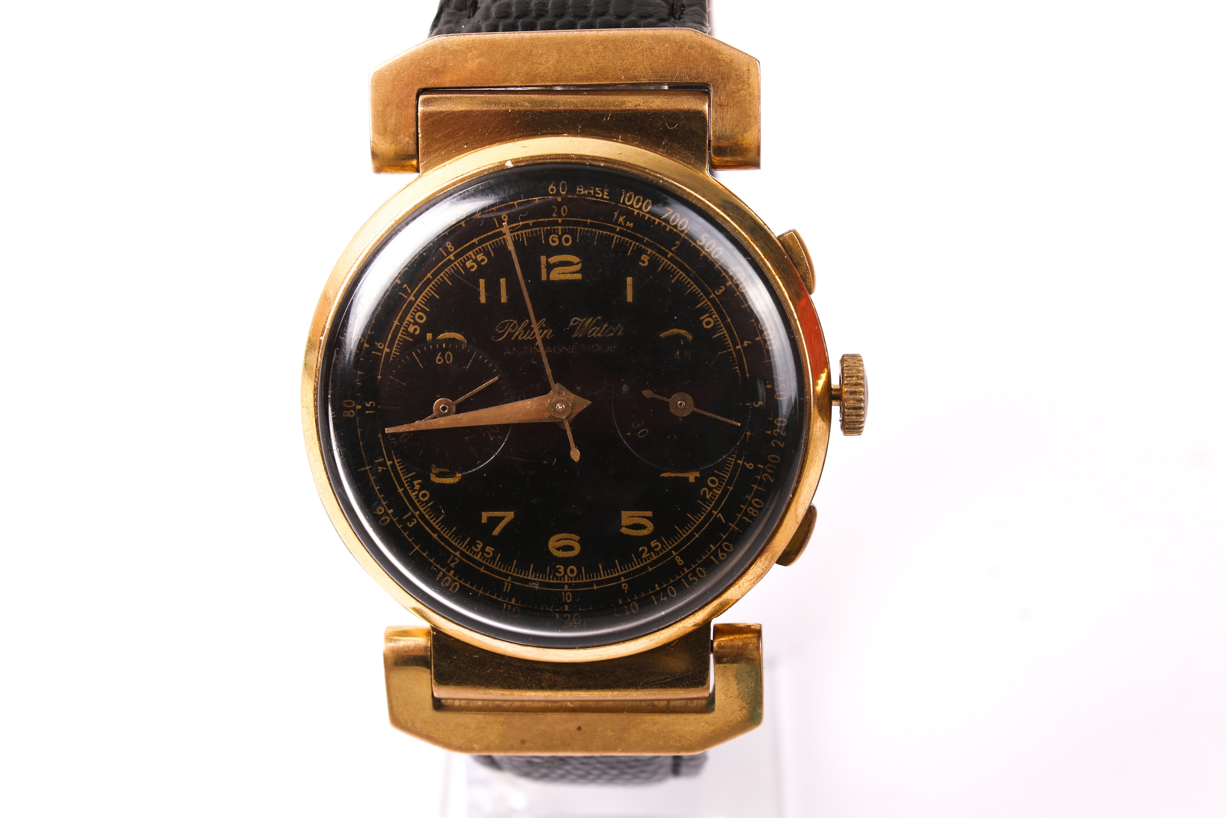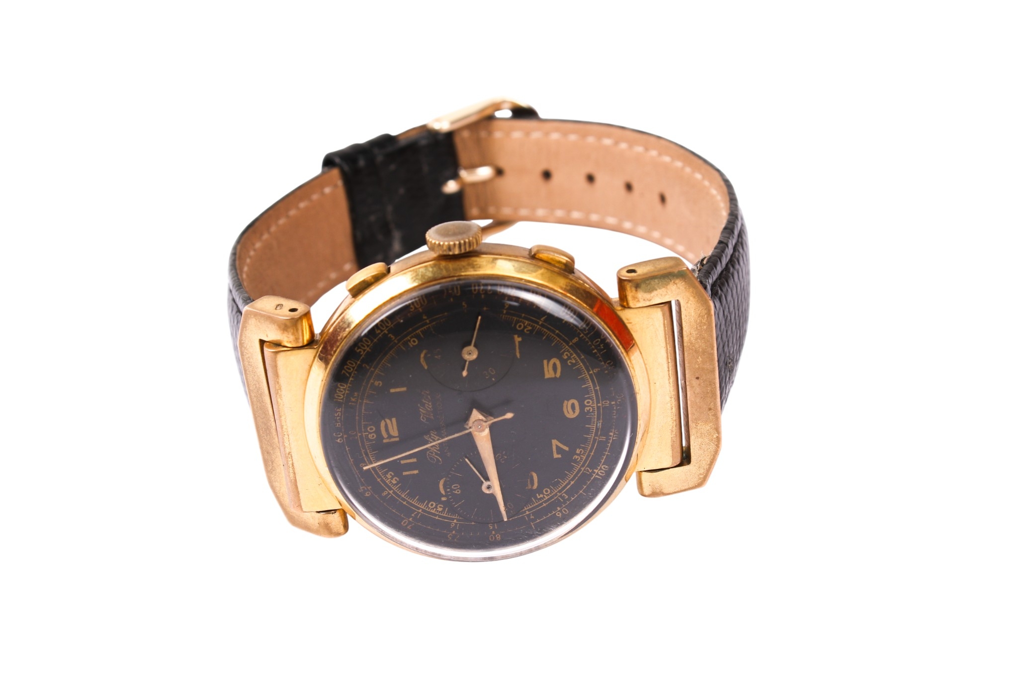 A gentlemans Philip Watch wristwatch. The black dial with gilt Arabic numerals and two subsidiary dials, having a Swiss antimagnetique movement, in a yellow metal case, the back stamped '18K 0.750', attached to a black lizard calf strap, case diameter 3.9cm, case back weight 3.6g.