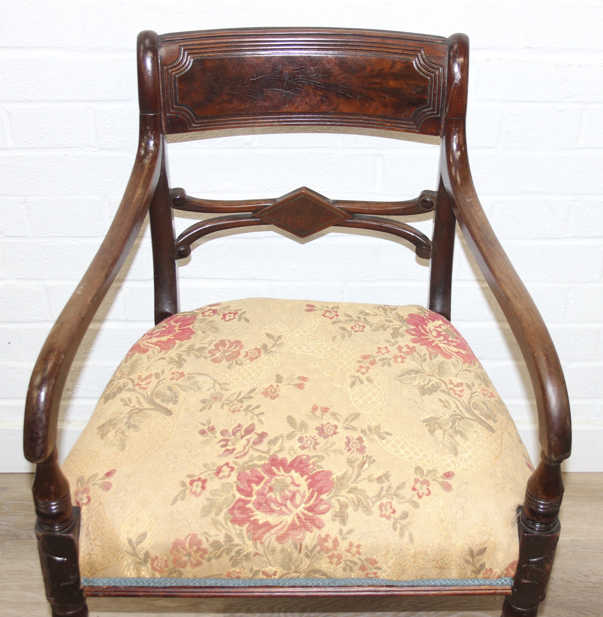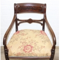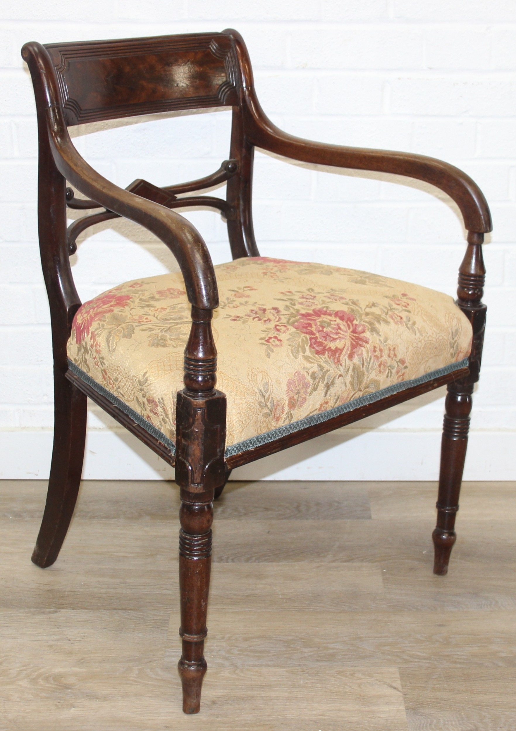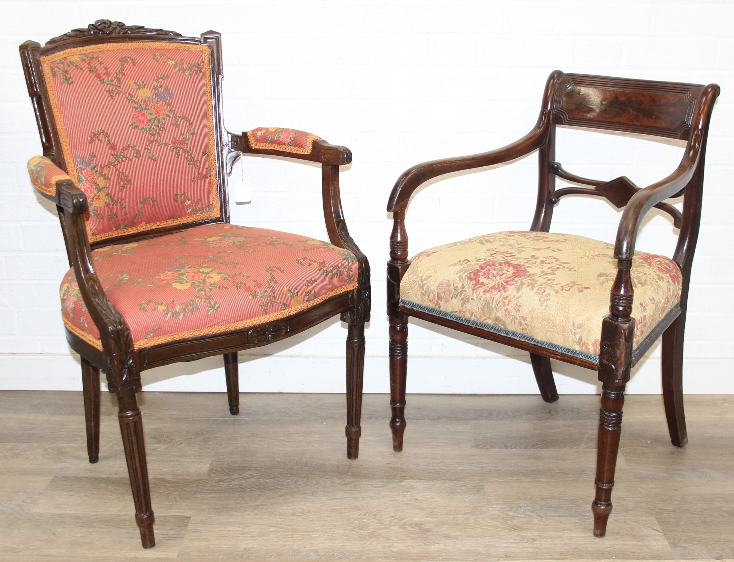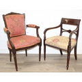 A Regency style open armchair with later floral upholstery, 94cm tall & a Georgian mahogany carver armchair with rail back and later floral upholstery, 82cm tall [2]