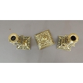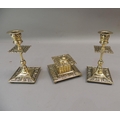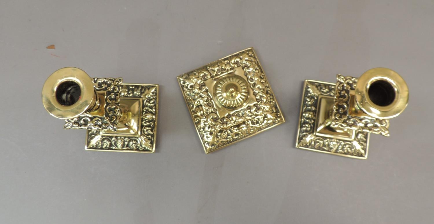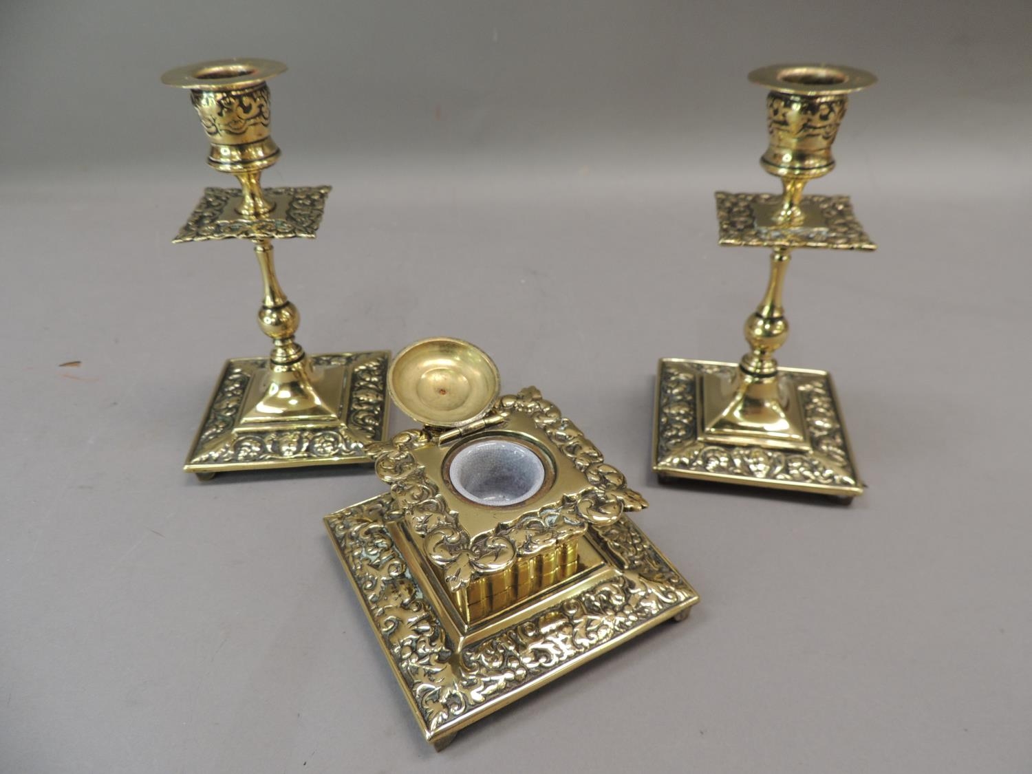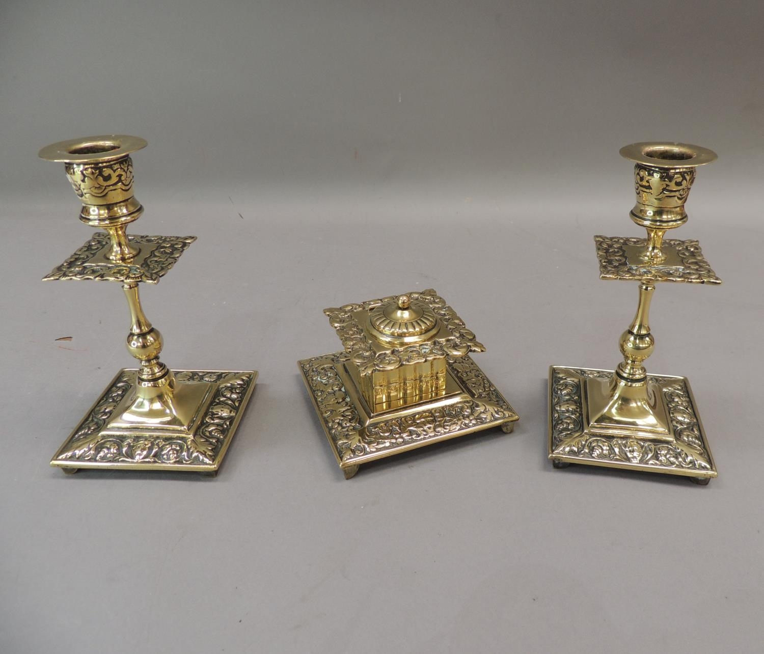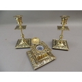 A Victorian brass desk set comprising well and pair of candlesticks, the square ink well with foliate cast borders, hinged lid with pottery interior, the candlesticks knopped with conforming drip pans, ink well 10cm wide, candlesticks 16cm high, (3)
