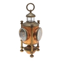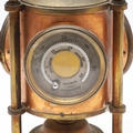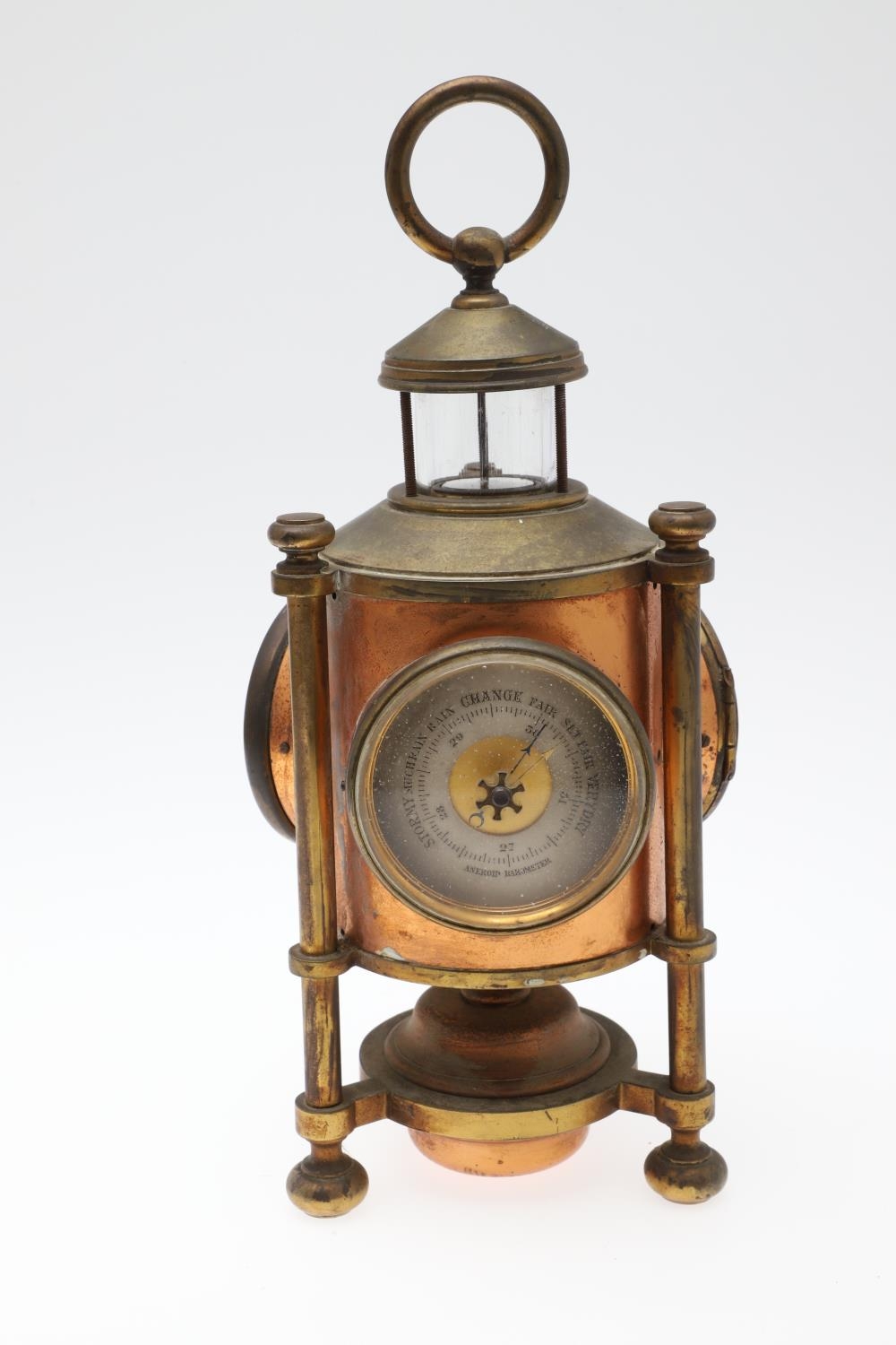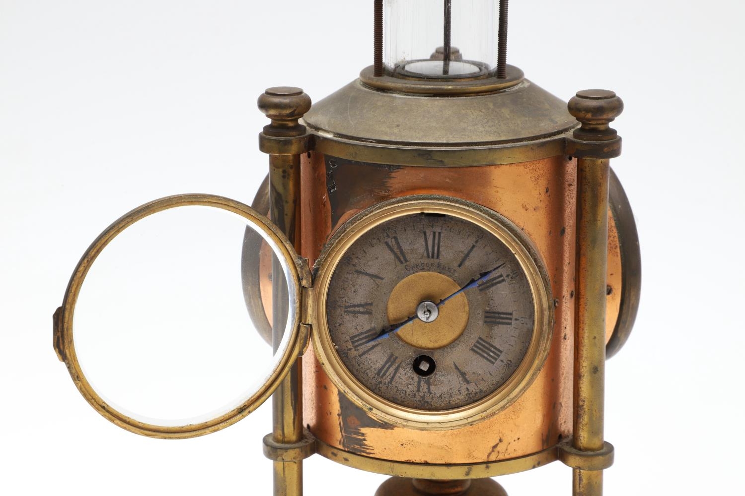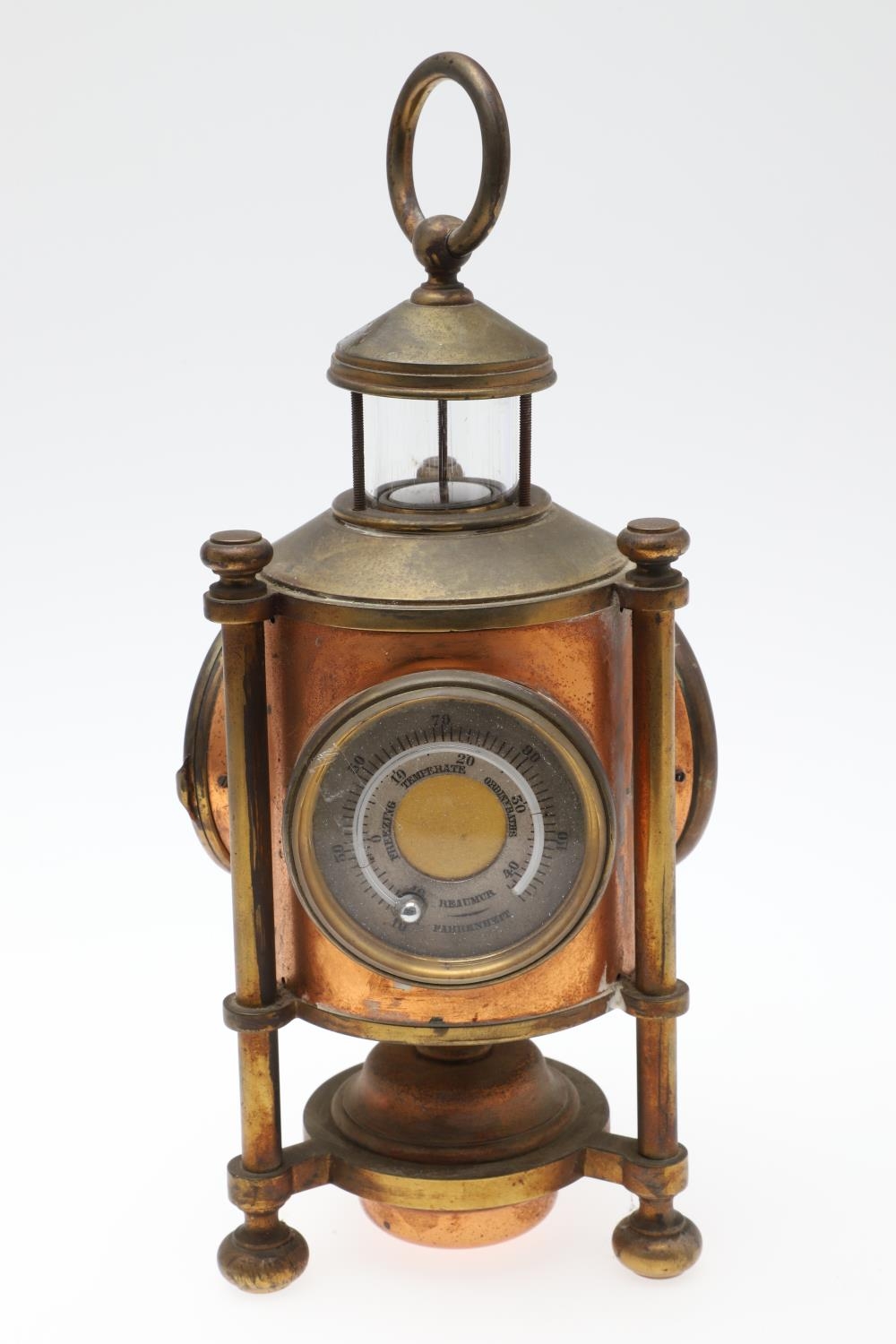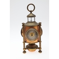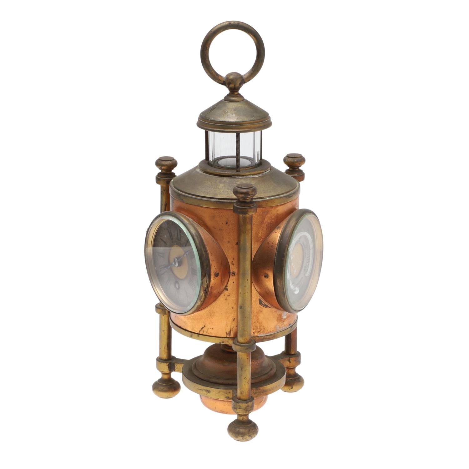 A FRENCH NOVELTY BRASS AND COPPER COMBINATION TIMEPIECE. by the Cahoon Bros, in the form of a lantern, comprising of aneroid barometer, thermometer and glass encased compass to the top, signed to the clock dial, height inc. handle 27cm.