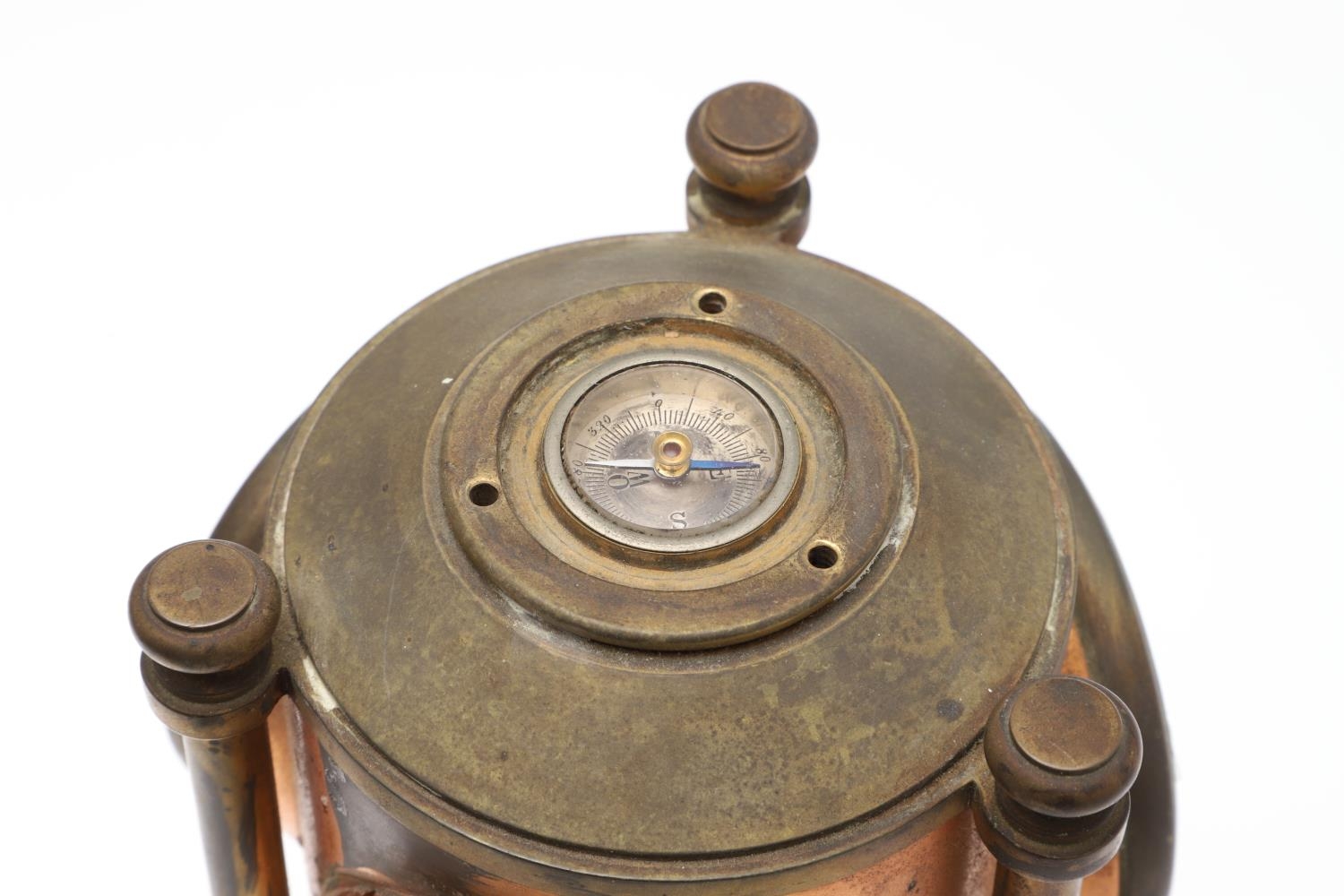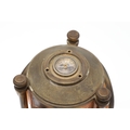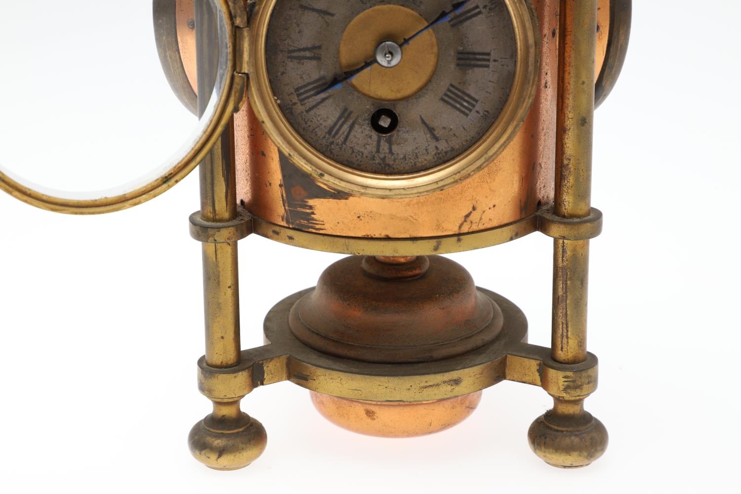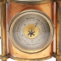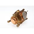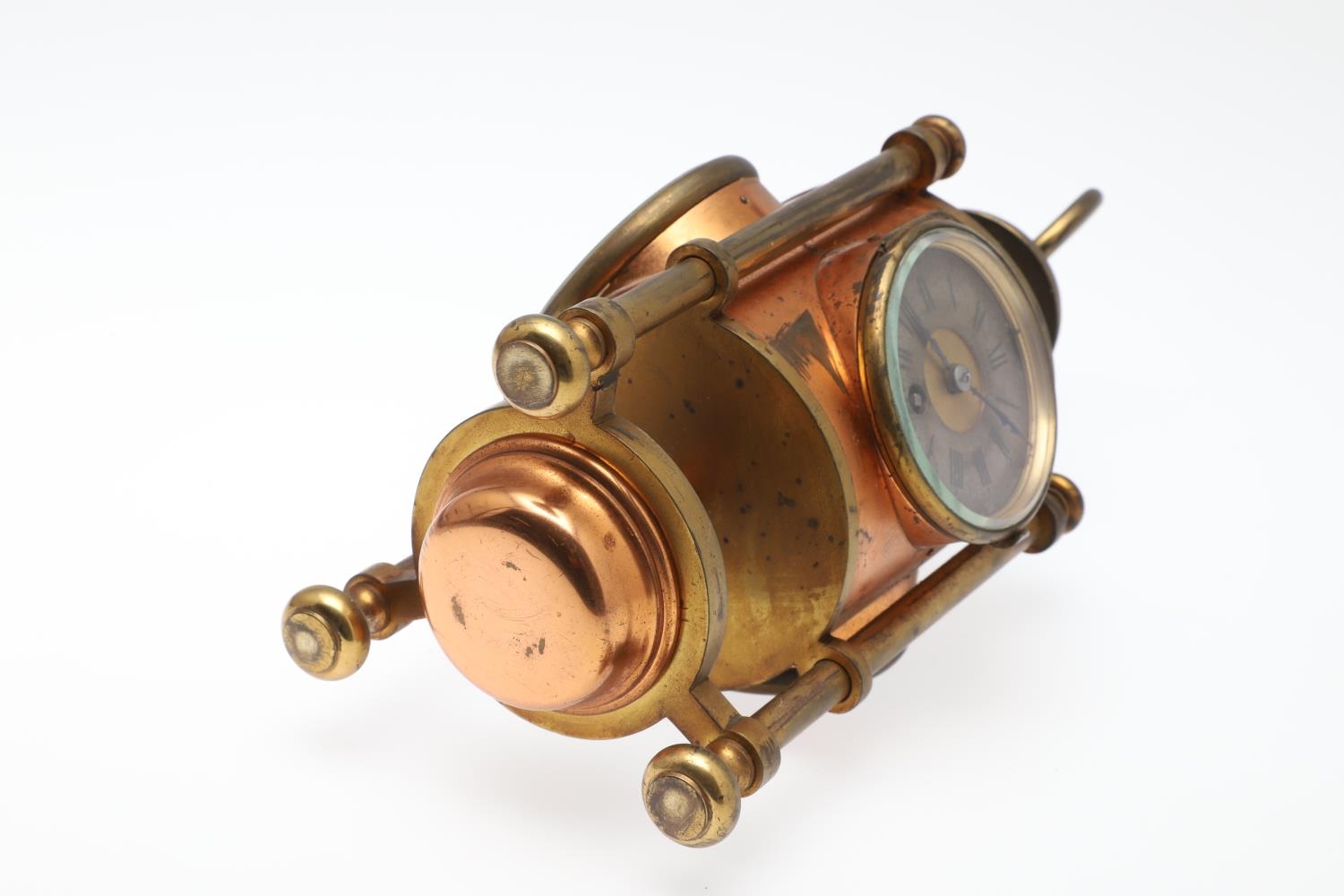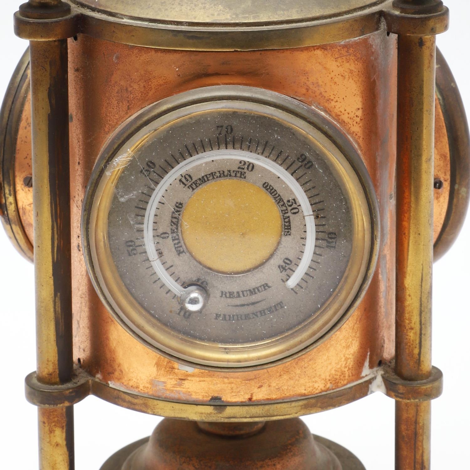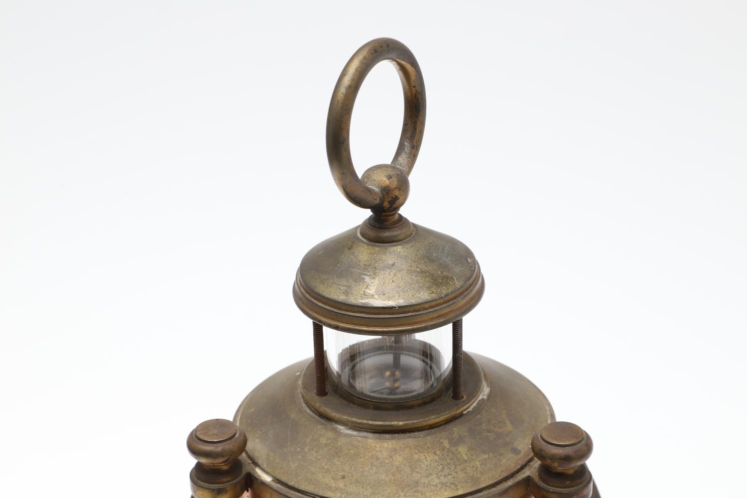 A FRENCH NOVELTY BRASS AND COPPER COMBINATION TIMEPIECE. by the Cahoon Bros, in the form of a lantern, comprising of aneroid barometer, thermometer and glass encased compass to the top, signed to the clock dial, height inc. handle 27cm.
