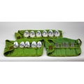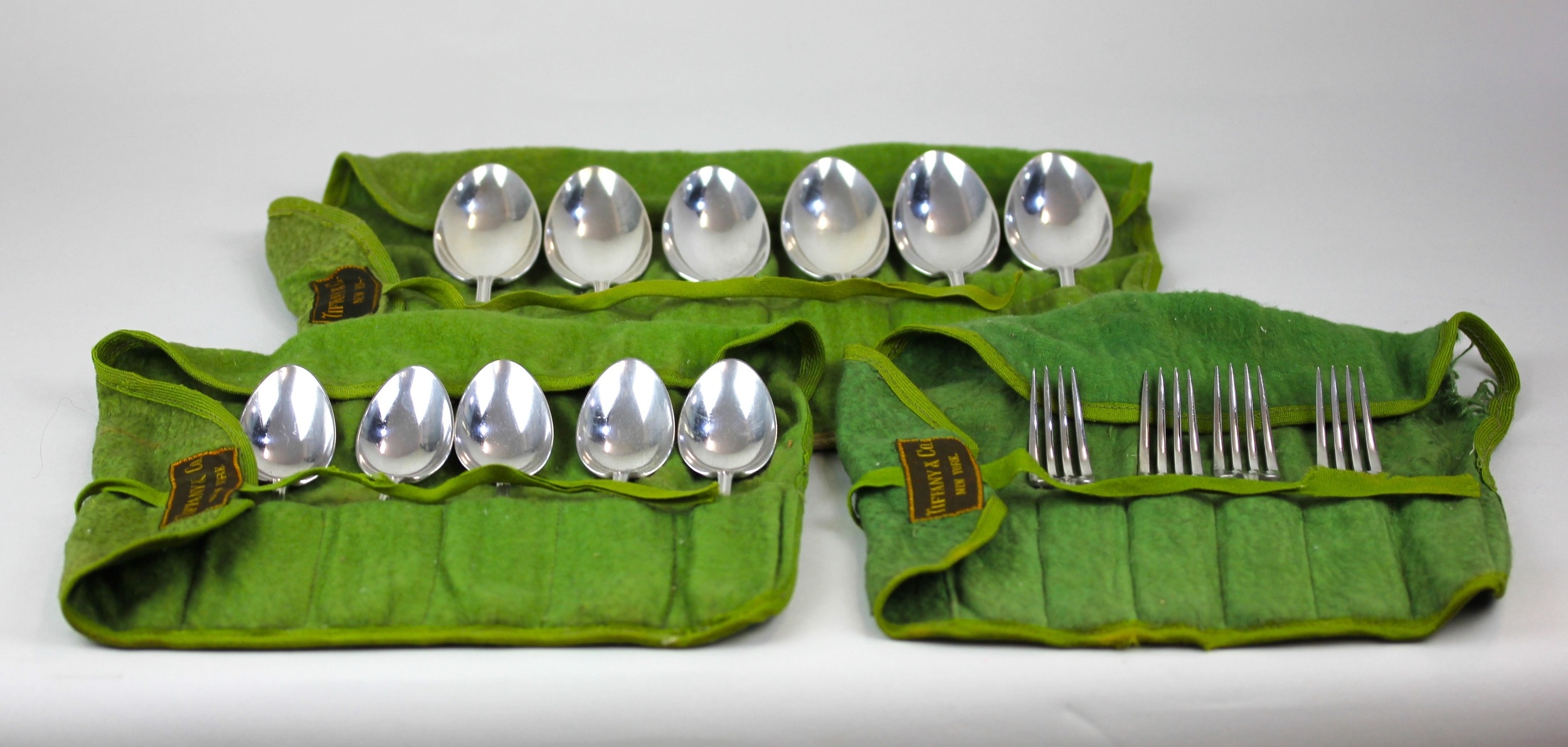 Tiffany & Co. six early 20th century silver plated tablespoons, five dessert spoons and four dessert forks with zig-zag borders and engraved initials, marked Tiffany & Co. EP PAT.1903, with three cloth wraps bearing labels, Tiffany & Co. New York
