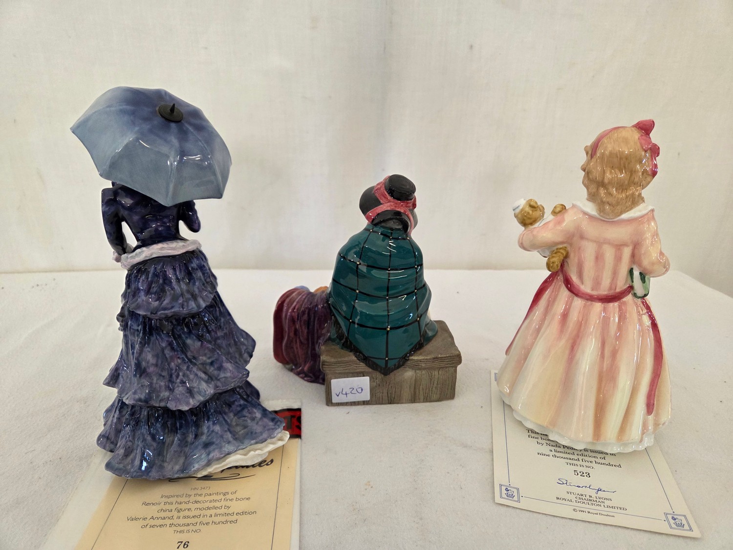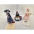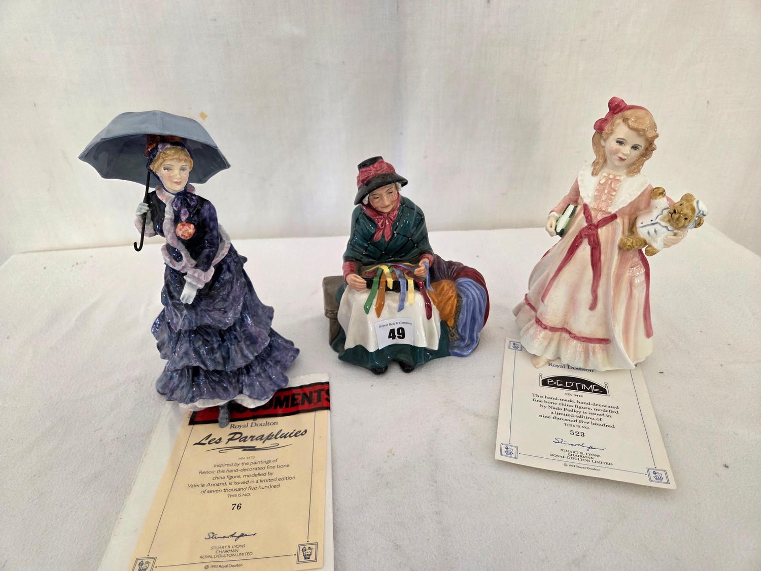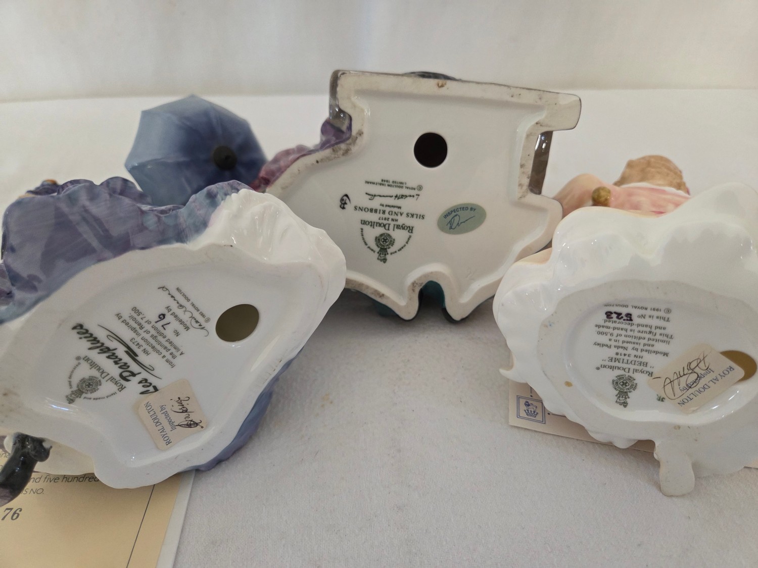 Three Royal Doulton figurines comprising Silks and Ribbons; Les Parapluies Ltd Ed No 76 with certificate and Bedtime Ltd Ed 523 with certificate