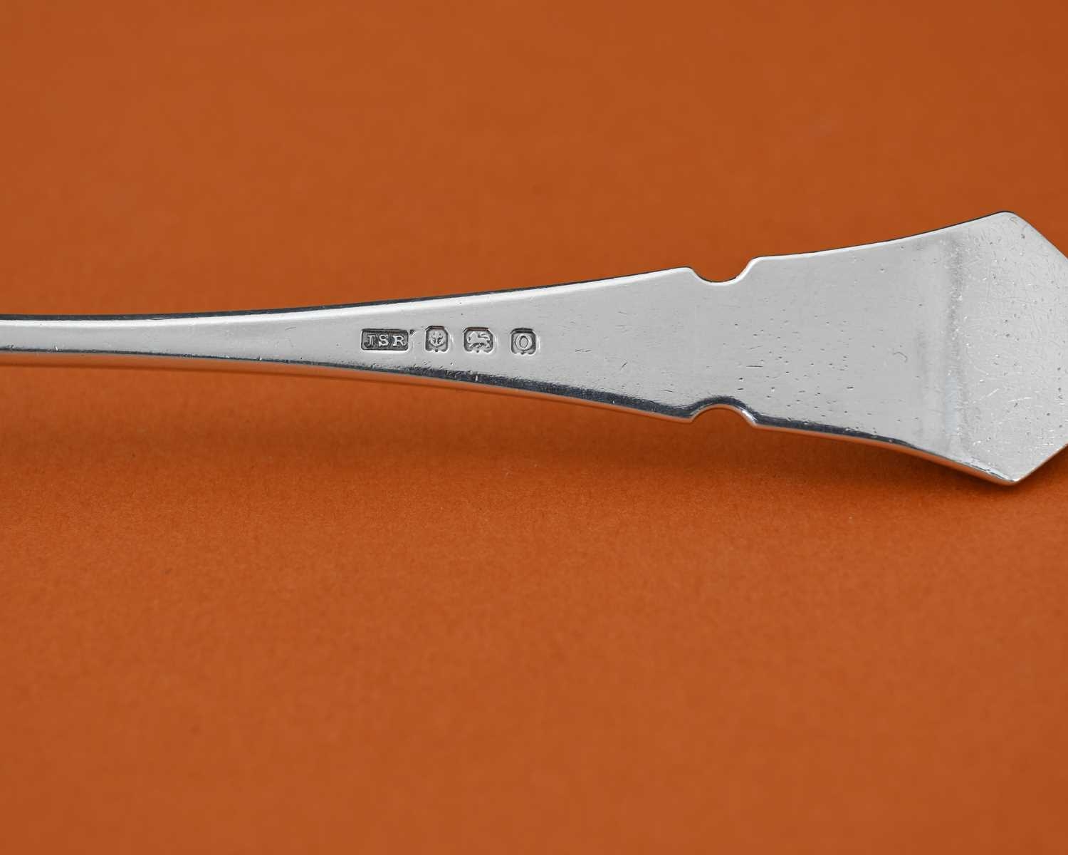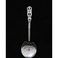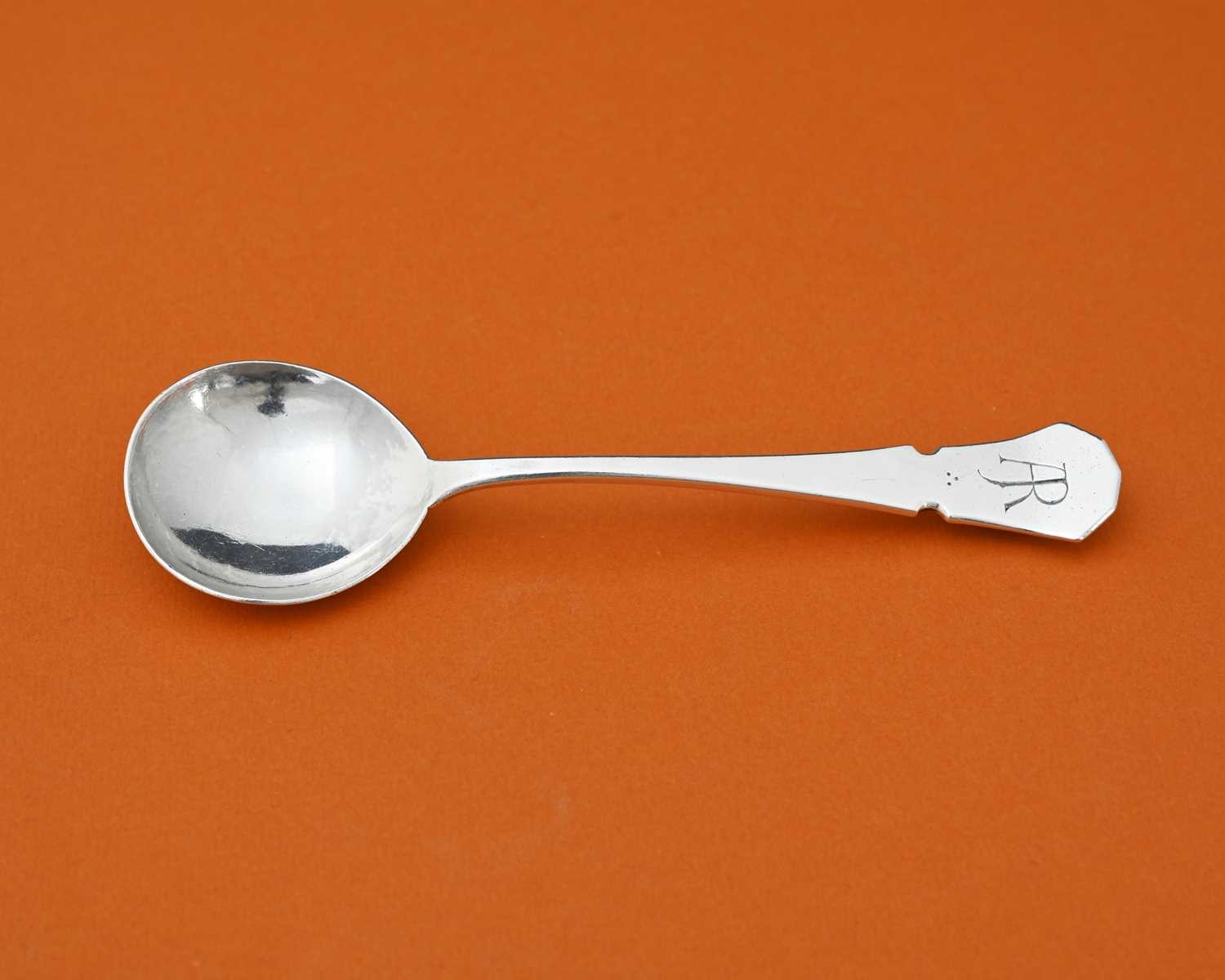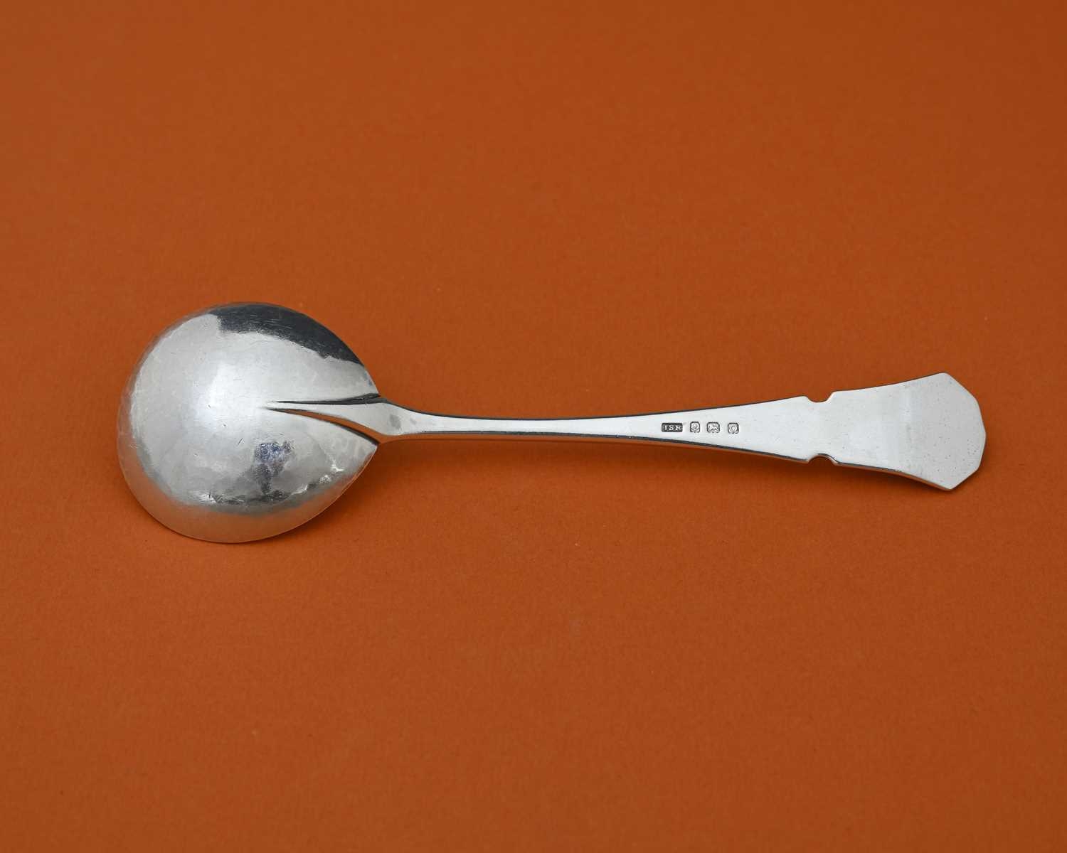 John Sidney Reeve, an Arts and Crafts silver spoon, Birmingham 1938, the planished rounded bowl with rat tail on a tapered stem with canted and notched terminal, 16cm long, 1.47ozt