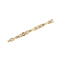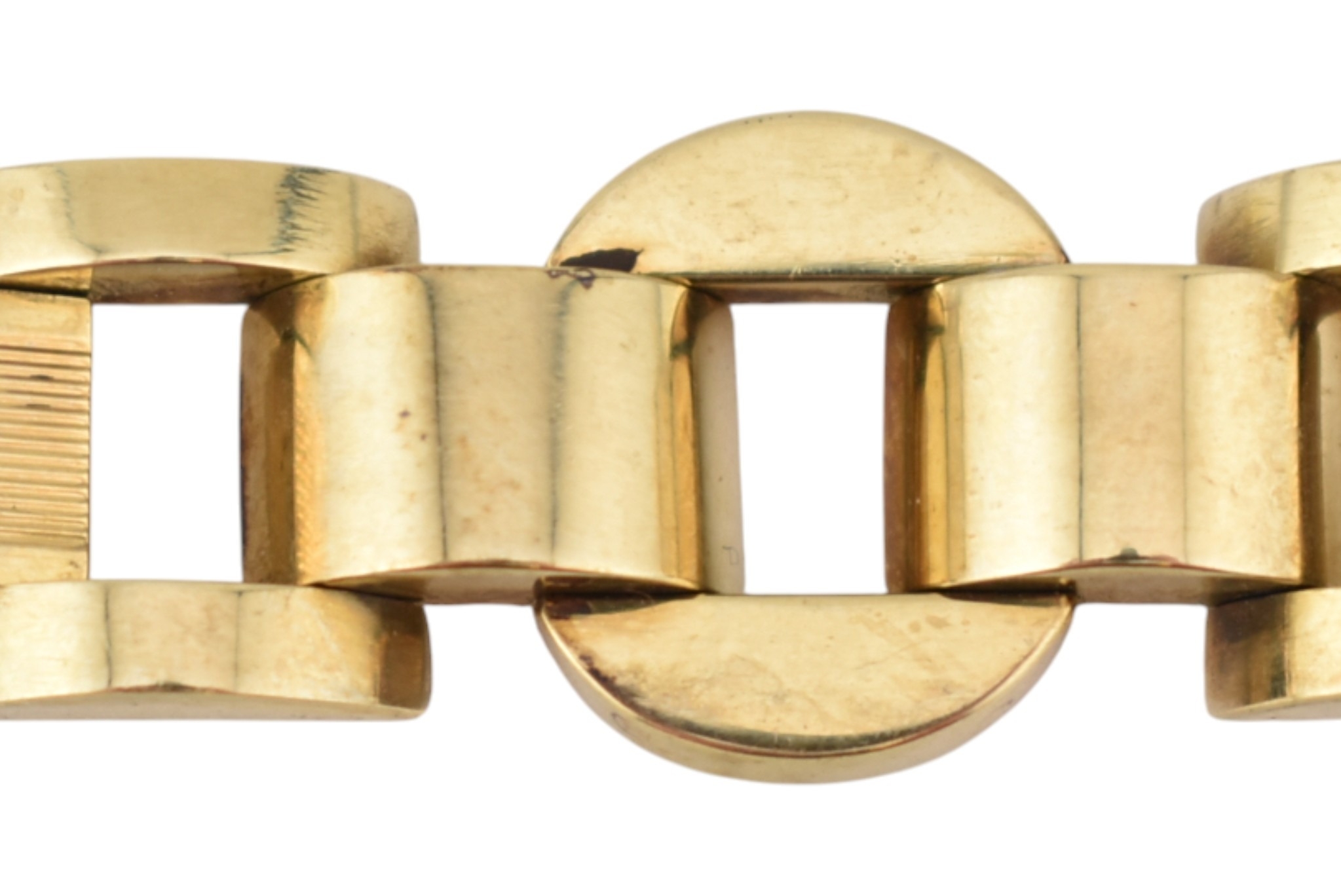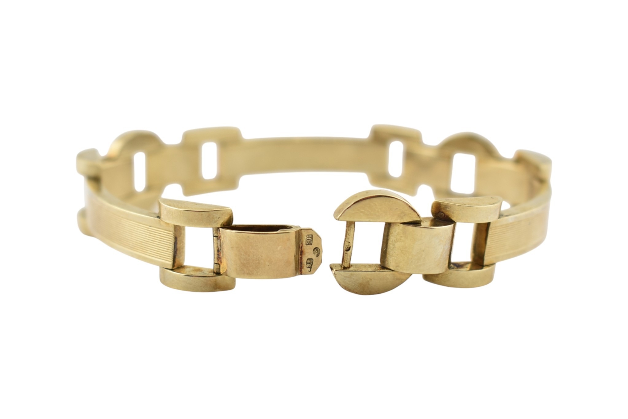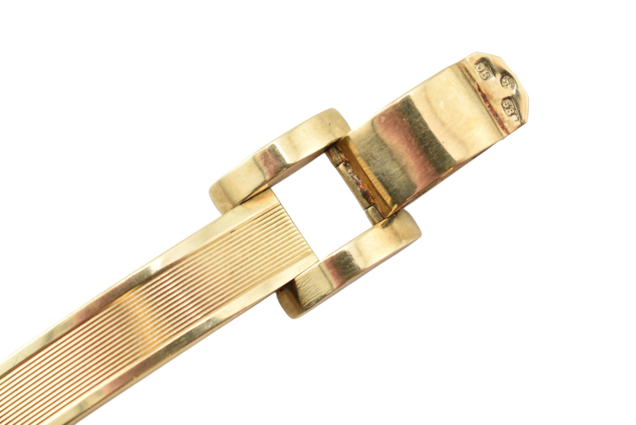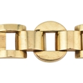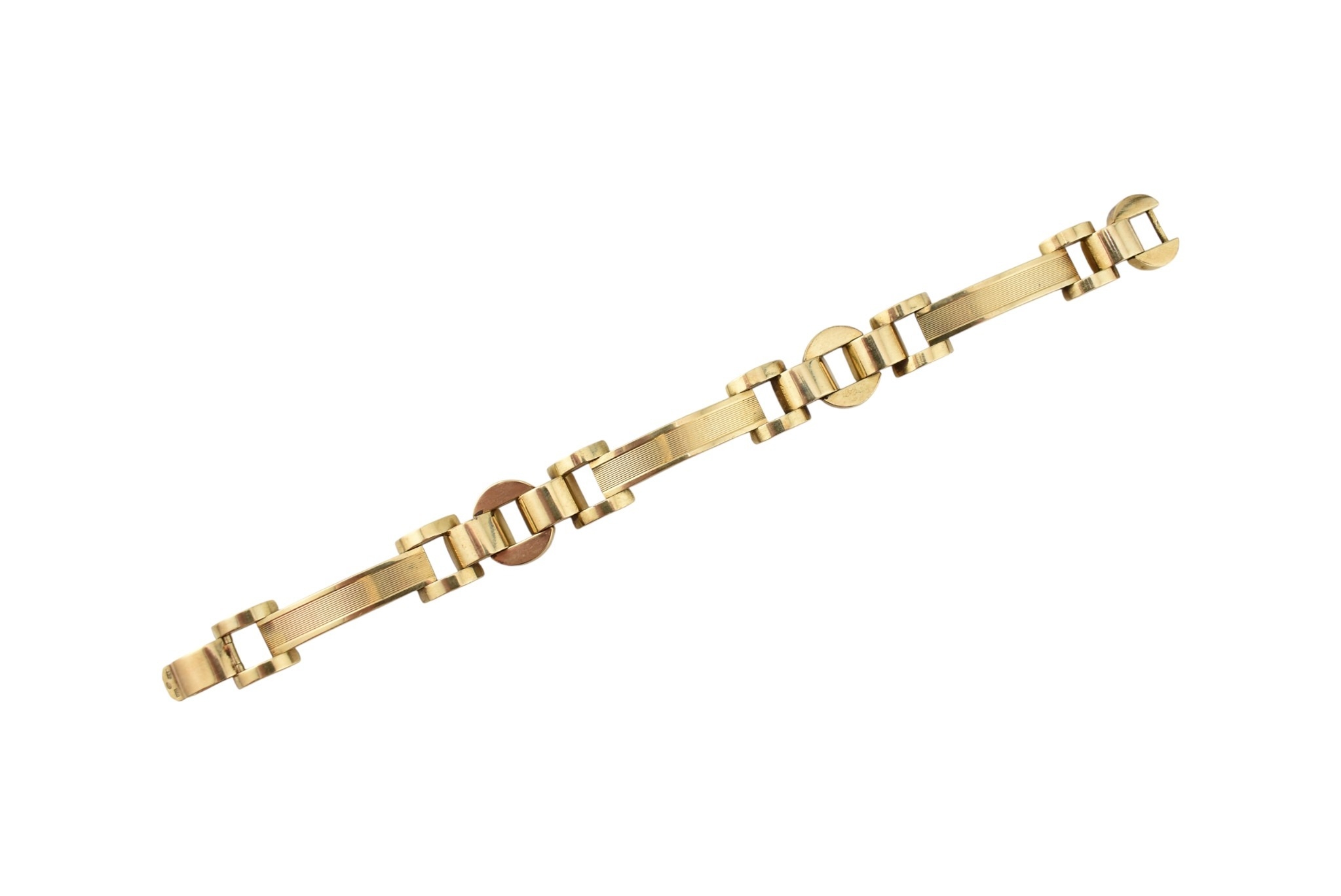 A 14ct gold retro tank bracelet. The bracelet with engine turned and arced and semi-circular links to clip clasp. Assay marks to clasp for 14ct gold. Total weight 17.3g. Measures 18.5cm.