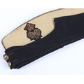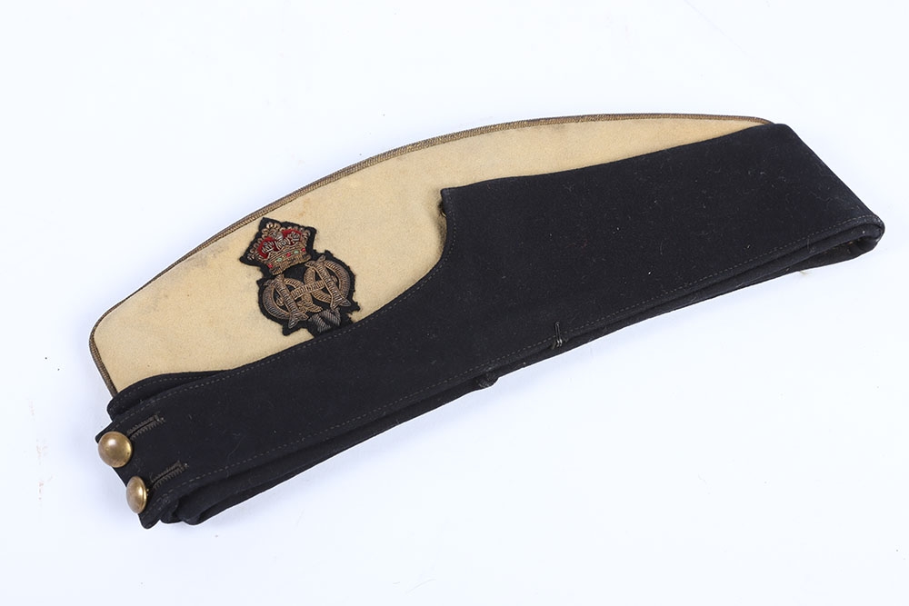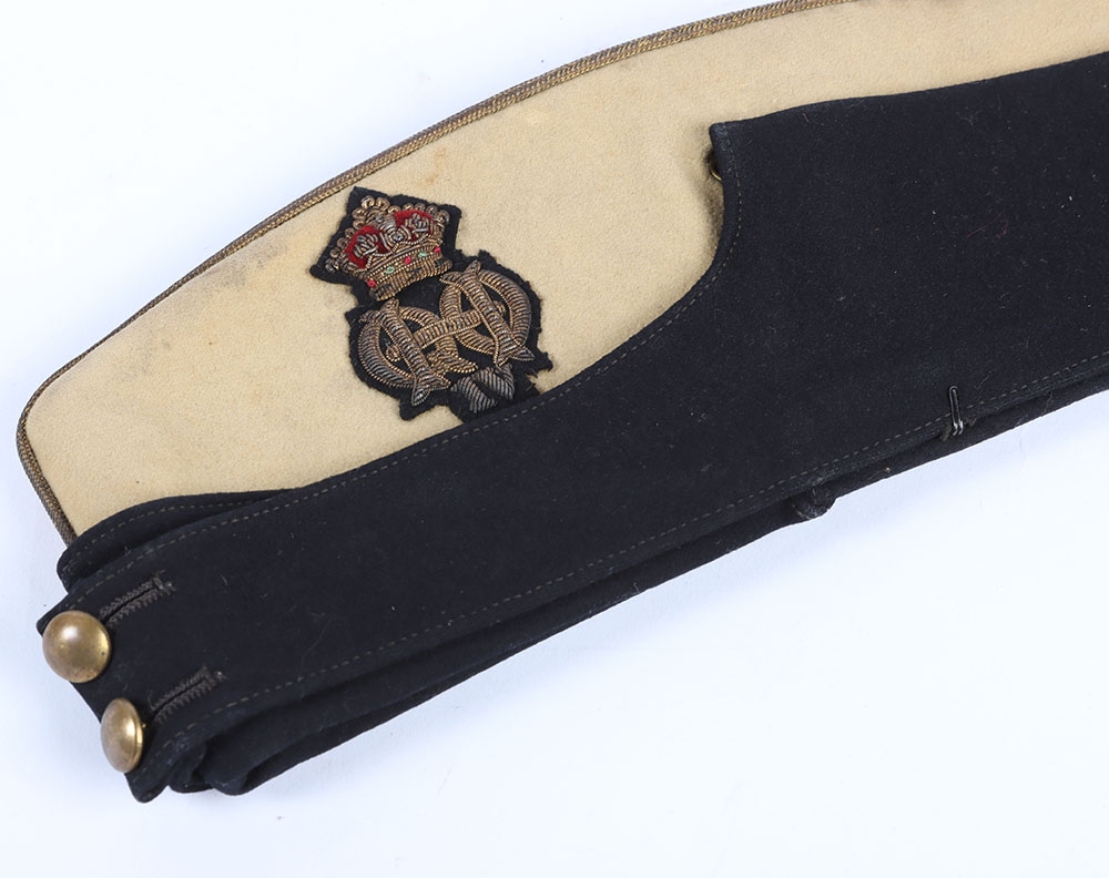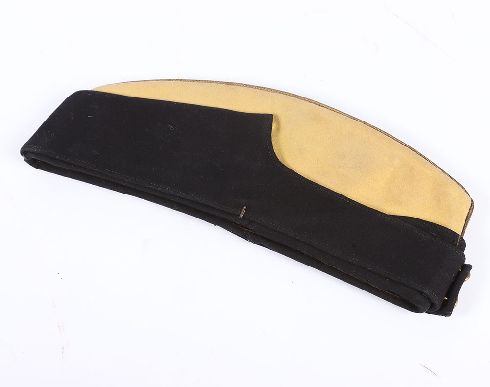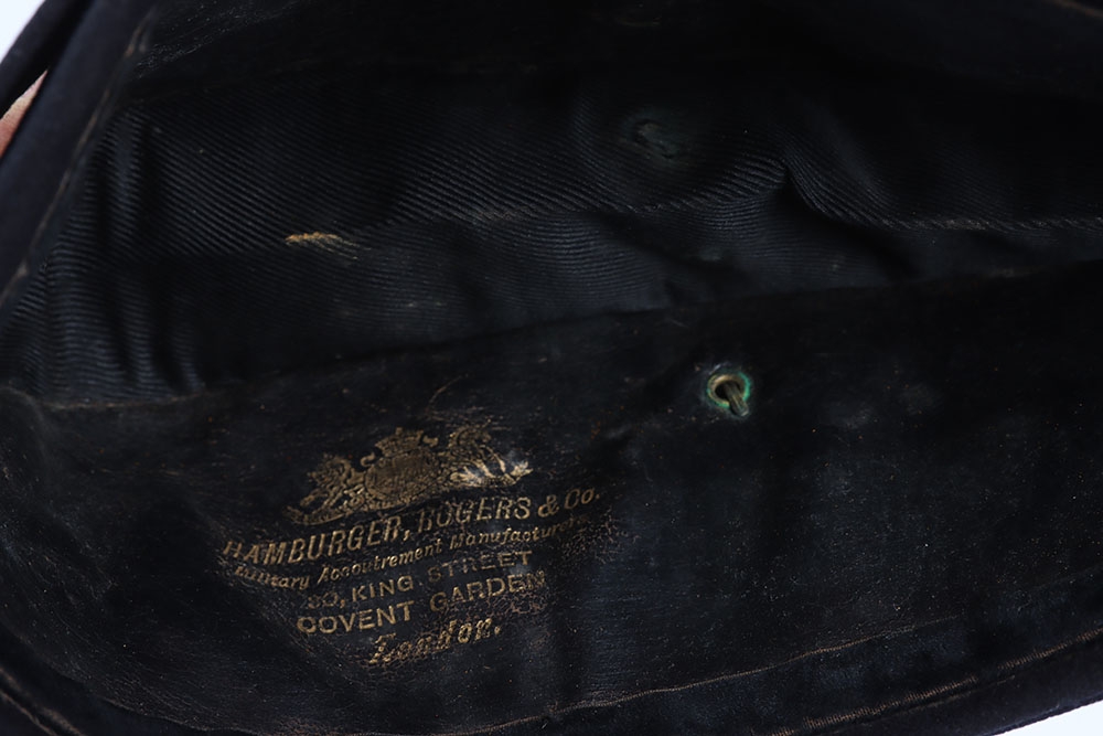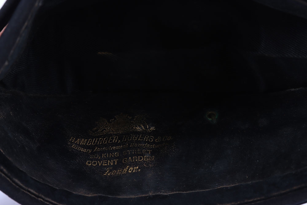 Scarce Victorian 4th Queens Own Hussars Officers Coloured Field Service Cap, buff coloured body with black crown and curtain with gold wire piping to the top section. Plain brass buttons to the front. Bullion embroidered regimental badge. Hamburger Rodgers & Co London retailers gilt tooled details to the interior lining. Remains in very good overall condition.