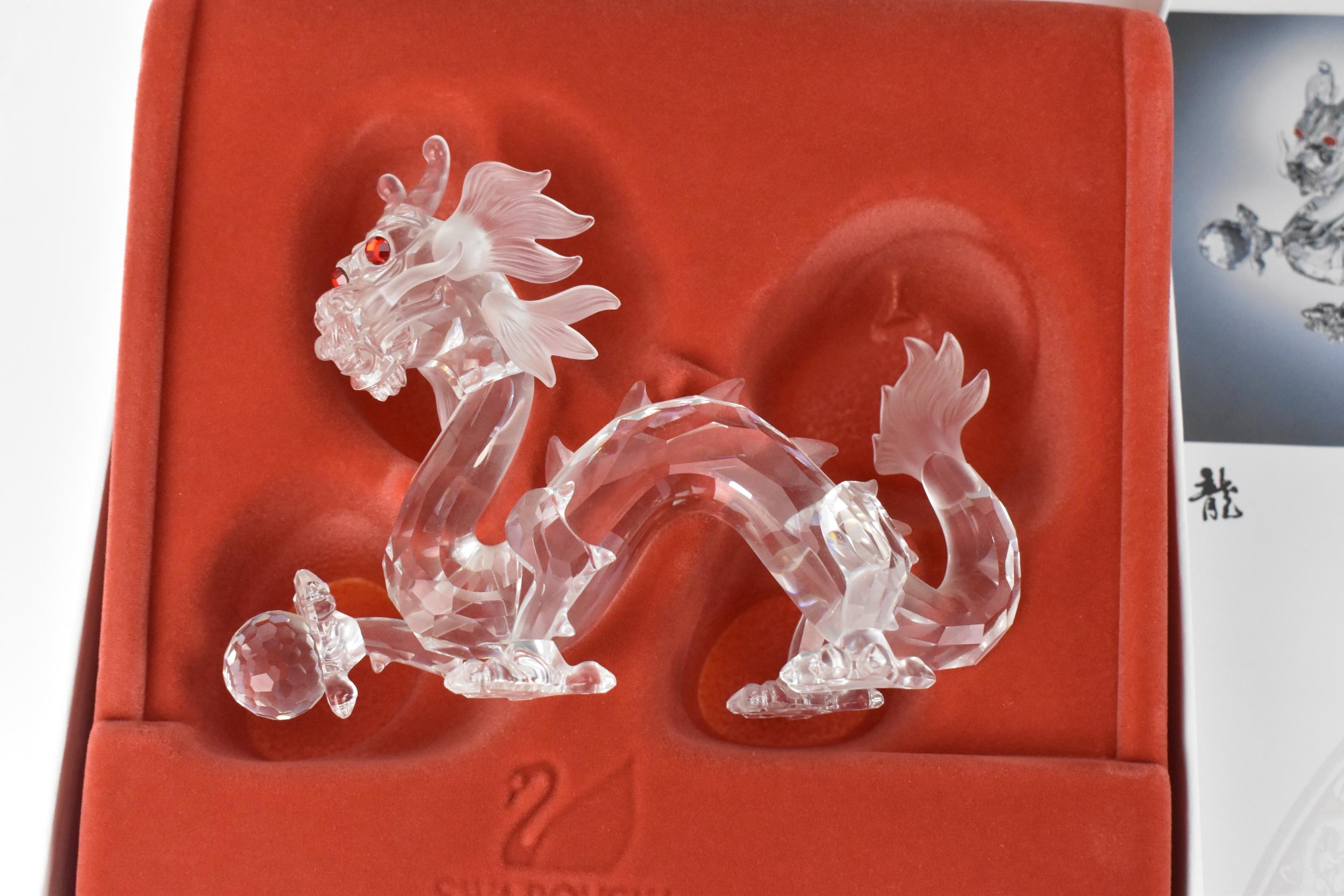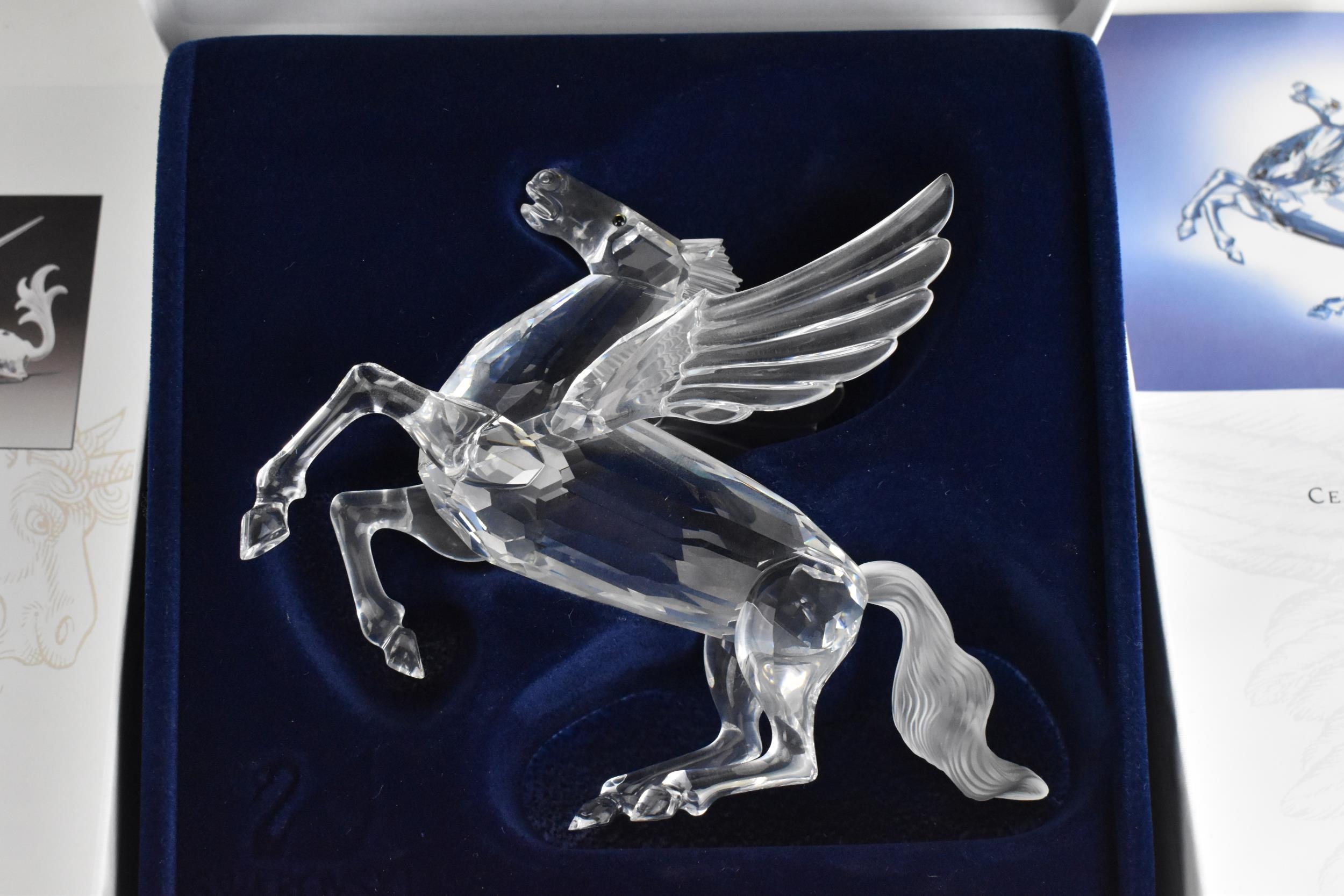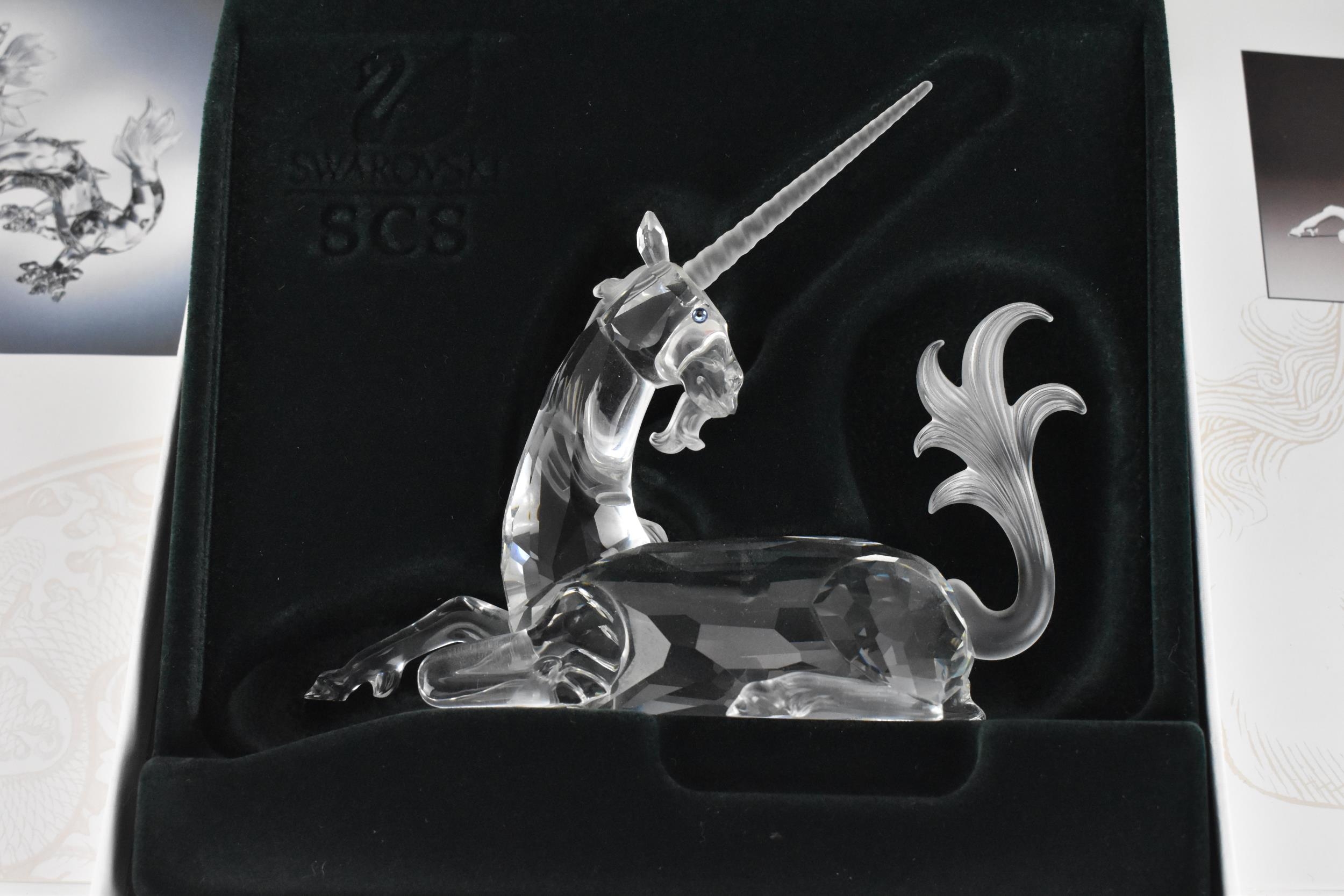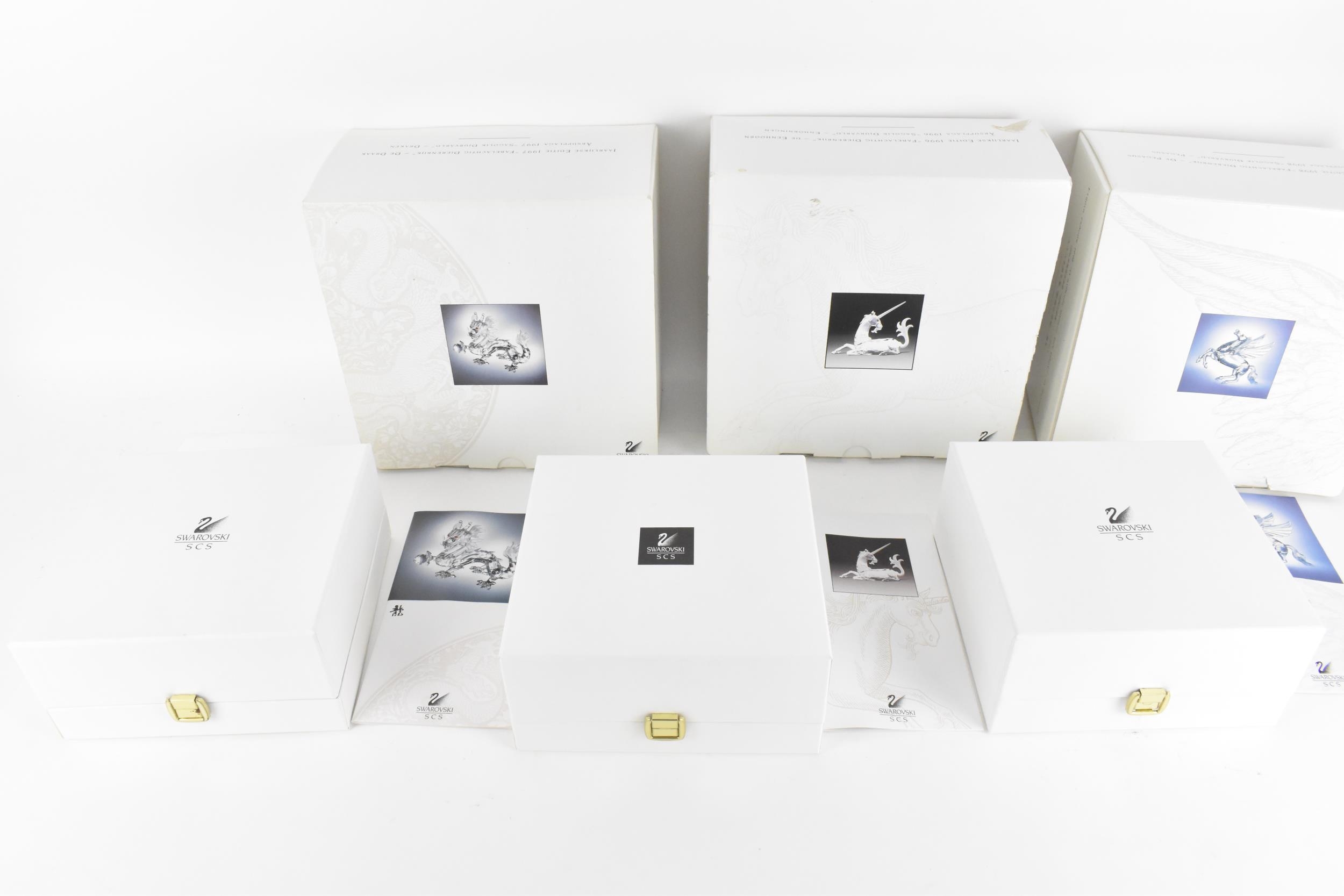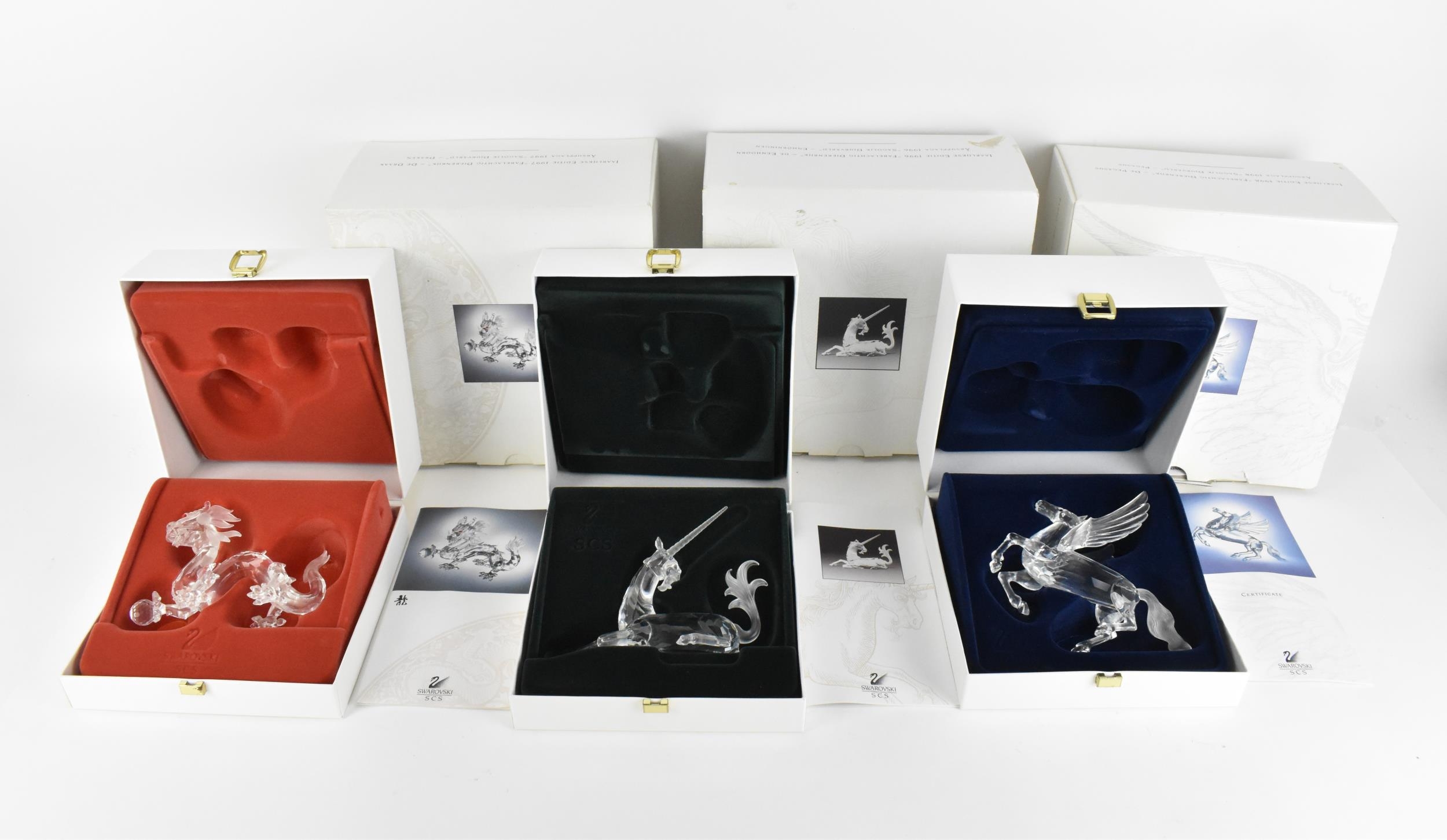 A set of three Swarovski CSC 'Fabulous Creatures' crystal figures, comprising the 'Unicorn' 1996, 'Pegasus' 1998, and 'dragon' 1997, each in original padded box and outer cover, with certificate