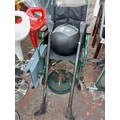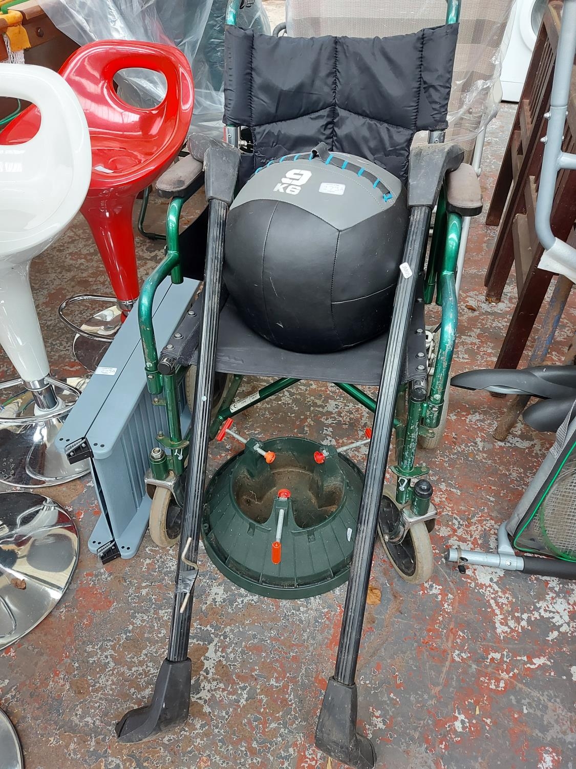 A mixed lot of five items to include a grey plastic pet loading ramp, a black and green folding wheelchair, car roof bars, christmas tree stand and men's health active plus 9 kilo exercise ball