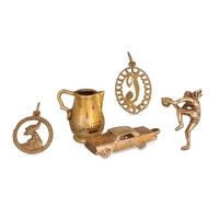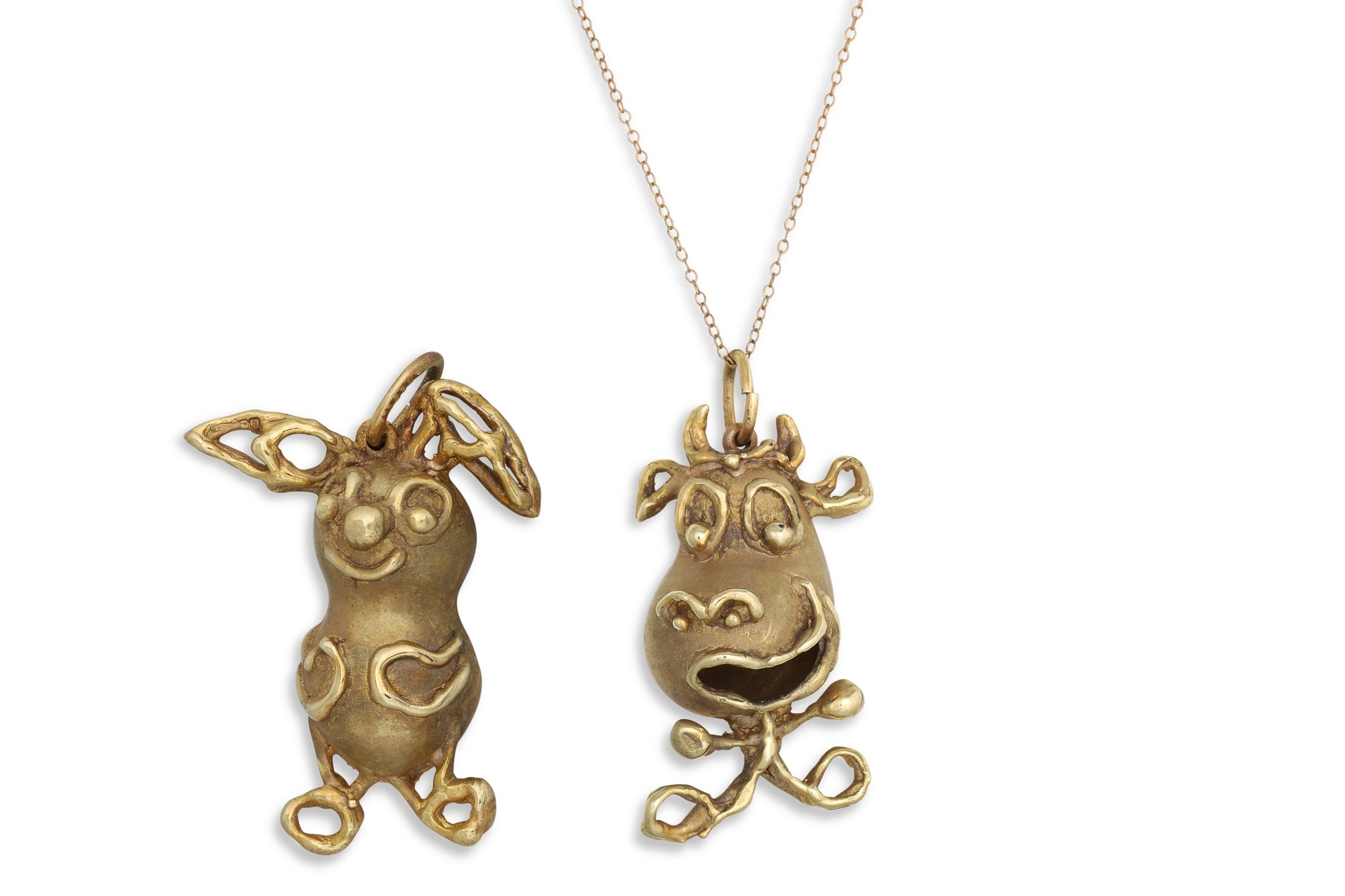 TWO 1970'S 14CT GOLD PENDANTS, in abstract form of cow and rabbit, together with a 9ct chain, weight of pendants: 21.5 g