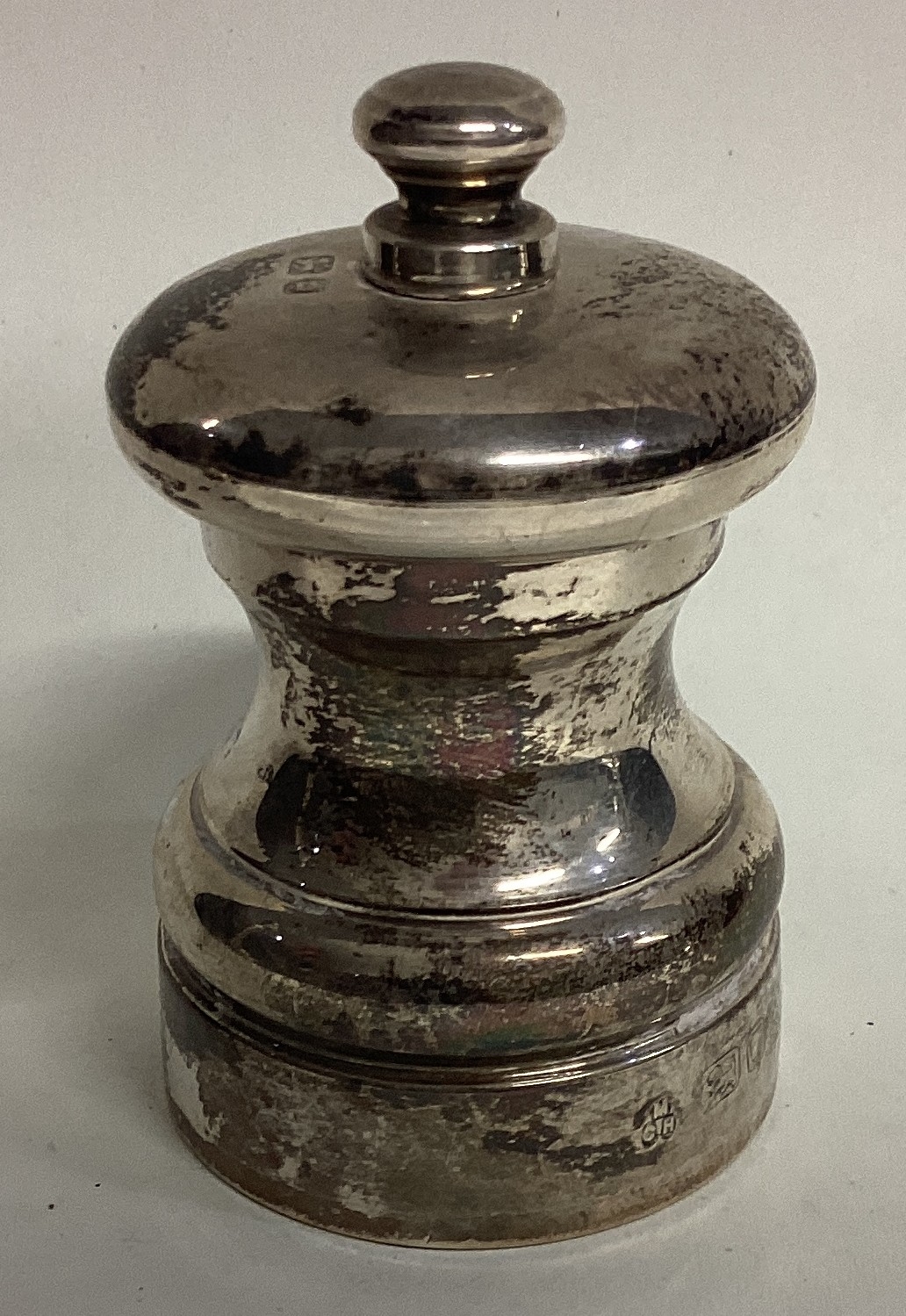 A silver pepper grinder of cylindrical form. London. Approx. 108 grams of gross weight. Est. £20 - £30.