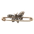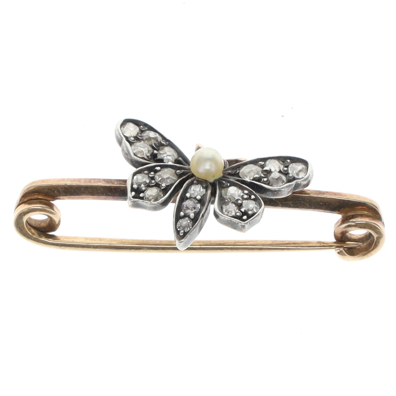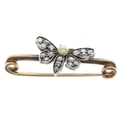 Diamond, Pearl and Ruby Gold and Silver Butterfly Brooch. This piece has tested as 9ct gold and silver. There is moderate wear and scratches to the metal and stones, all secure. There are some chips and nibbles to some stones. The pin and clasp are in working order. The brooch measures approximately 3.8cm in length, weighs in total 5.2g.