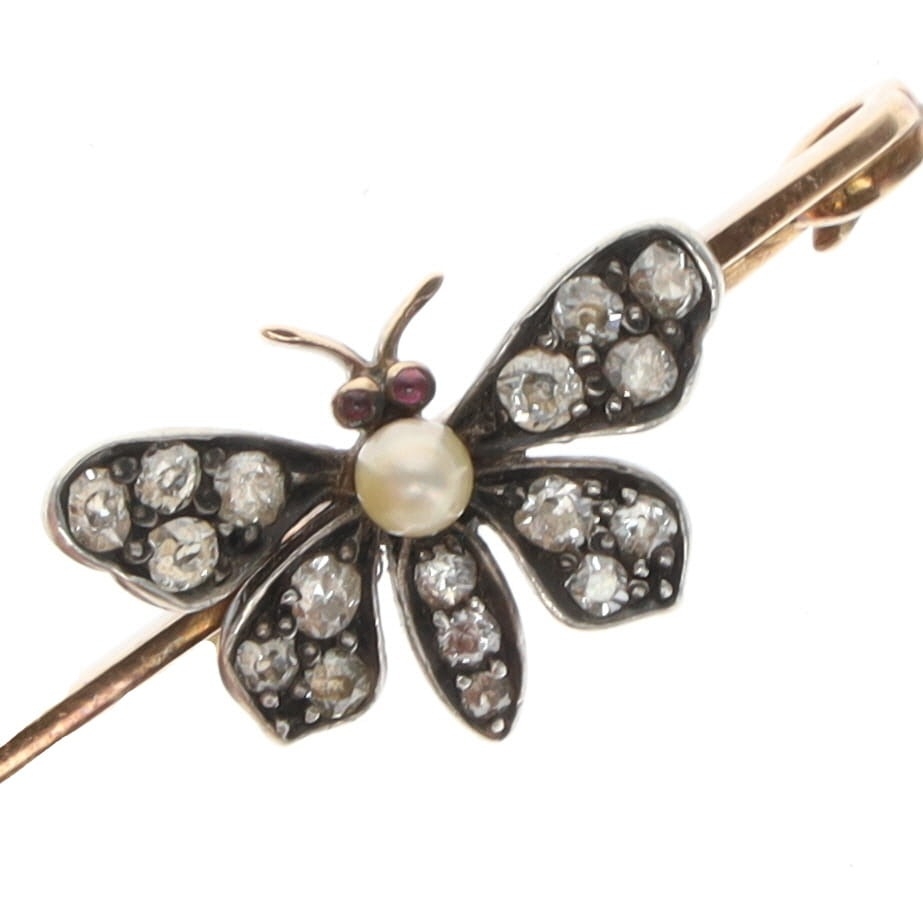 Diamond, Pearl and Ruby Gold and Silver Butterfly Brooch, 5.2g