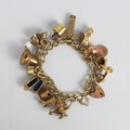 A yellow metal charm bracelet, the curb link bracelet suspending eighteen gold coloured and yellow metal charms, including a harmonica, scooter, and aladdin lamp, gross weight 54gms