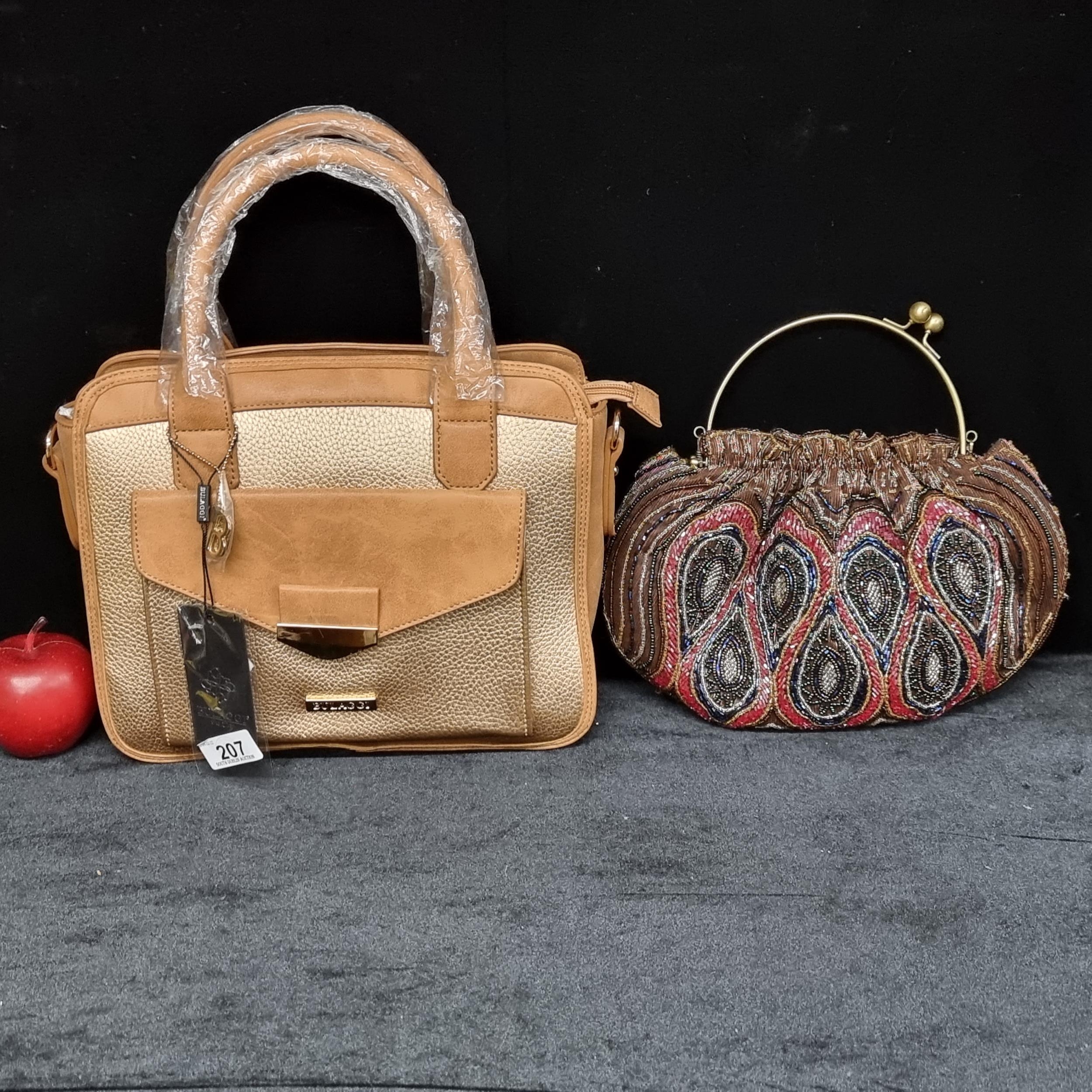 Two handbags, including a lovely ornately beaded example with peacock colourful pattern. Together with a "Bulaggi" brand new beige bag.