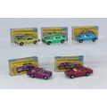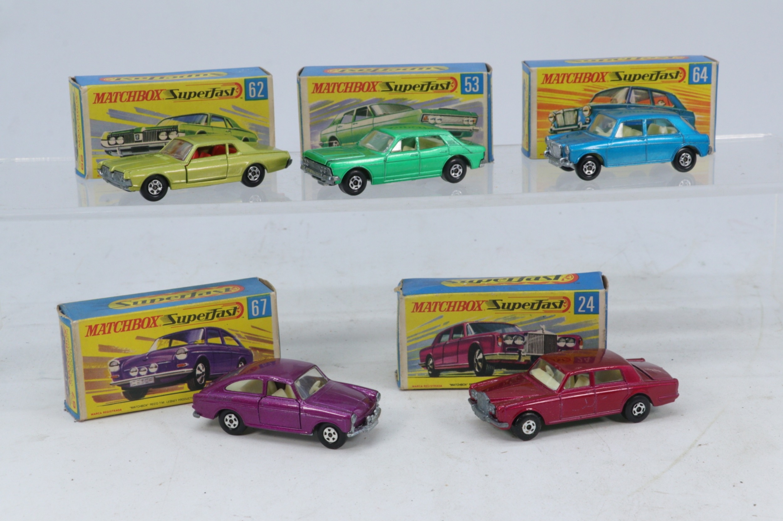 Five boxed Matchbox superfast diecast vehicles to include 67 Volkswagen 1600TL, 24 Rolls Royce Silver Shadow, 62 Mercury Cougar, 53 Ford Zodiac Mk. IV and 64 MG 1100