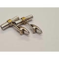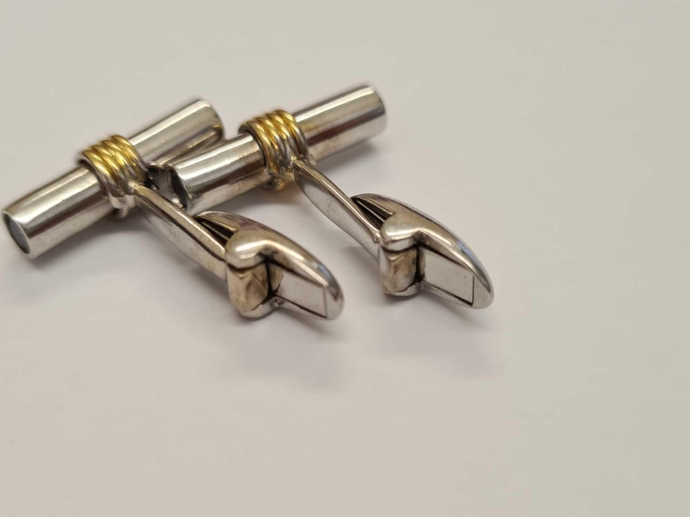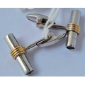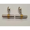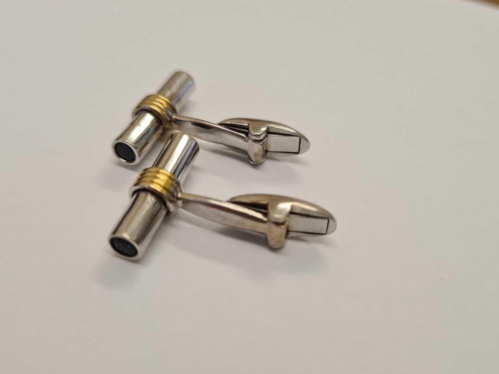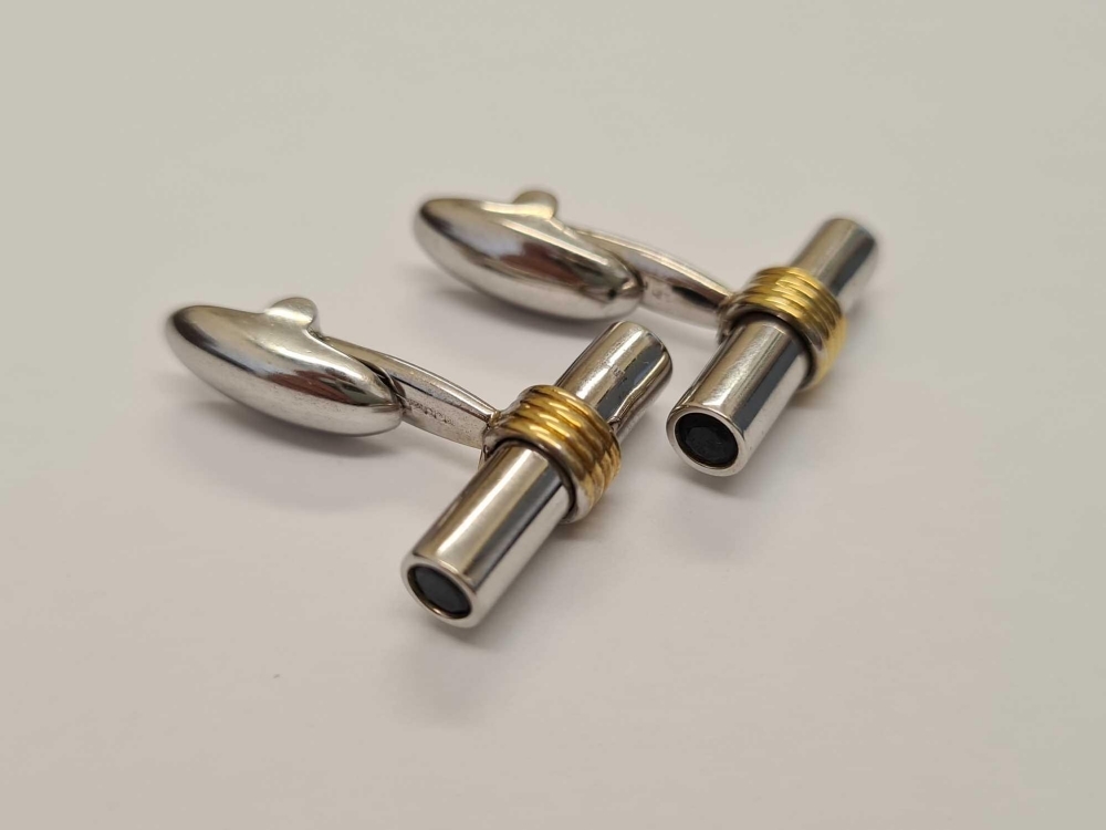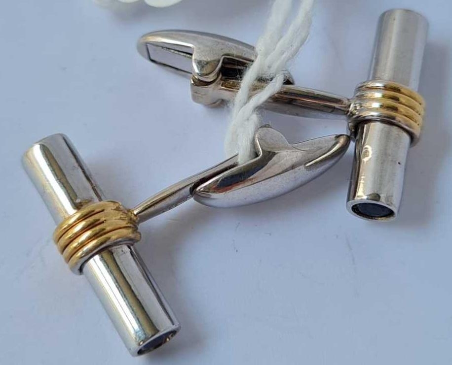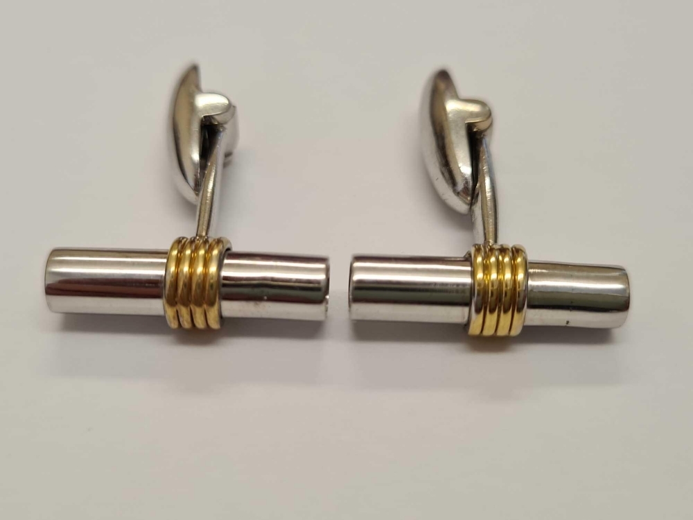 A PAIR OF SUPERB TWO COLOUR GOLD TUBULAR CUFFLINKS WITH TWO LARGE SAPPHIRES TO EACH END IN 18CT GOLD - 11 GMS