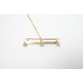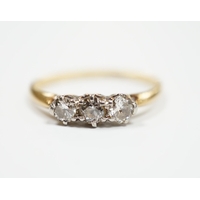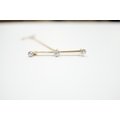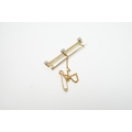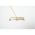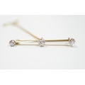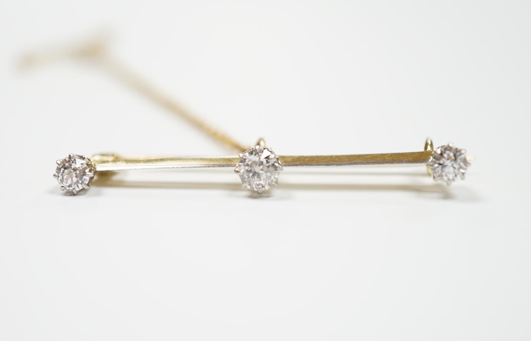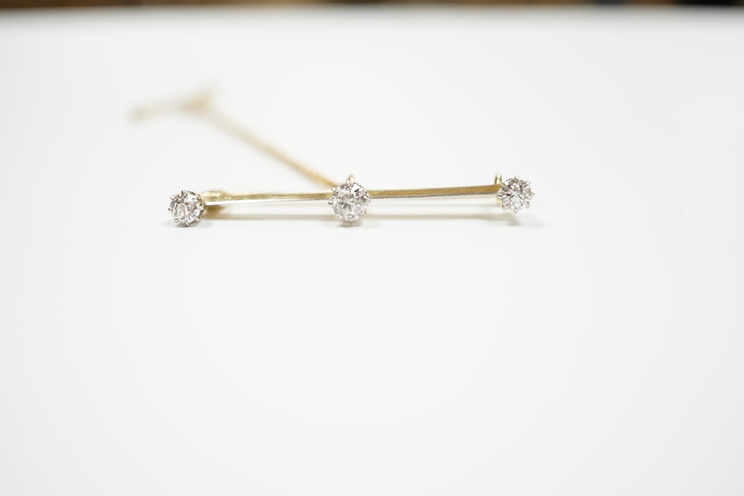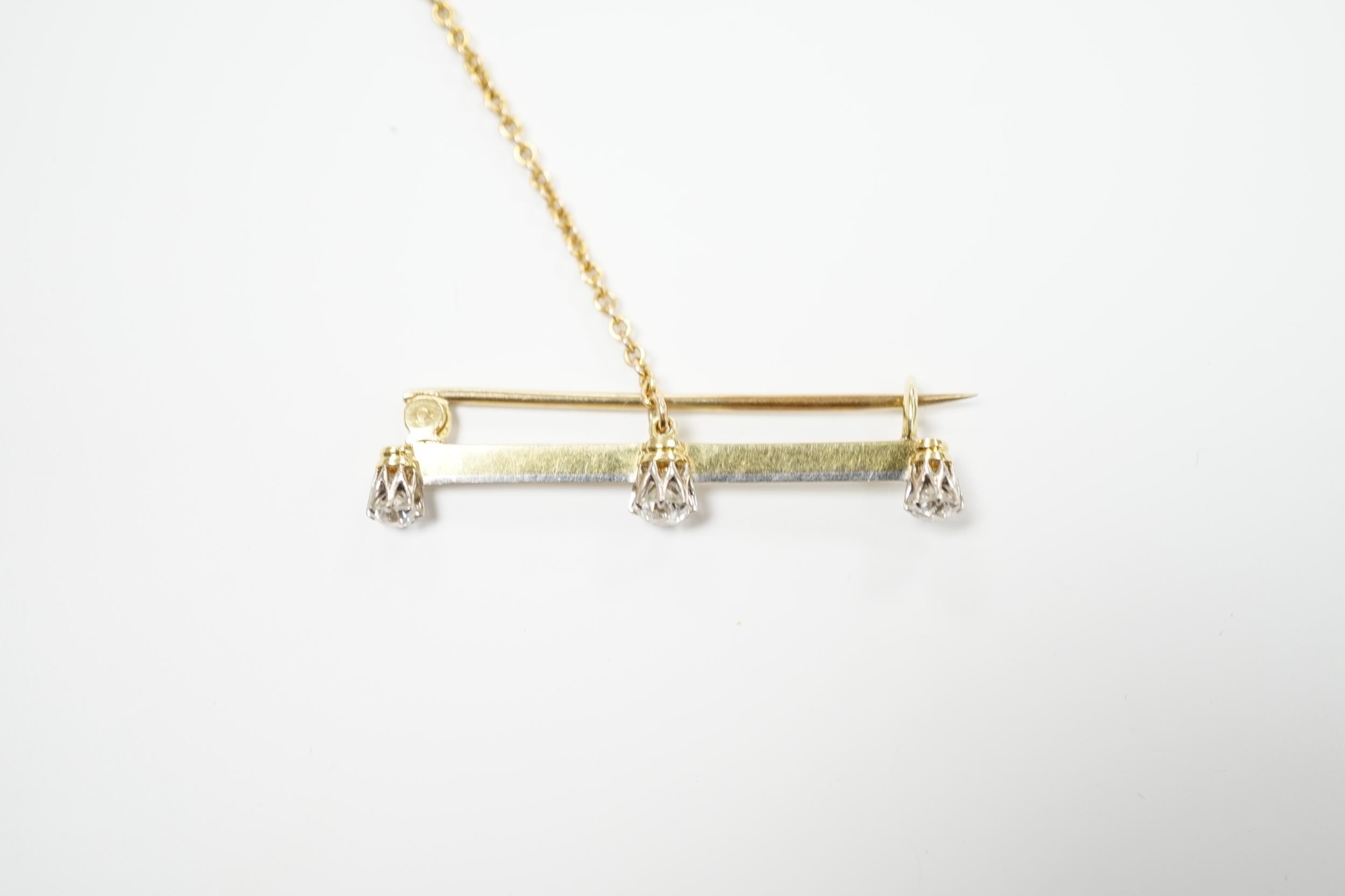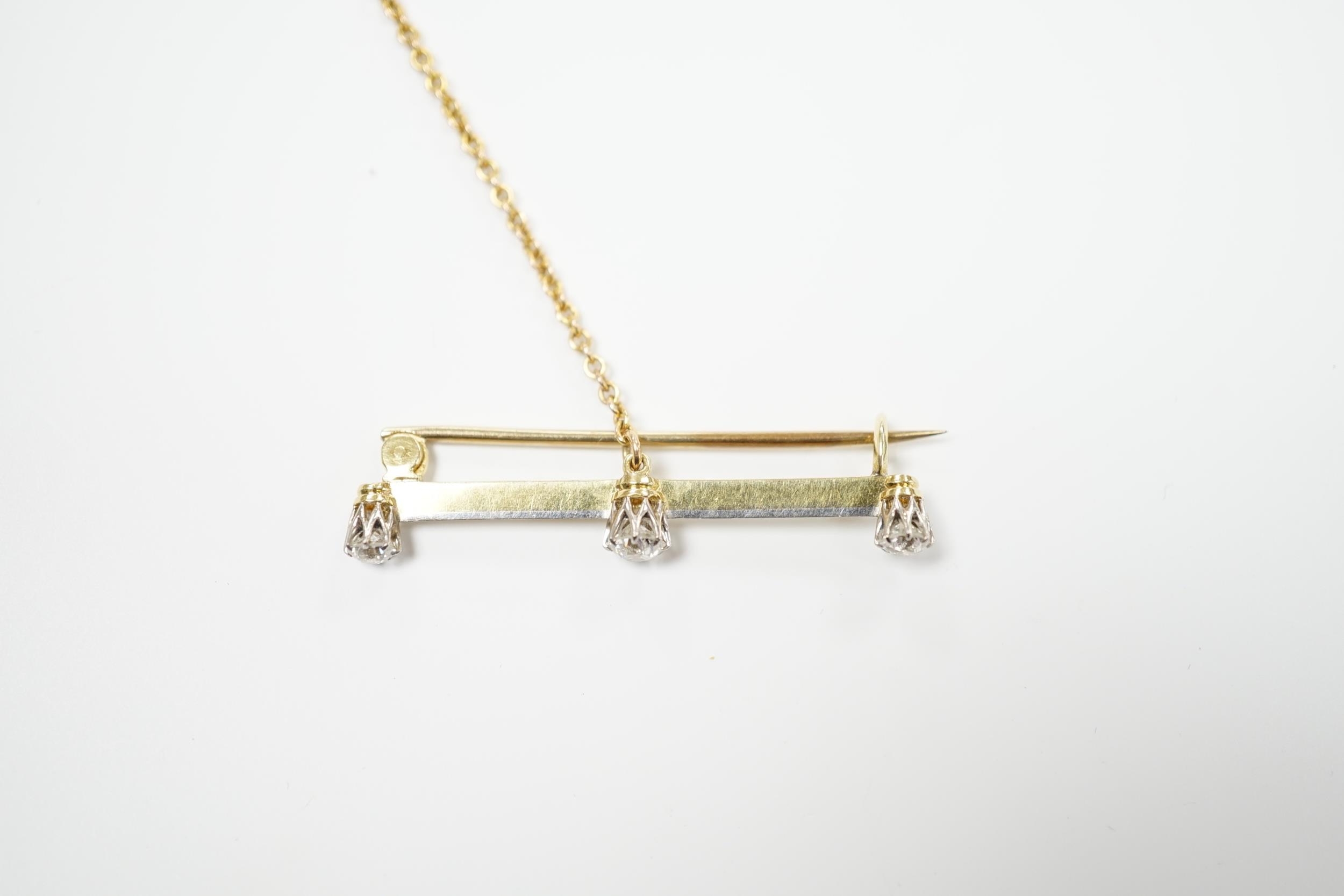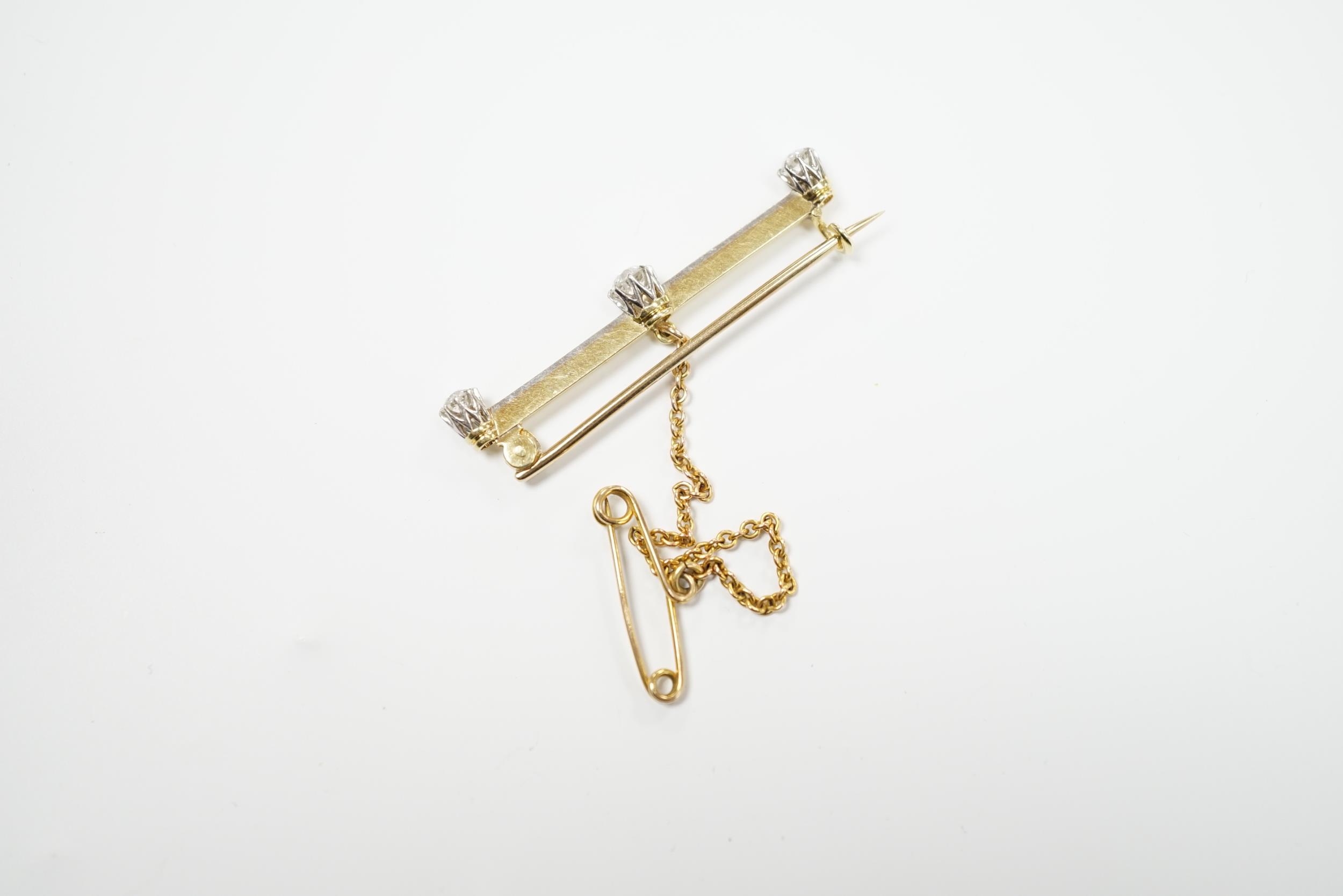 A yellow metal and three stone diamond set bar brooch, 37mm, with safety chain, gross weight 3 grams.