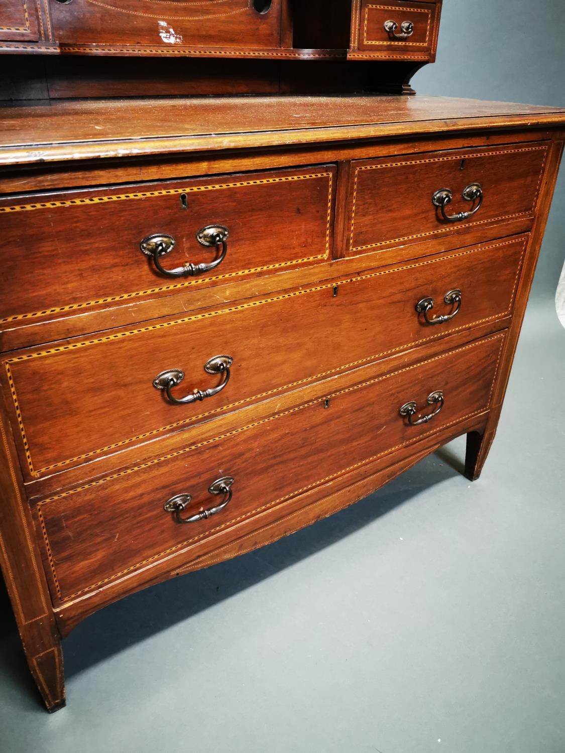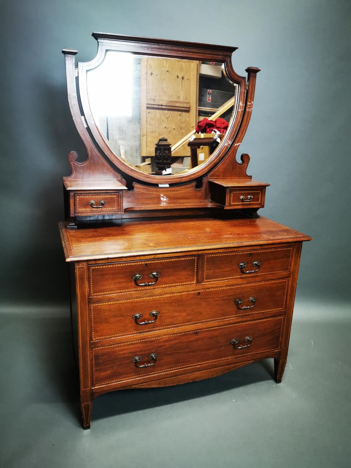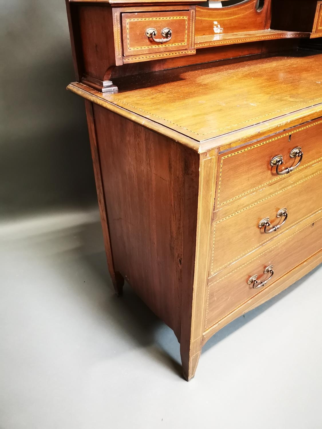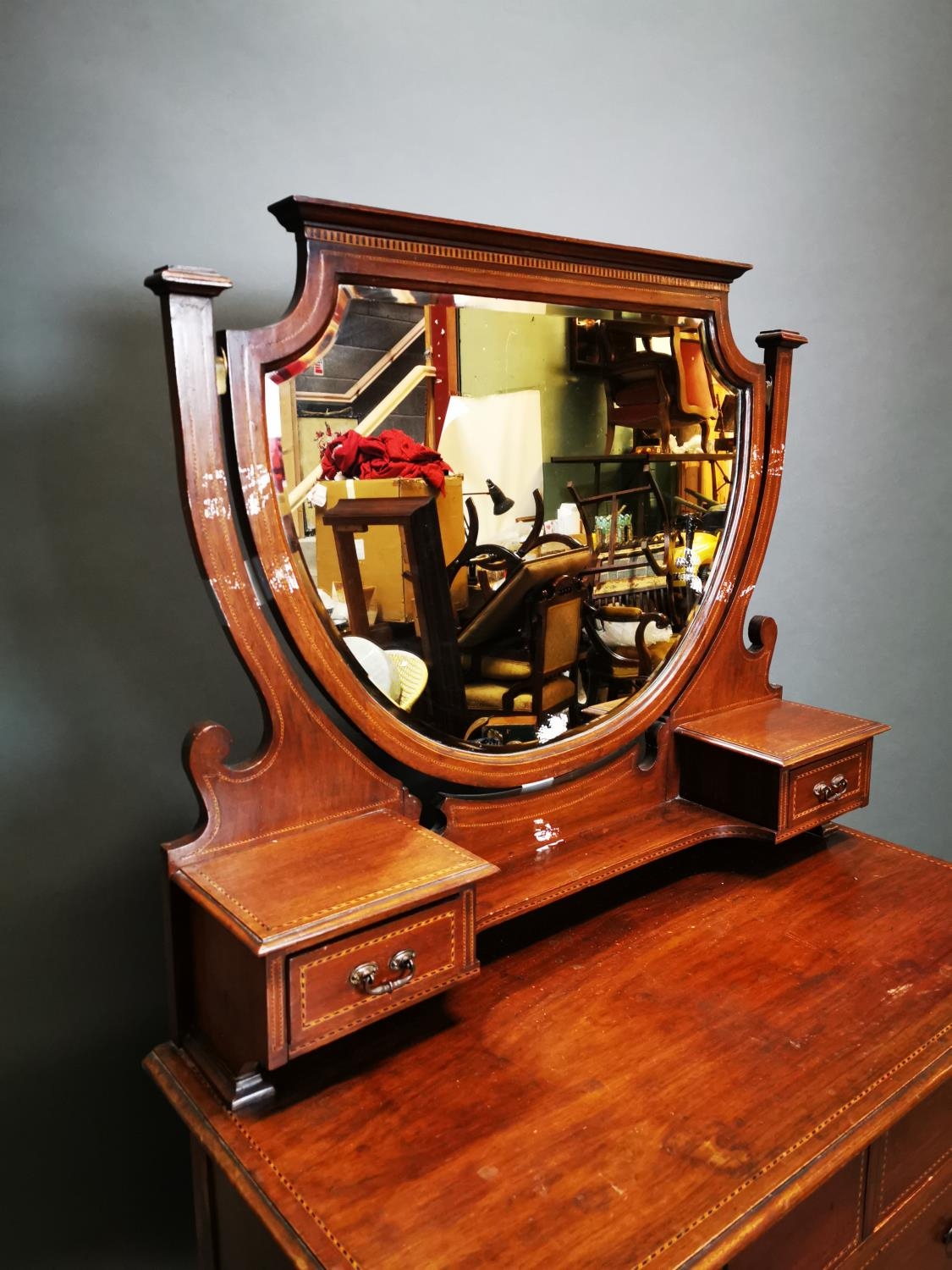 Edwardian inlaid mahogany mirrored back dressing table {163 cm H x 107 cm W x 53 cm D}.