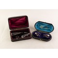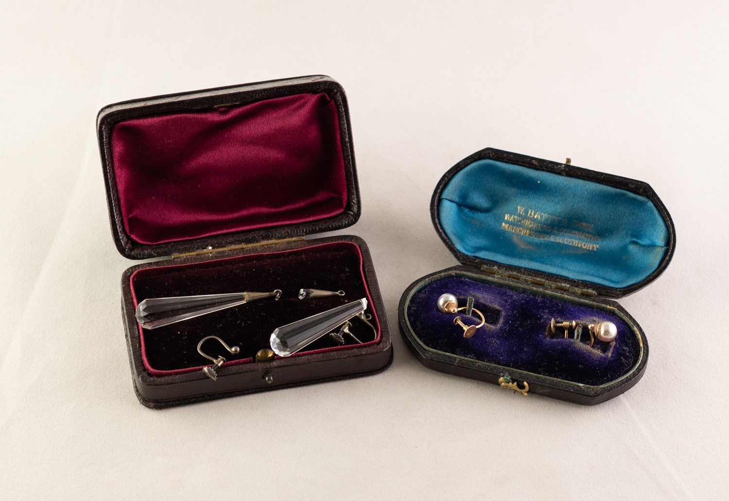 PAIR OF 9ct GOLD SCREW FASTENING EARRINGS EACH SET WITH AN IMITATION PEARL, in morocco fitted case; a PAIR OF SILVER EARRINGS with long tear shaped crystal drops (as found), in case (4)