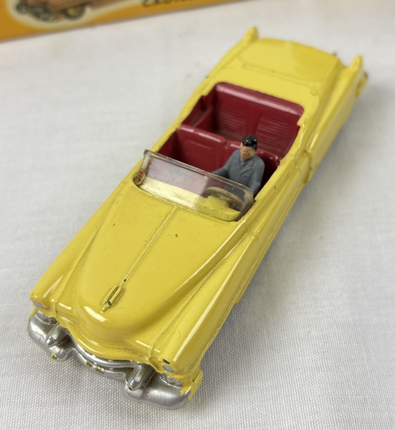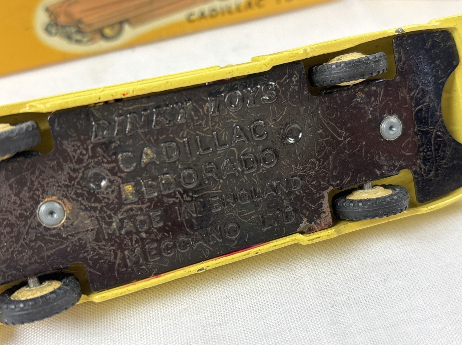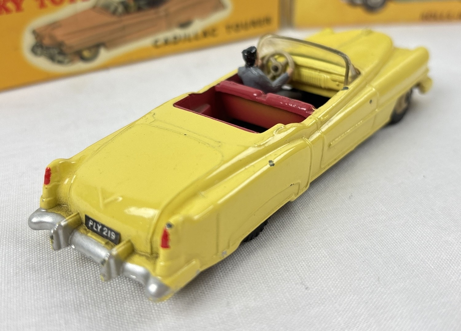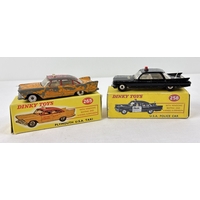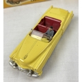 2 vintage 1960's Dinky Toys diecast cars with reproduction boxes. #127 Rolls Royce Silver Cloud III in metallic blue with orange interior, produced from 1964-66, together with #131 Cadillac Eldorado in yellow with cerise interior and cream hubs, produced from 1957-63.