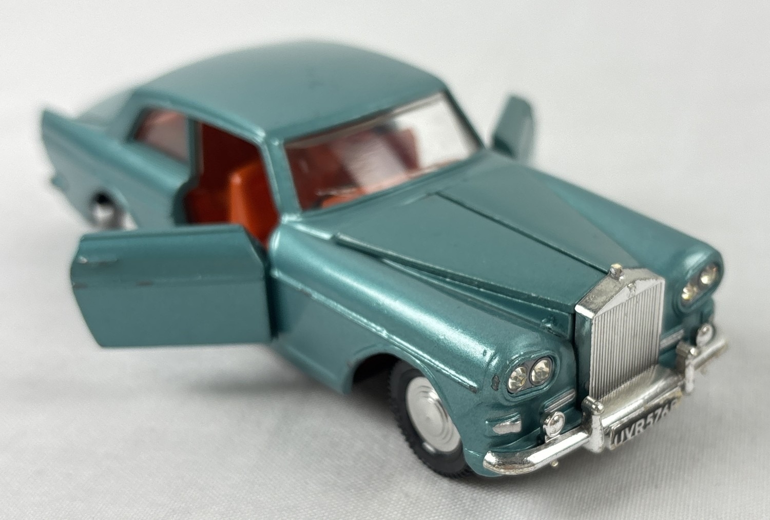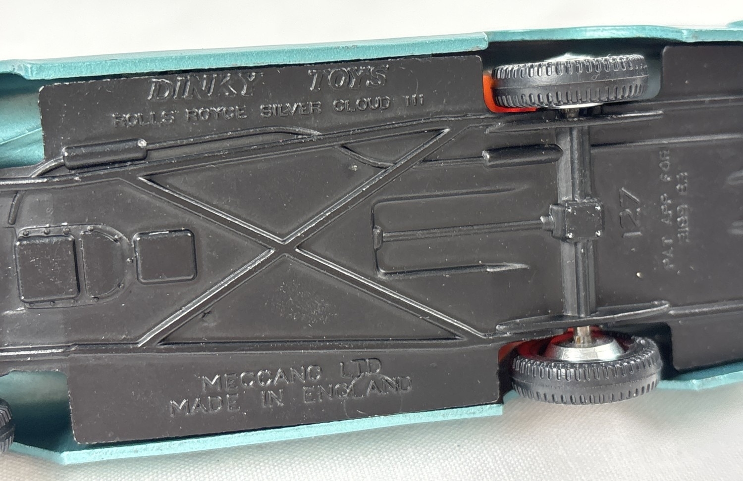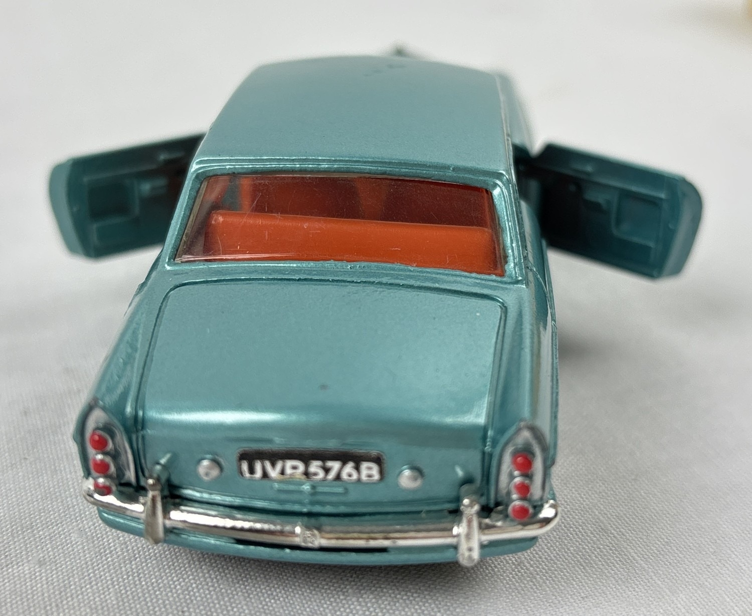 2 vintage 1960's Dinky Toys diecast cars with reproduction boxes. #127 Rolls Royce Silver Cloud III in metallic blue with orange interior, produced from 1964-66, together with #131 Cadillac Eldorado in yellow with cerise interior and cream hubs, produced from 1957-63.