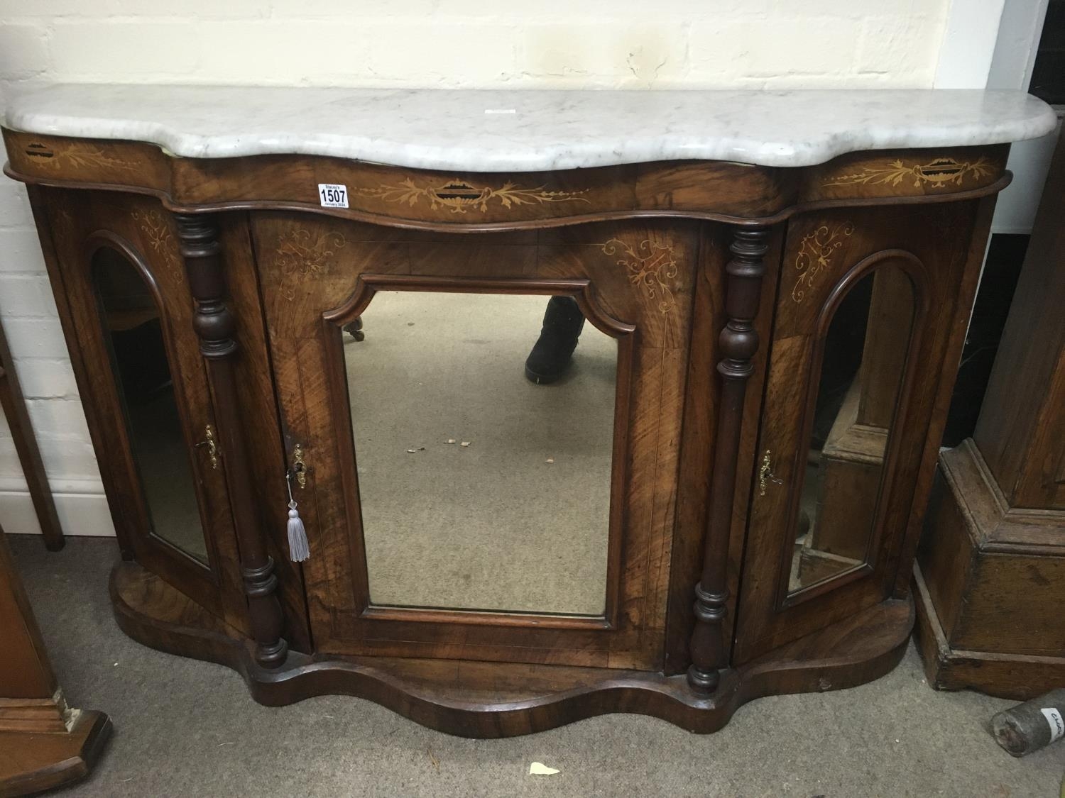 A Victorian serpentine fronted credenza, with marble top above three mirrored doors