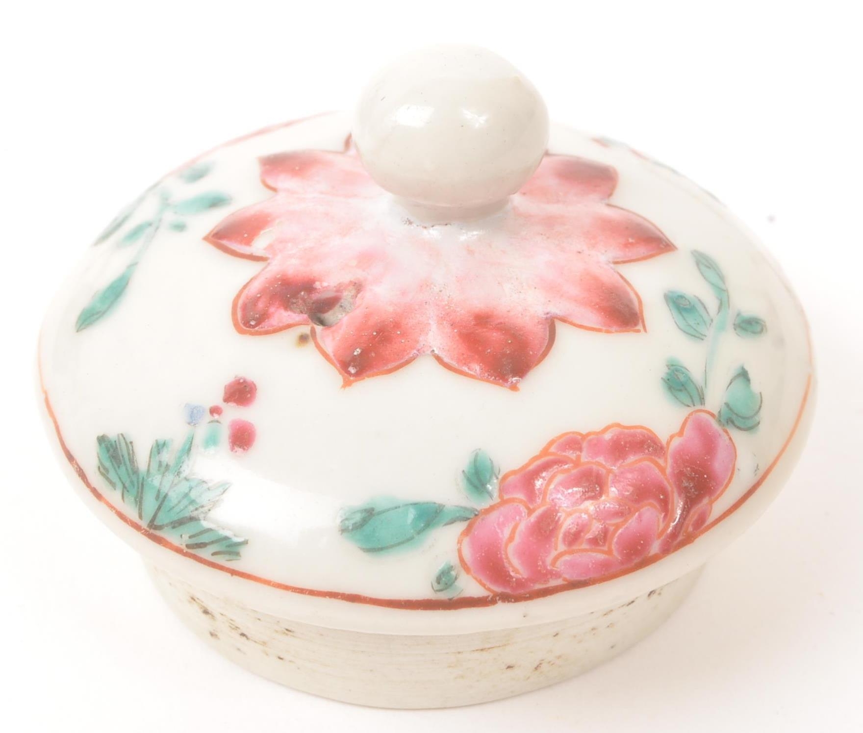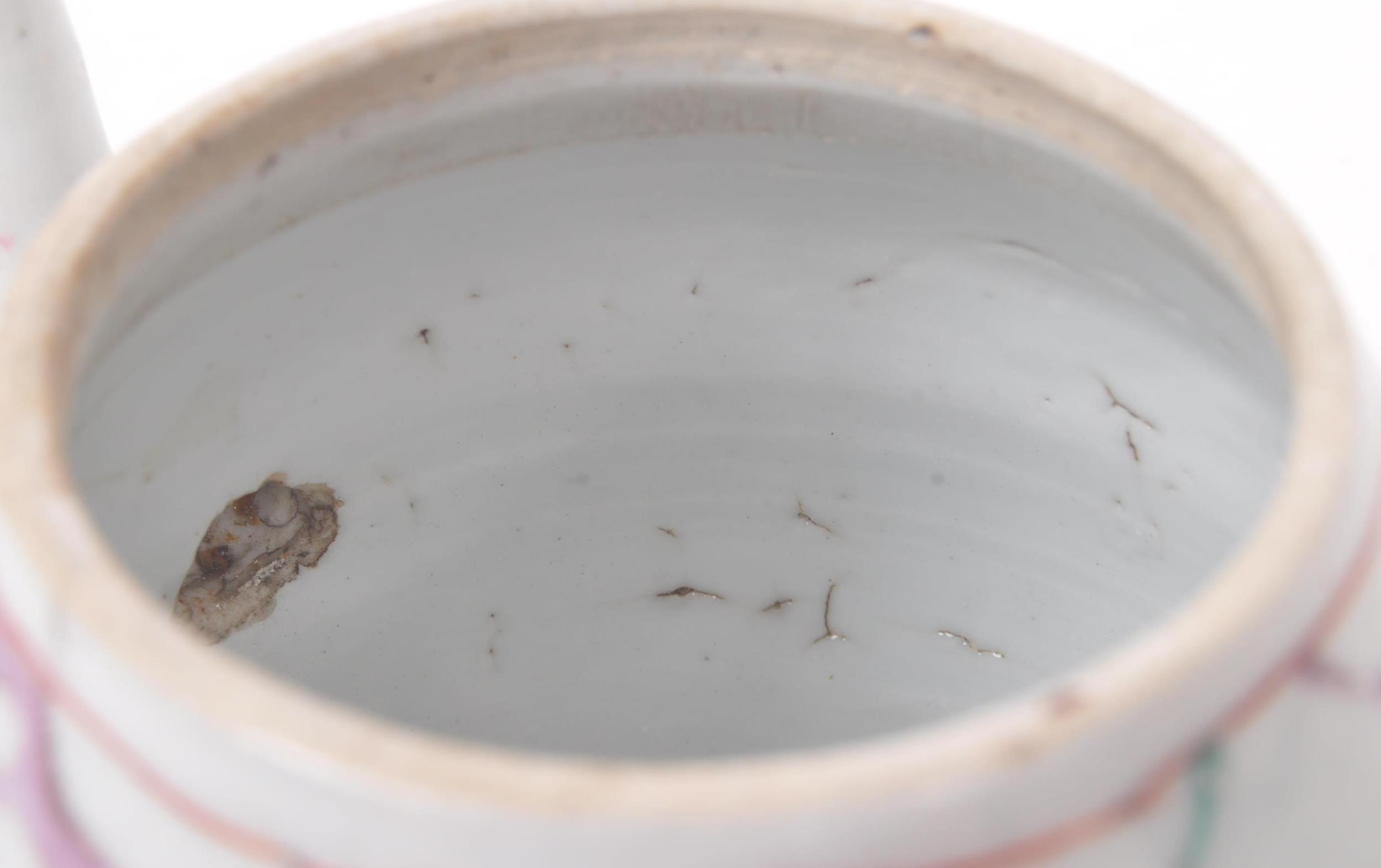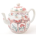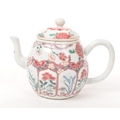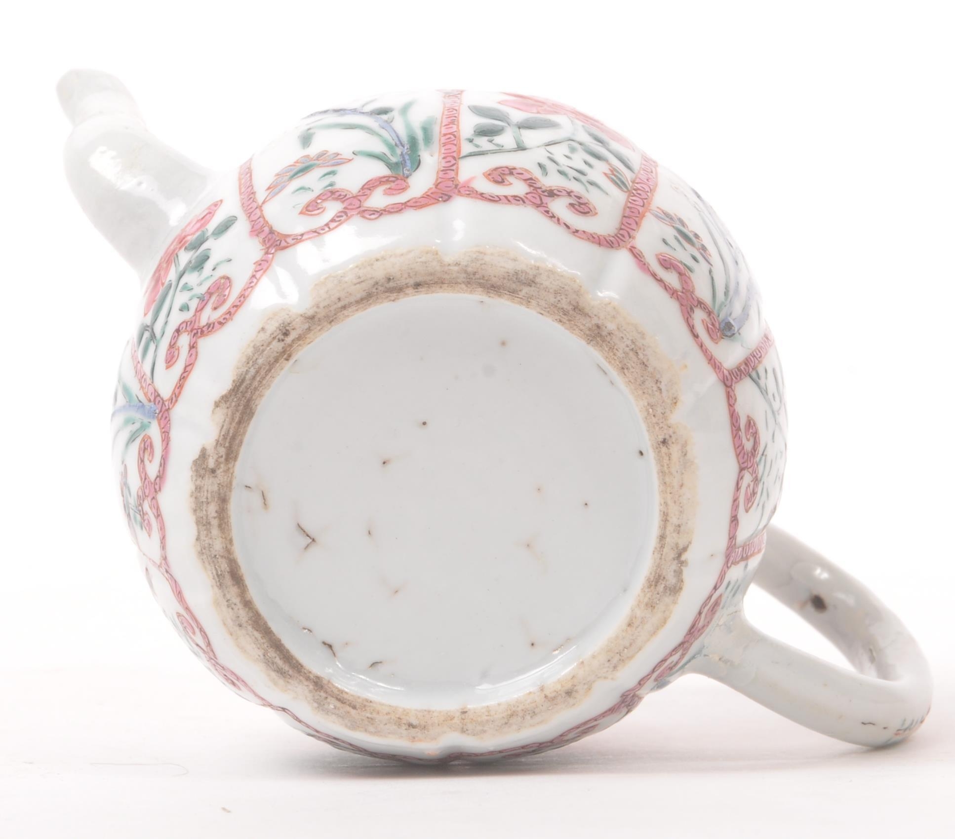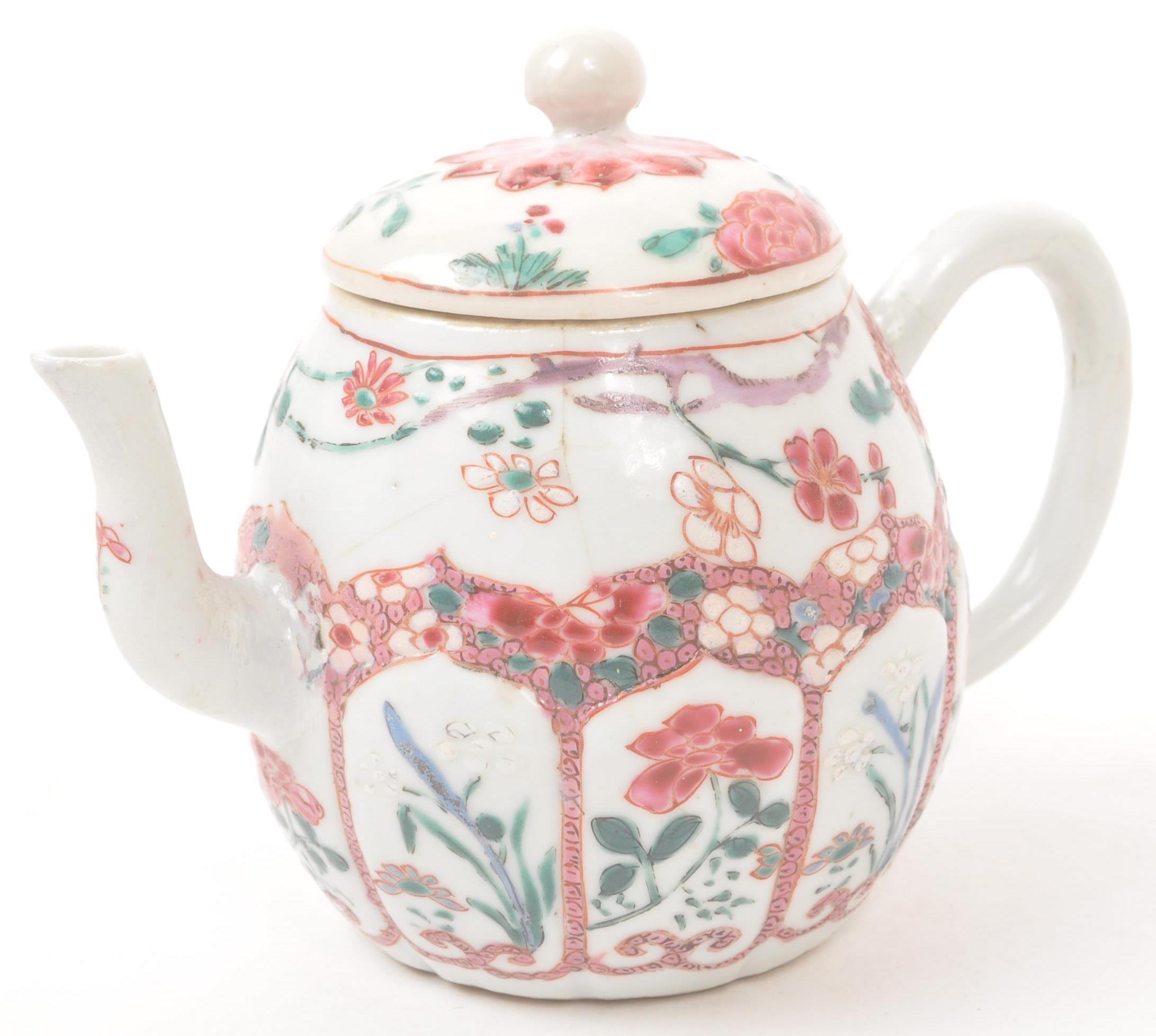 18th century Chinese porcelain china teapot. Hand painted decoration with foliate and floral design. Hold handle and spout with lid. No makers mark to underside, restoration present. Measures approx. 11cm tall.