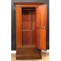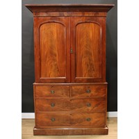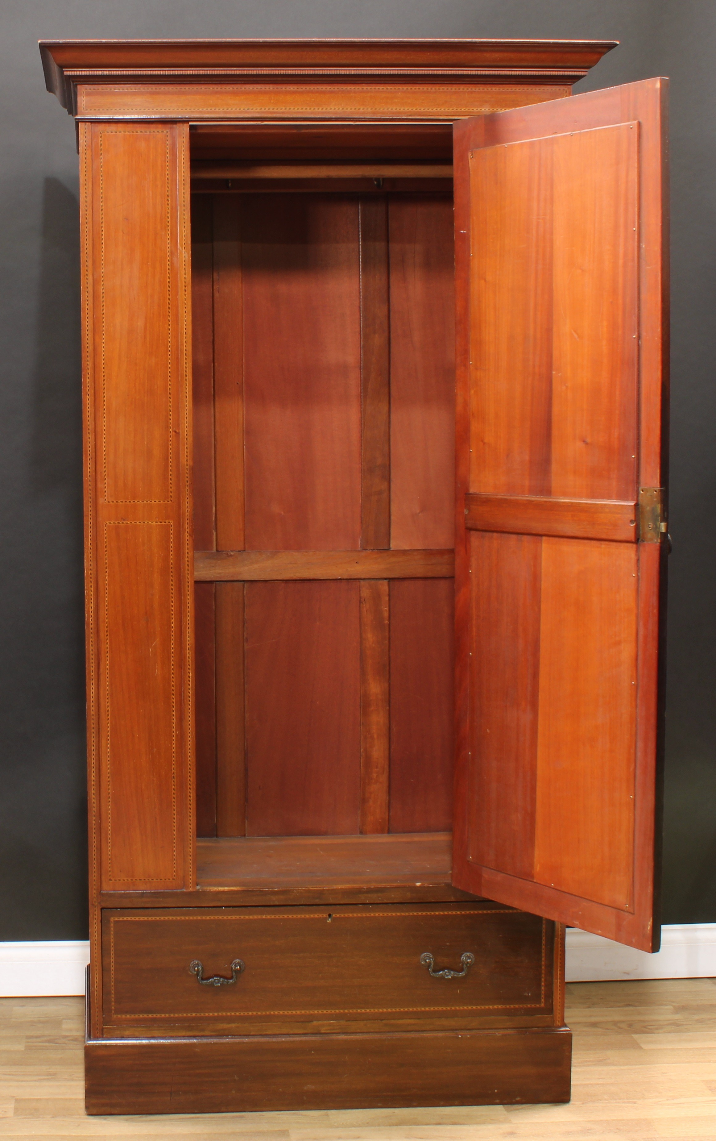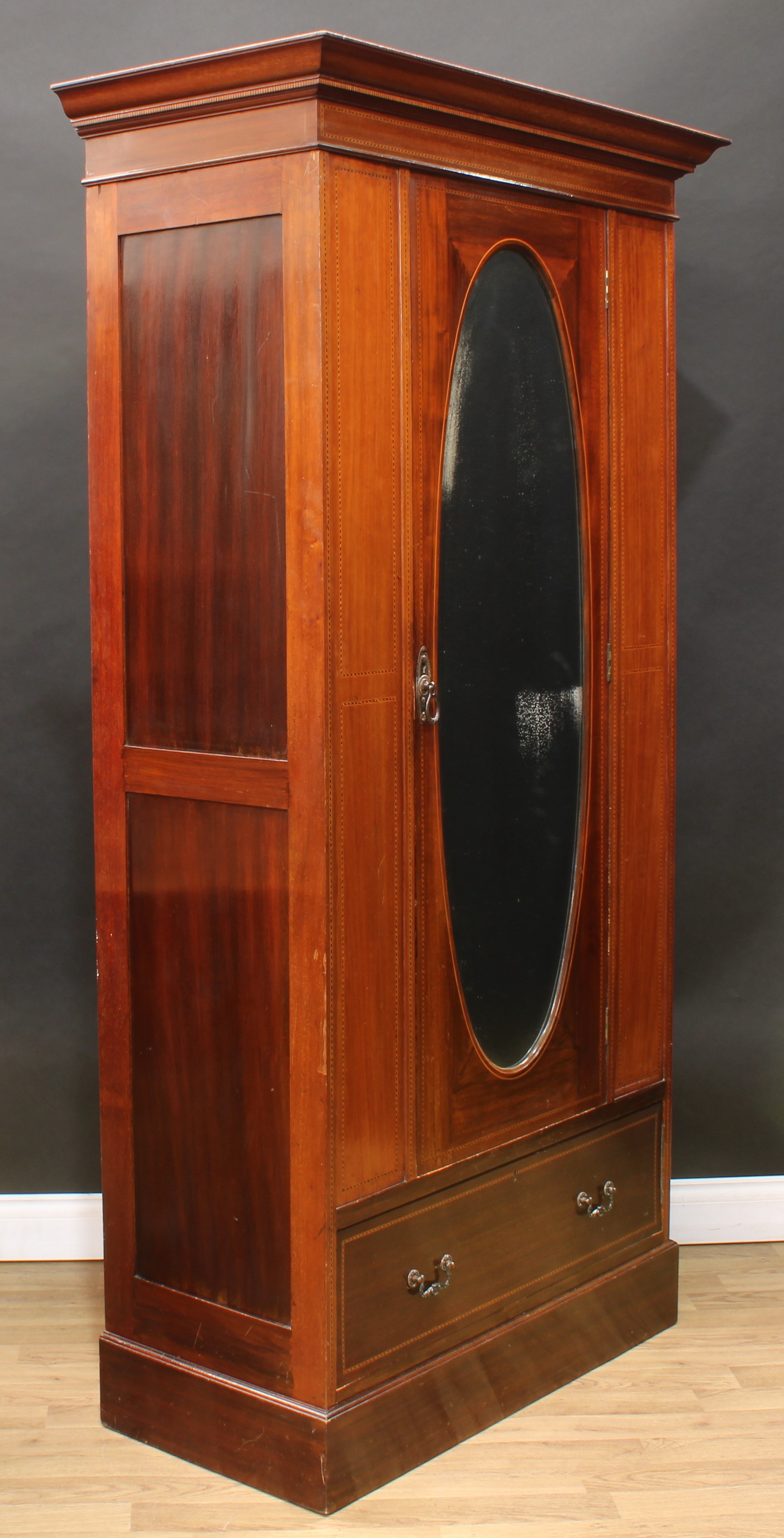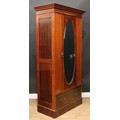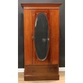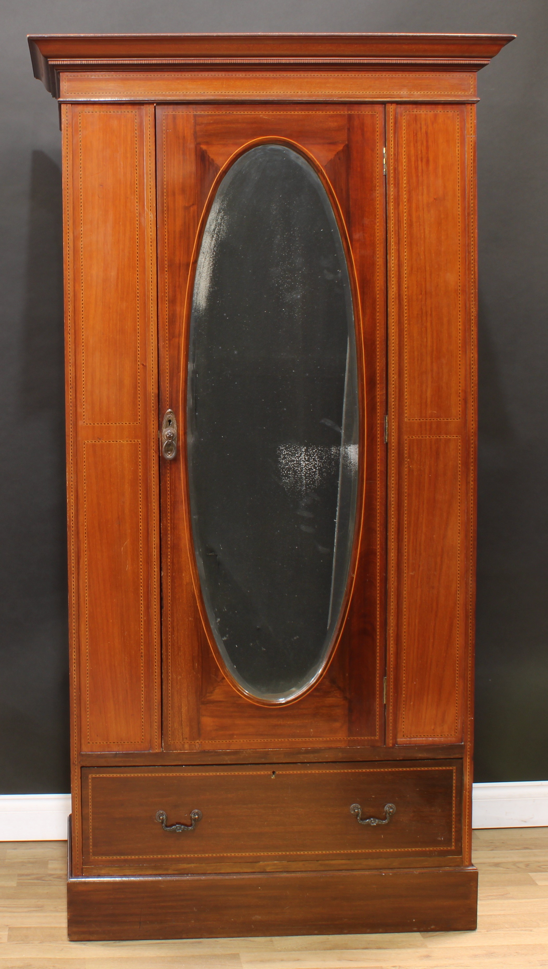 An Edwardian mahogany wardrobe, outswept cornice with faux-dentil parquetry apron above an oval bevelled mirror door enclosing a hanging rail and two hooks, the base with a long drawer, outlined throughout with barber-pole stringing, plinth base, 195cm high, 102.5cm wide, 50cm deep