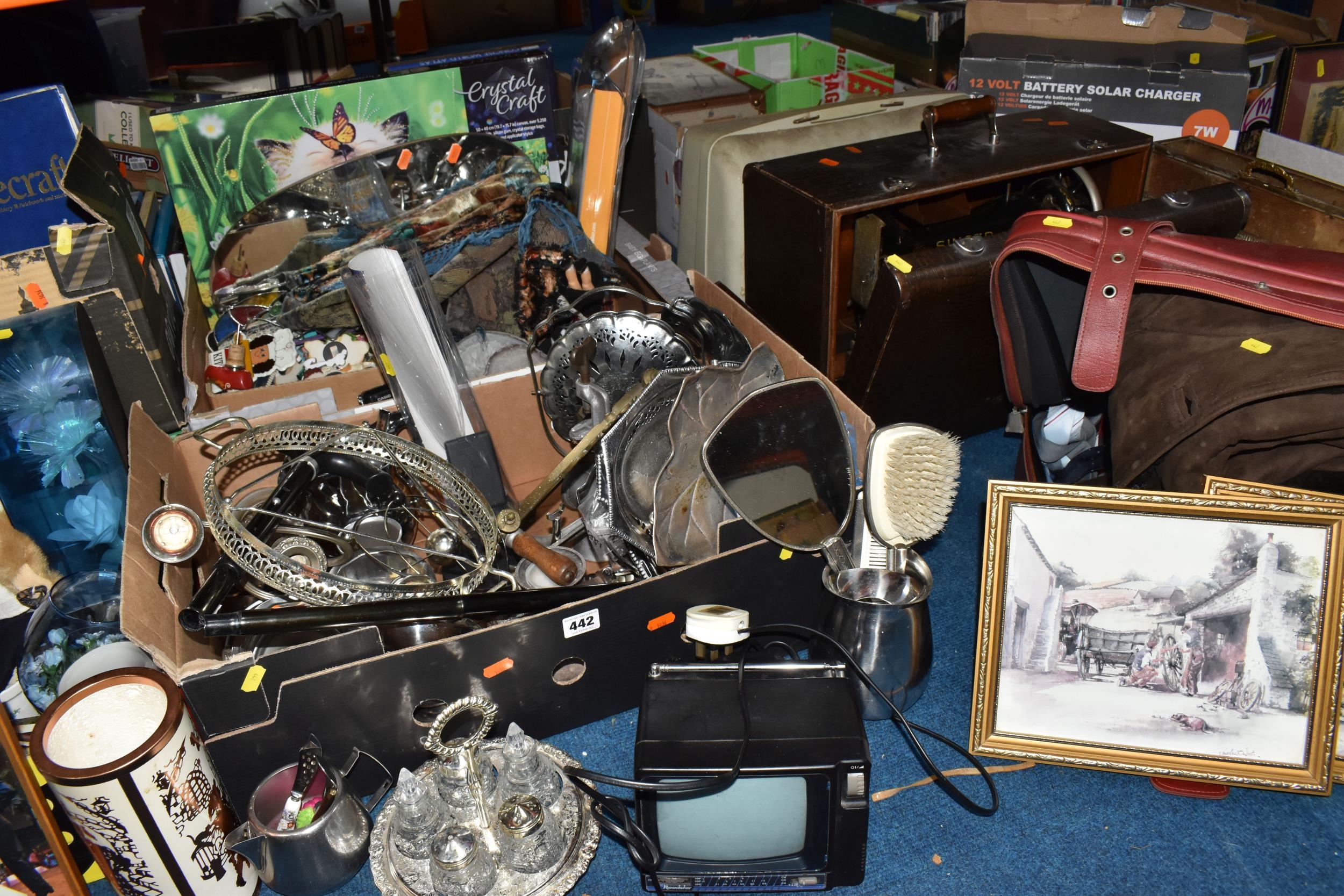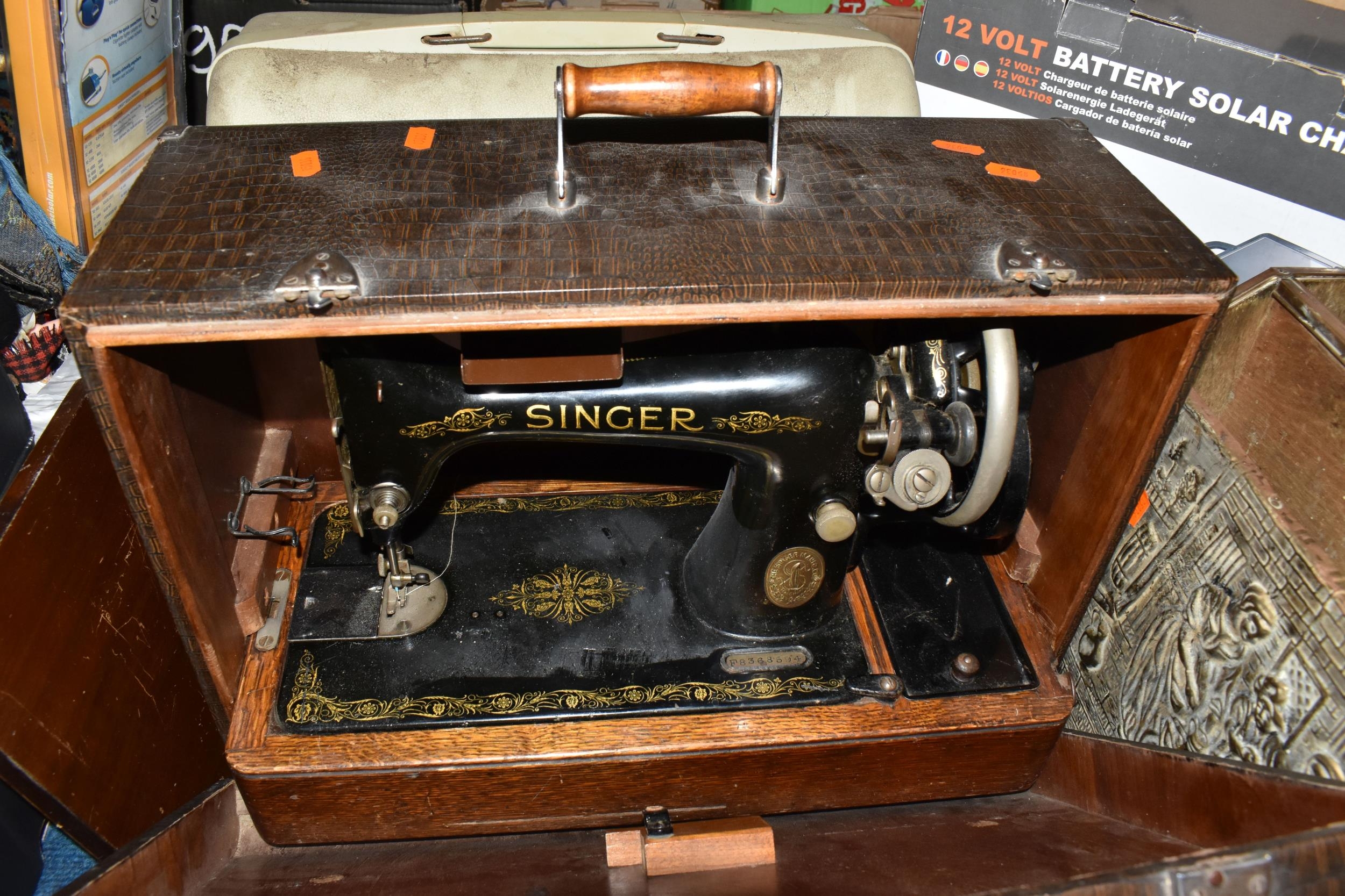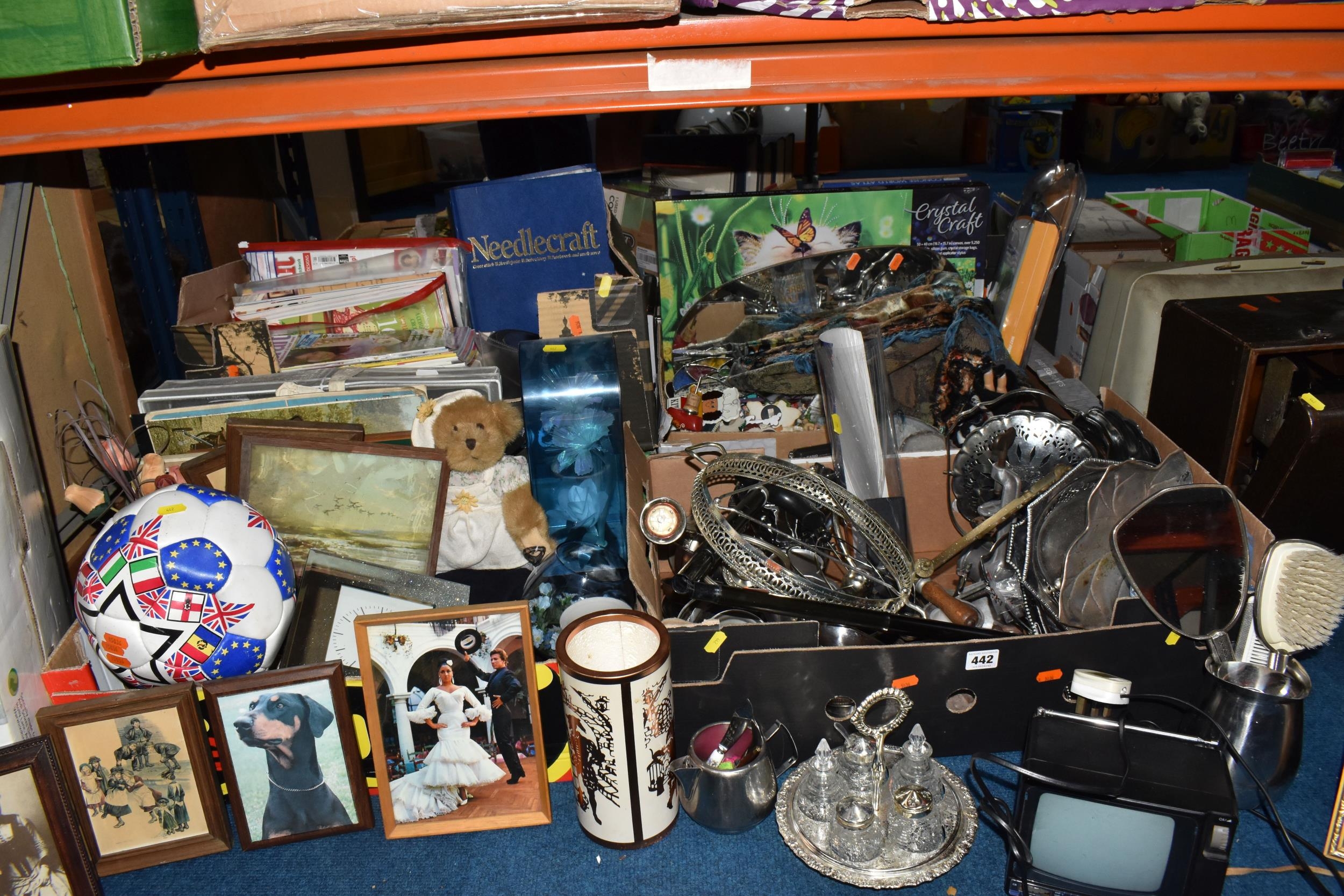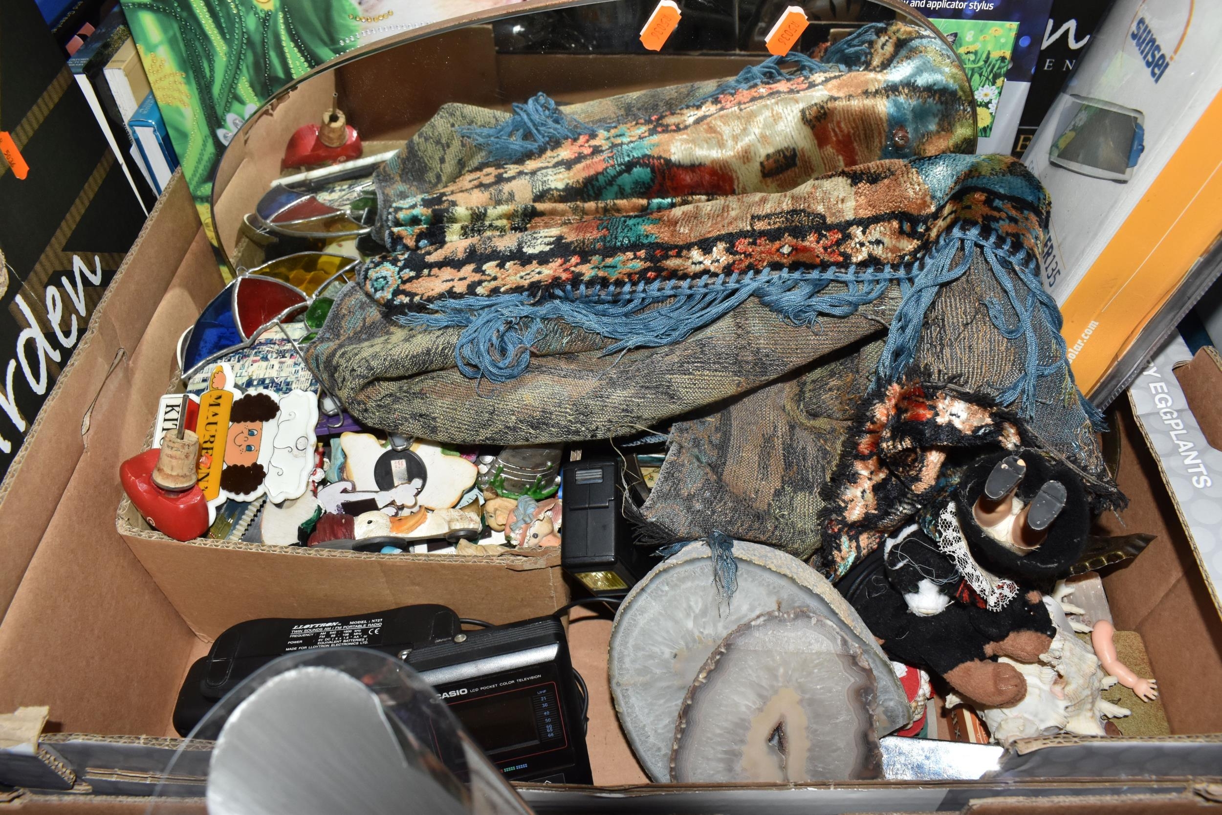 FIVE BOXES AND LOOSE MISCELLANEOUS ITEM, to include various sized pictures some framed some canvas approximately fifteen, a retro egg shaped mirror, over fifty needlecraft magazines, twenty five DVDs subjects include fantasy, romance, comedy etc. box of various fridge magnets over one hundred, portable Casio TV-400 pocket colour TV, solar charger 135 still packaged, natural stone sliced rock, two brown sheepskin coats, selection of ties, a vintage singer sewing machine in wooden case F8368594, a box of mixed metalware included candelabra, dessert bowls, trays, cruet set etc., a large oval roasting pot etc. (sd), (5 boxes + loose)